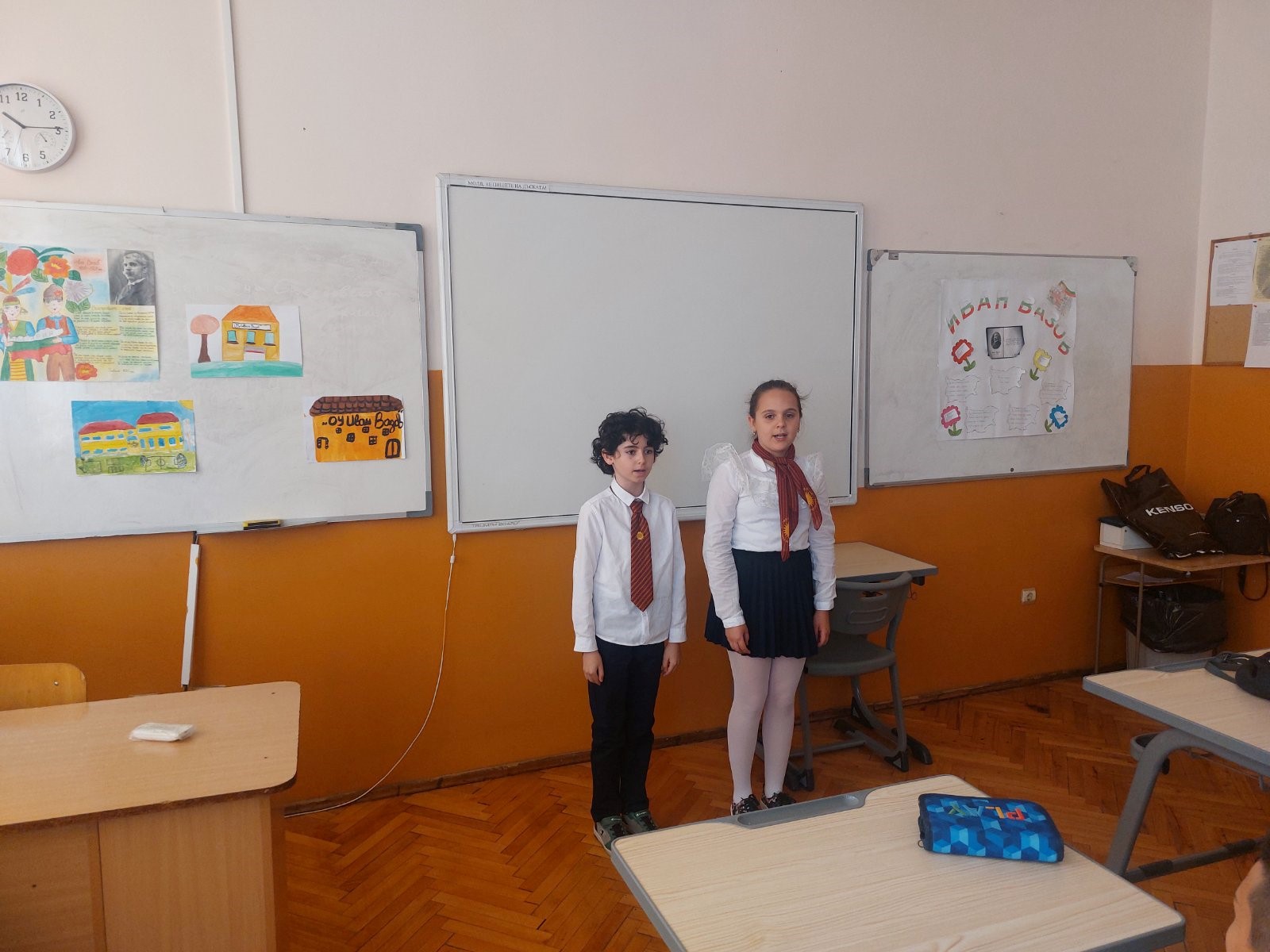 Във връзка с патронния празник на ОУ “Ив.Вазов” гр.Г.Оряховица учениците от 3А клас с класен ръководител г-жа Л.Минчева и 7 А клас с класен ръководител г-н Ю.Ангелов проведоха съвместна инициатива „Аз рецитирам и опознавам Вазов”. Децата от 3 А клас рецитираха стихотворения на народния поет, а Виктория Иванова от горния курс представи „Родът на Вазовите” с презентация изработена от Цвета Иванова и Кристиян Ефтимов. Вазовият час по родолюбие завърши с „Аз съм българче” рецитирано от всички. Накрая имаше малка почерпка.