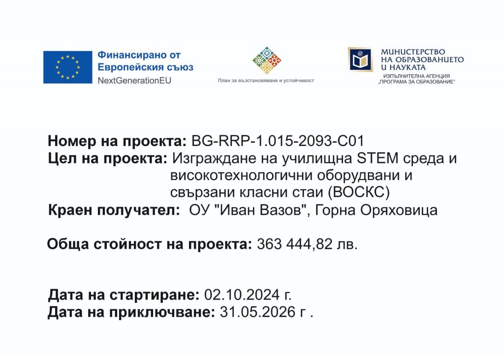 Изграждане на училищна STEM среда и високотехнологични оборудвани и свързани класни стаи (ВОСКС).