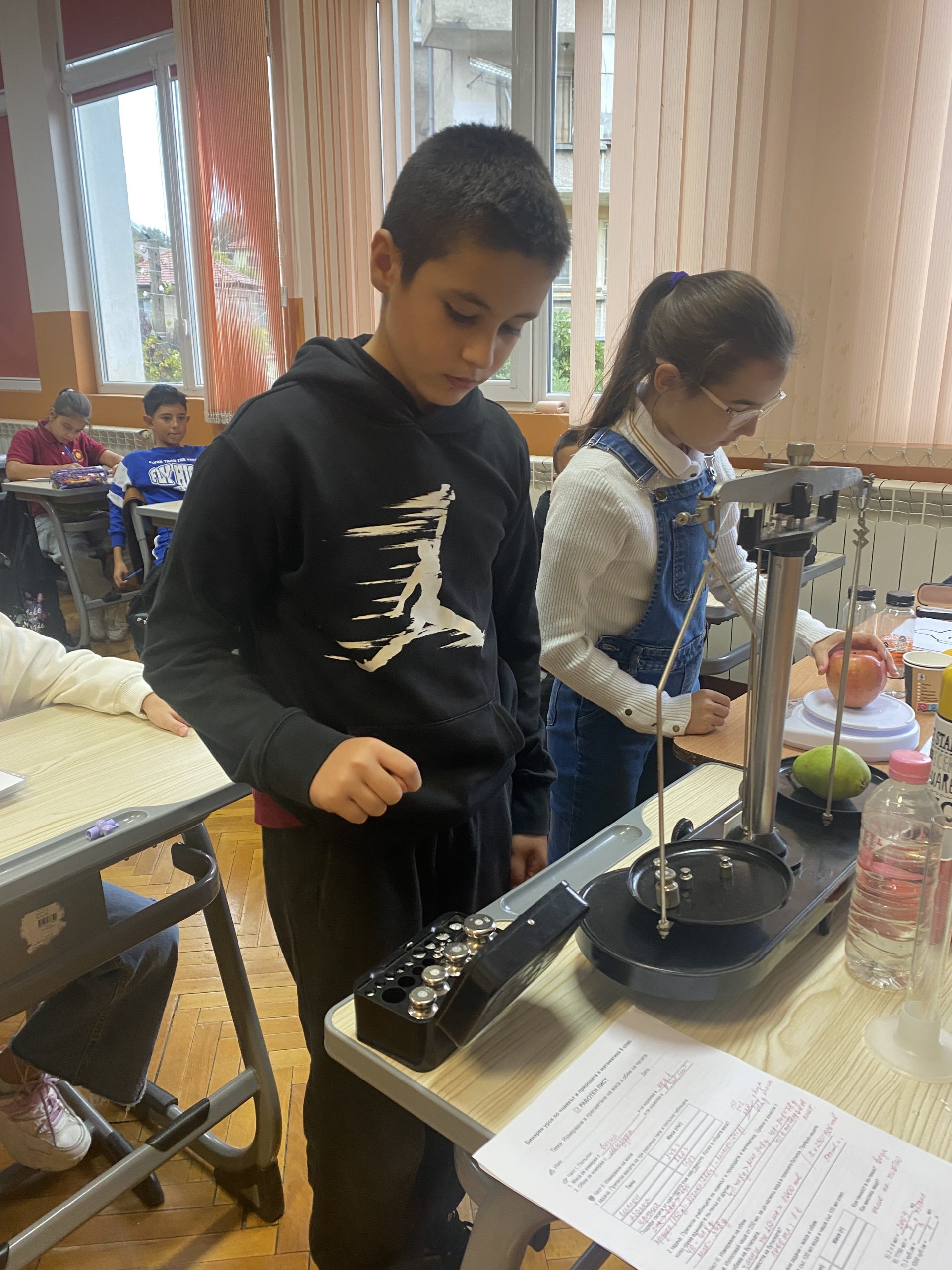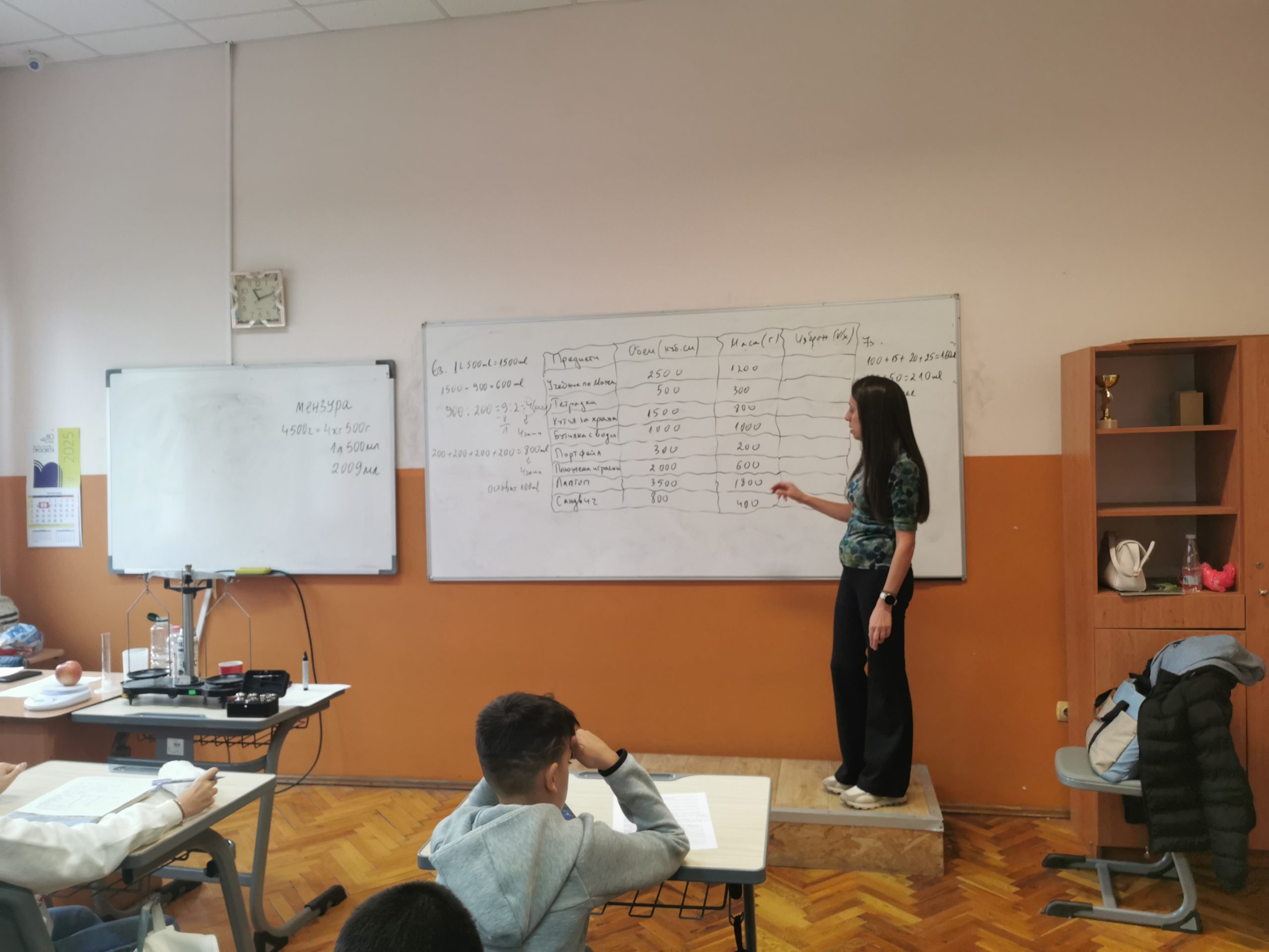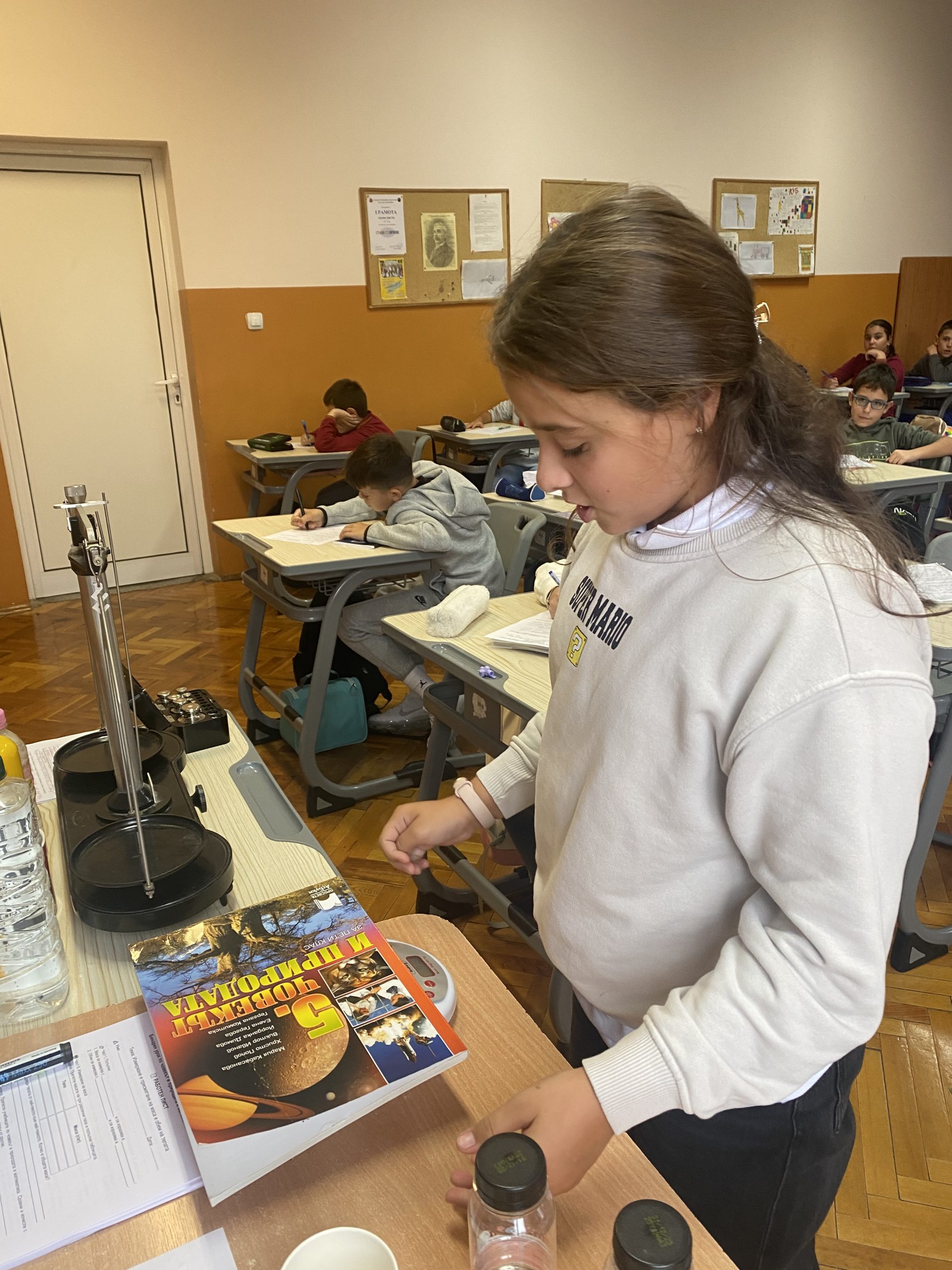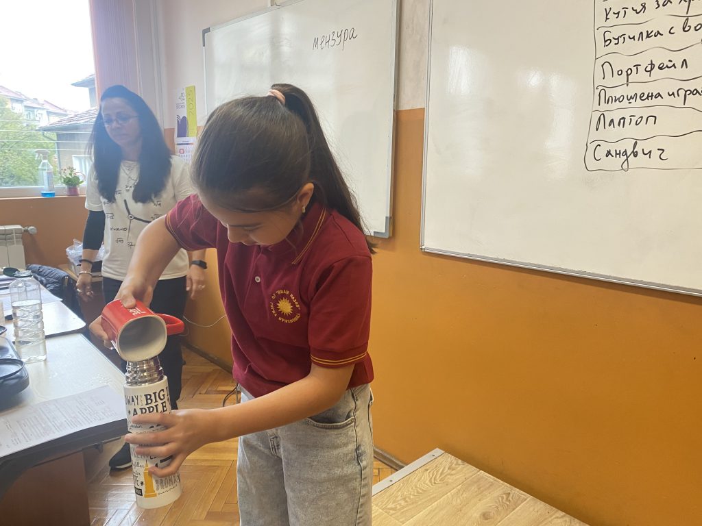 Поставени в ролята на учени, петокласниците измерваха масата на твърди тела и течности с везна, сравняваха и обобщаваха резултатите. За определяне на обема на телата и вместимостта на различни съдове извършиха различни експерименти.