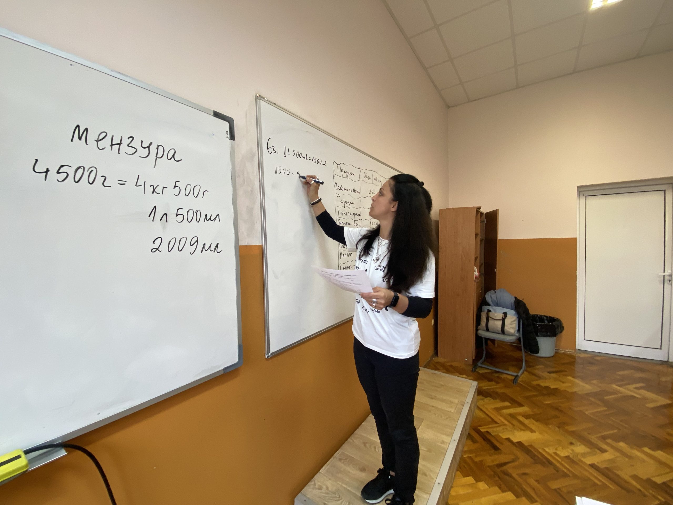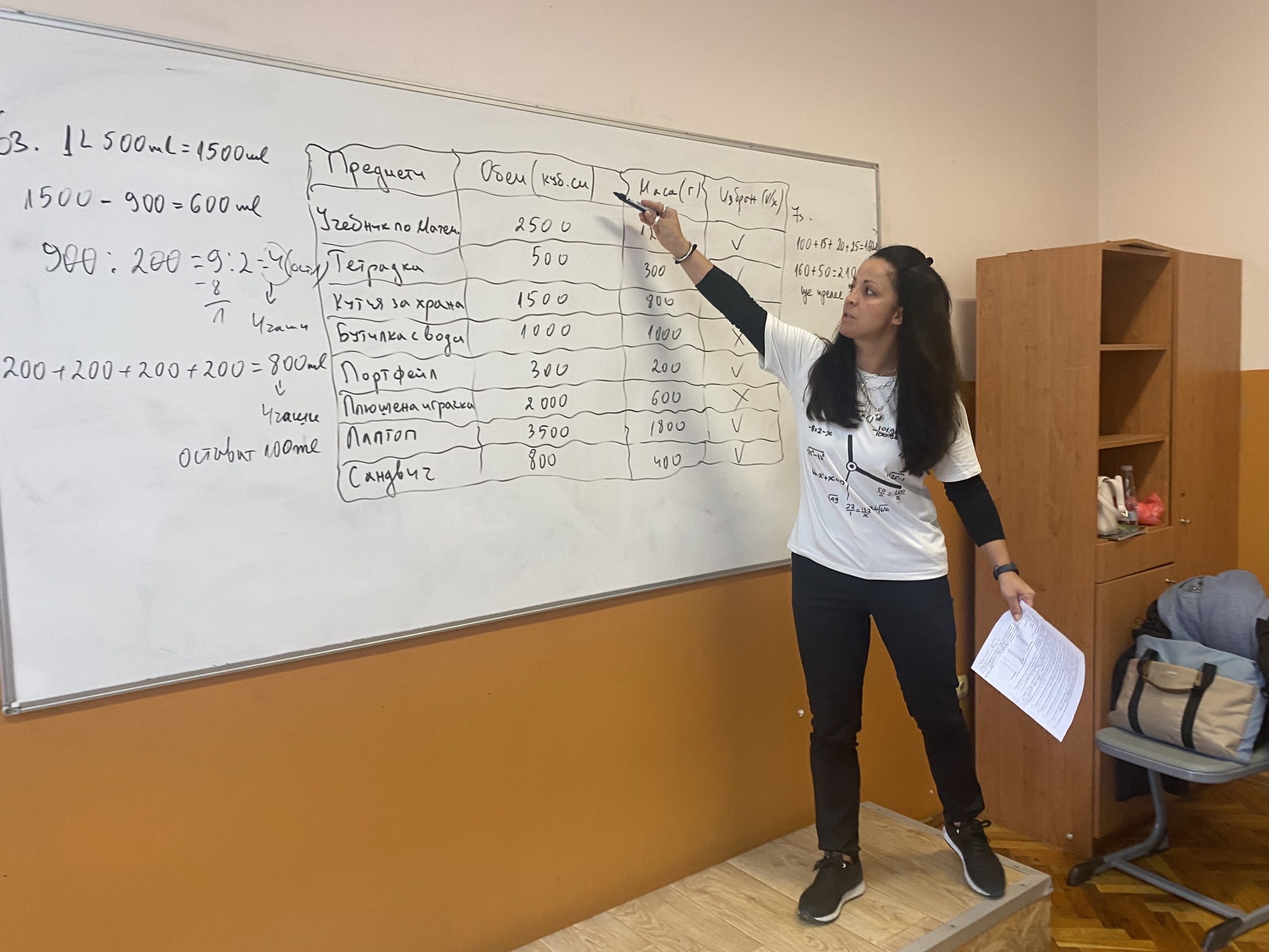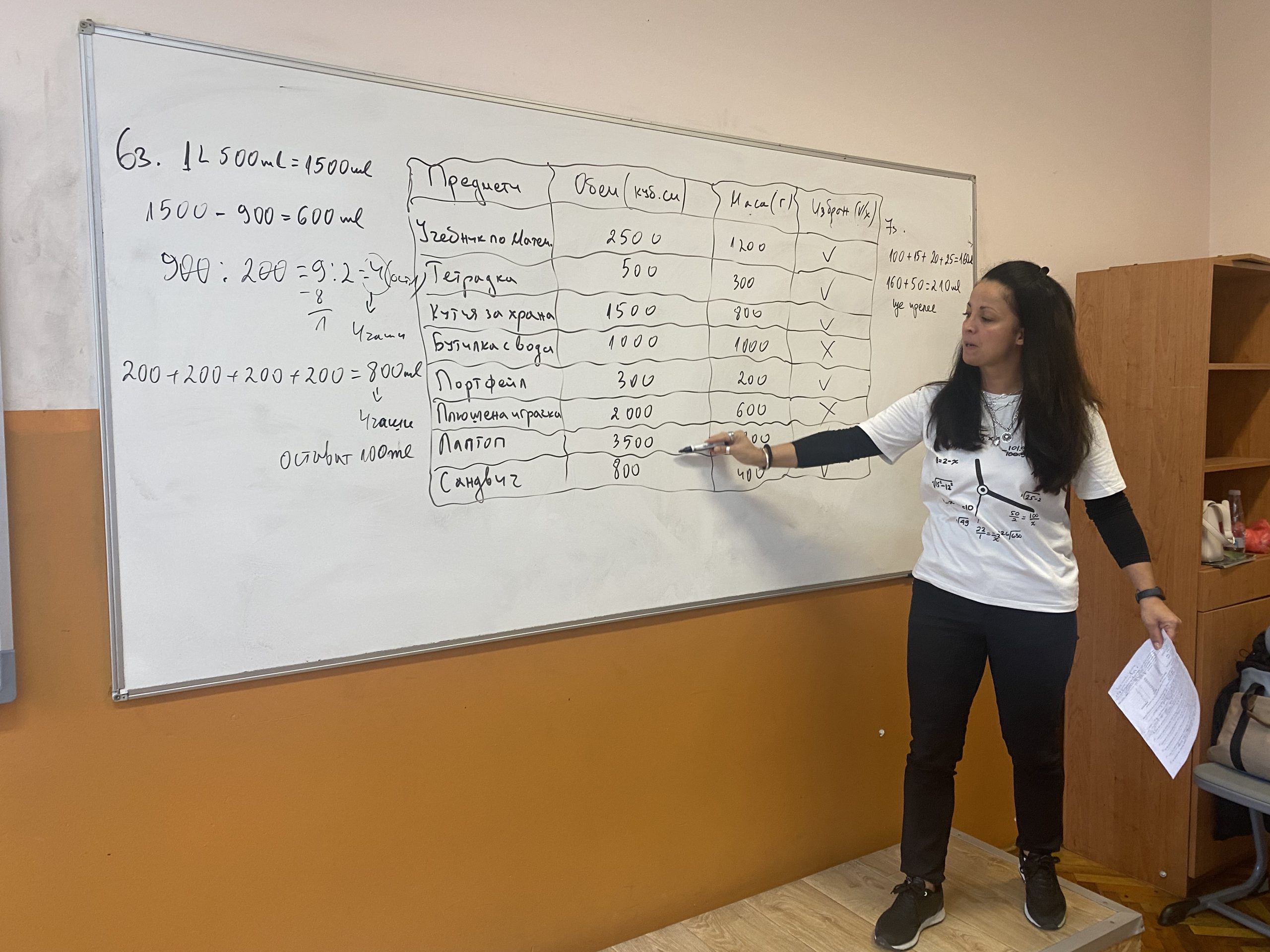 В математическата част на урока учениците използваха знанията си за преобразуване на мерни единици. Чрез точни изчисления те пресмятаха различни задачи. Най-забавна и практически полезна за тях бе задачата, в която трябваше да подредят в своята ученическа раница предмети, така че да не надвишават определен обем и маса. Упражнявайки логическо мислене, точно пресмятане и планиране, всеки петокласник избра нужните за училище предмети, без да препълни и направи прекален тежка своята раница.