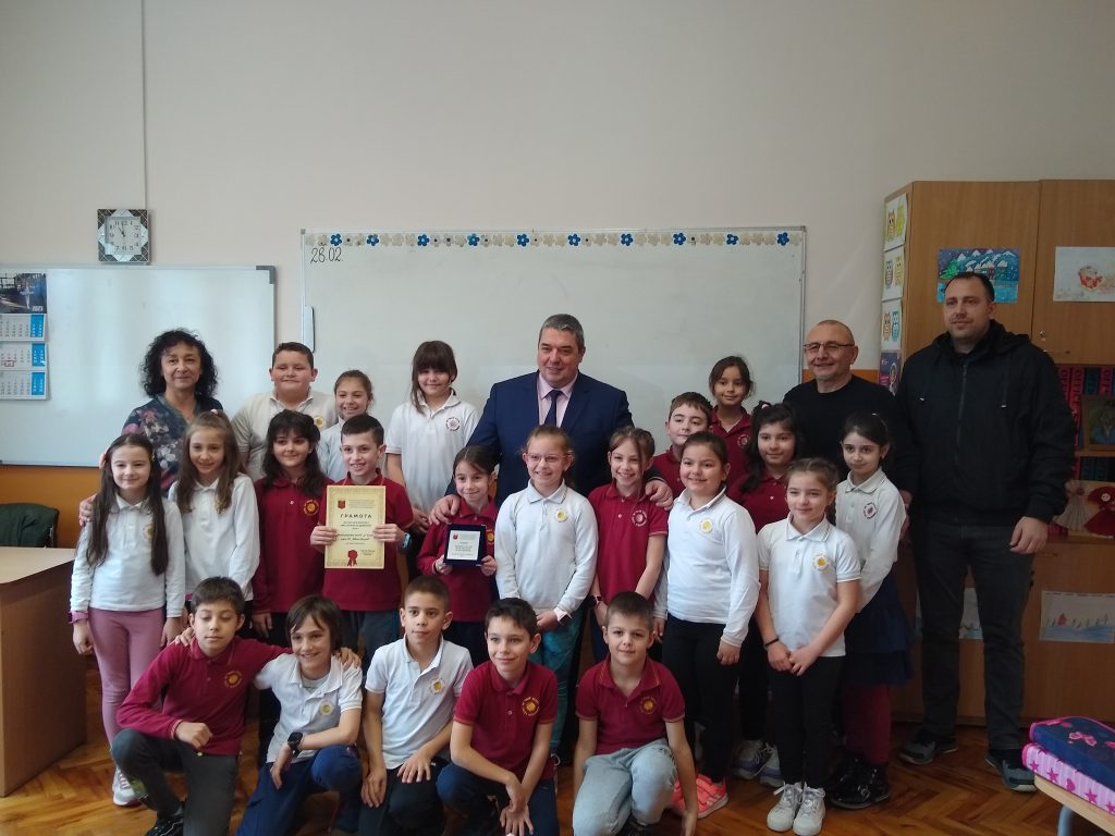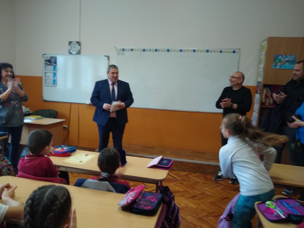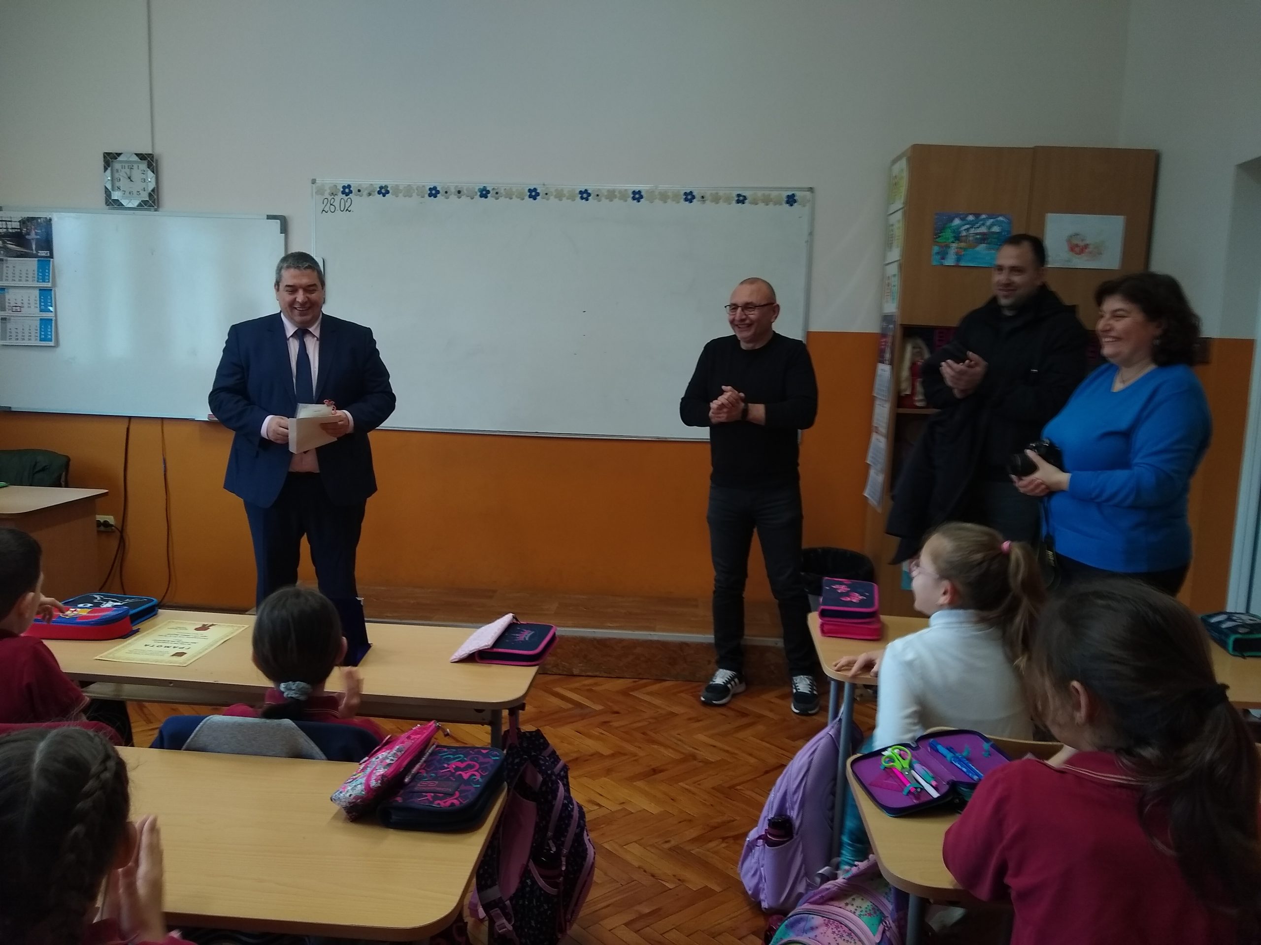 Инж. Добрев и Владимир Врангов посетиха ОУ „Иван Вазов“.хЗа добрите си дела бяха отличени учениците от II „a” клас с класен ръководител Лидия Минчева. Вместо цвете, за първия учебен ден те сбират средства и книжки, които даряват на отделението по педиатрия в МБАЛ „Св. Иван Рилски“.