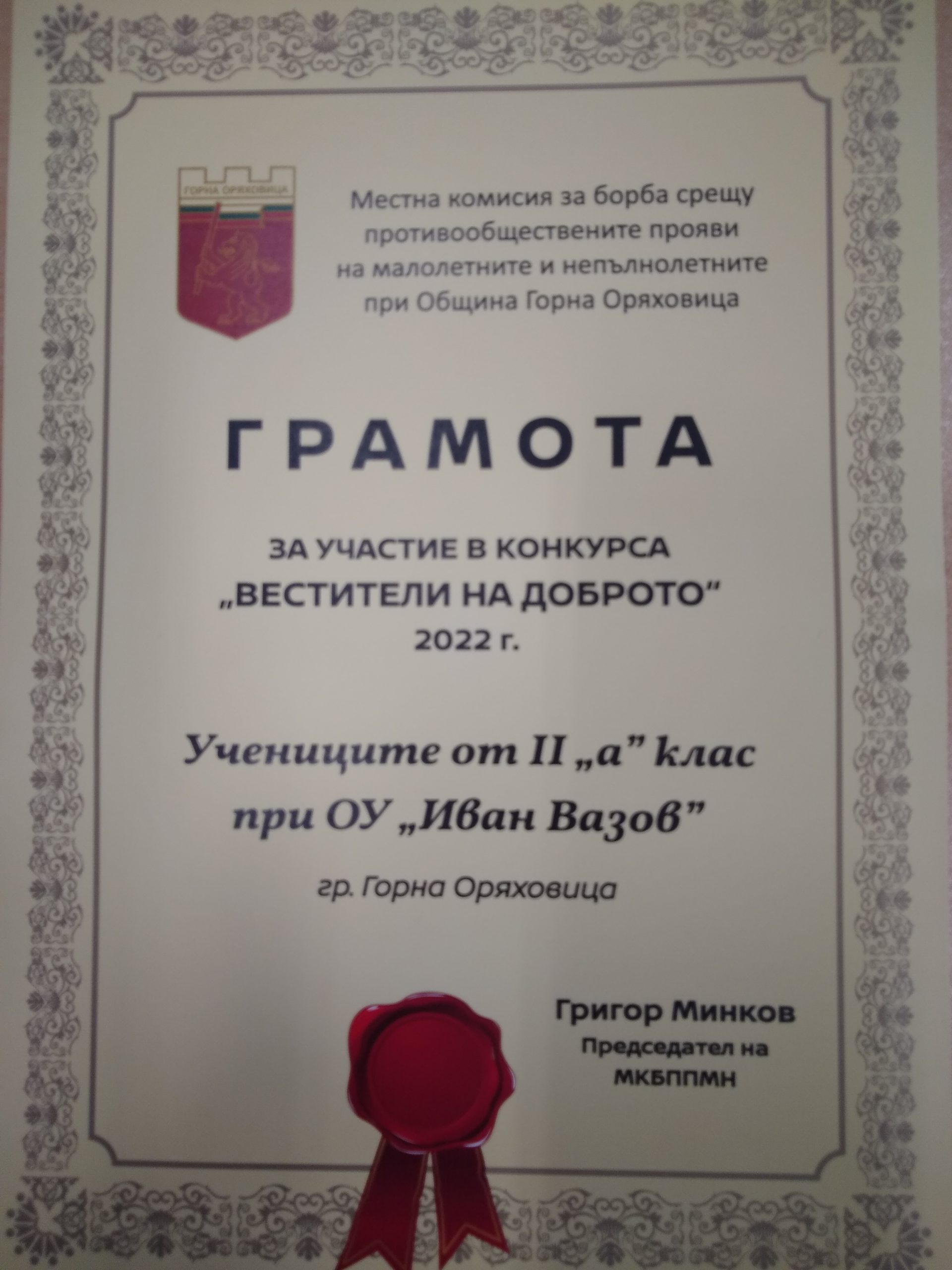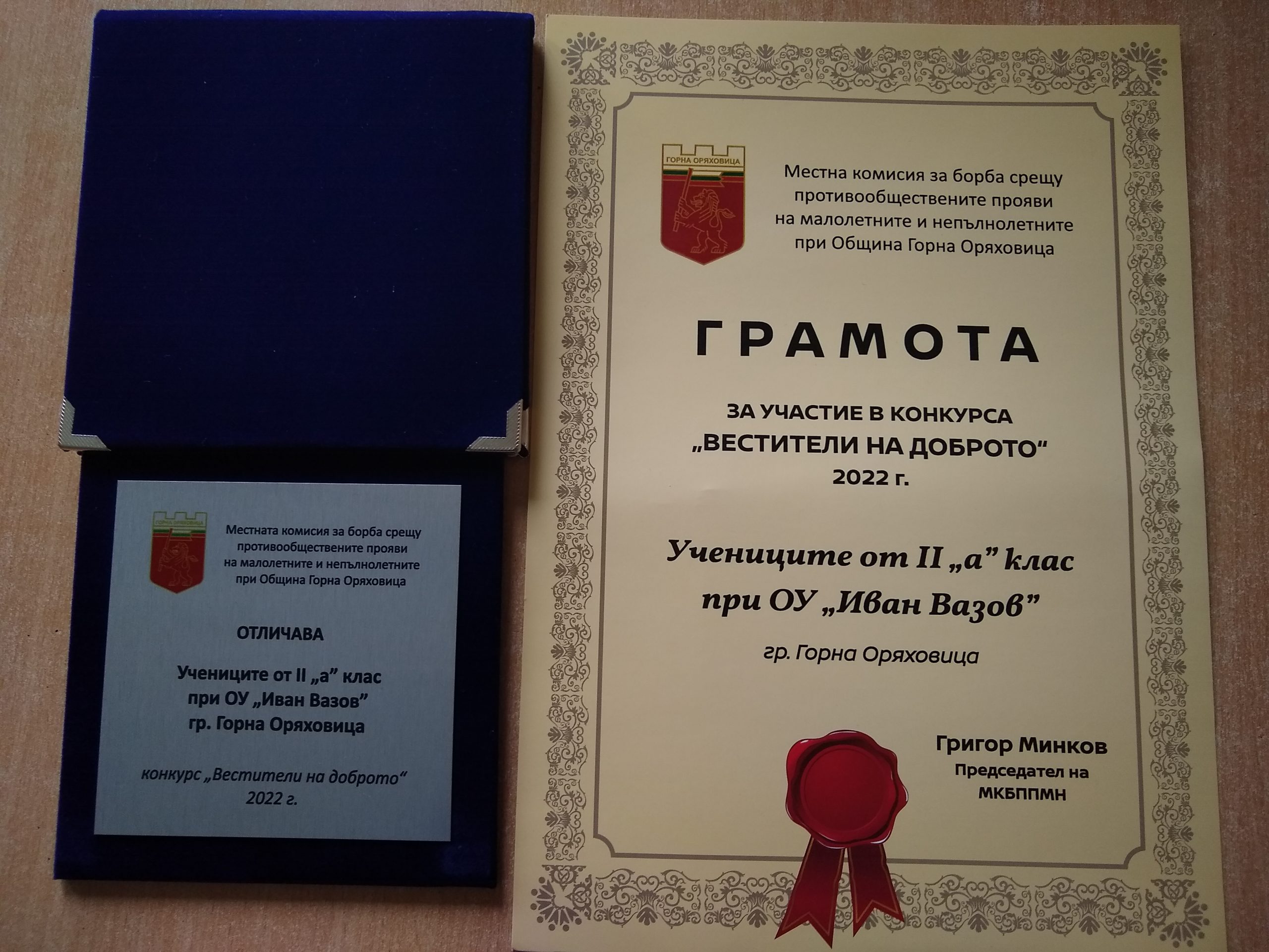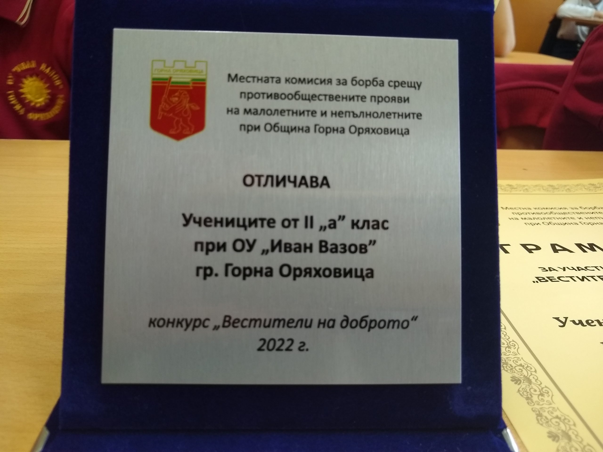 Ученици от училища в Горна Оряховица, извършили добри дела през 2022 г.,  бяха отличени с плакети и грамоти. Наградите „Вестители на доброто“ се присъждат ежегодно от Местната комисия за борба с противообществените прояви на малолетни и непълнолетни (МКБППМН), в рамките на инициативата „Вестители на доброто“. Отличията на добротворците бяха връчени от кмета инж. Добромир Добрев, който заедно със секретаря на комисията Владимир Врангов отидоха на място в училищата.