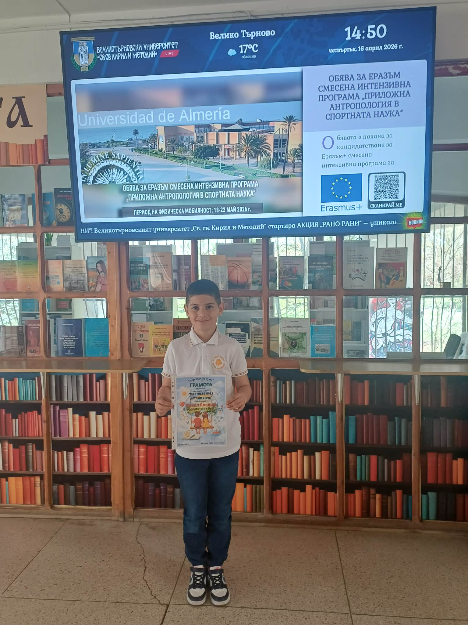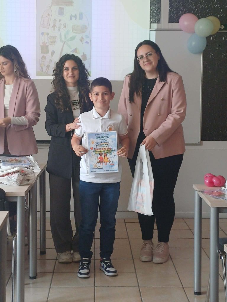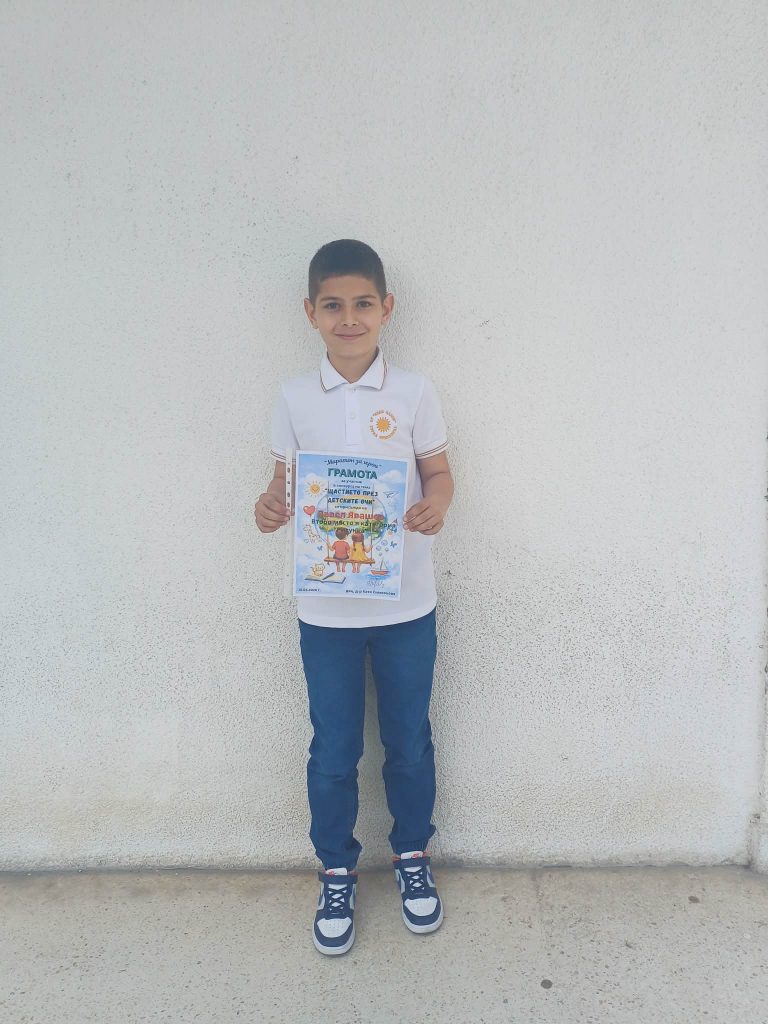 От общо 110 творби в три категории – „Рисунка“, “ Текст“ и „Ръчно изработено изделие“, ученикът Павел Тодоров Явашев от 3. Б клас е на второ място в категория „Рисунка“. Ученикът участва с творба, в която през своите преживявания и емоции, изразява какво е за него детското щастие. Павел присъства лично на връчването на наградите в град Велико Търново, зала БИЦ на корпус 5 във Великотърновския университет. Честито на Павел! Училището се гордее с постижението му!