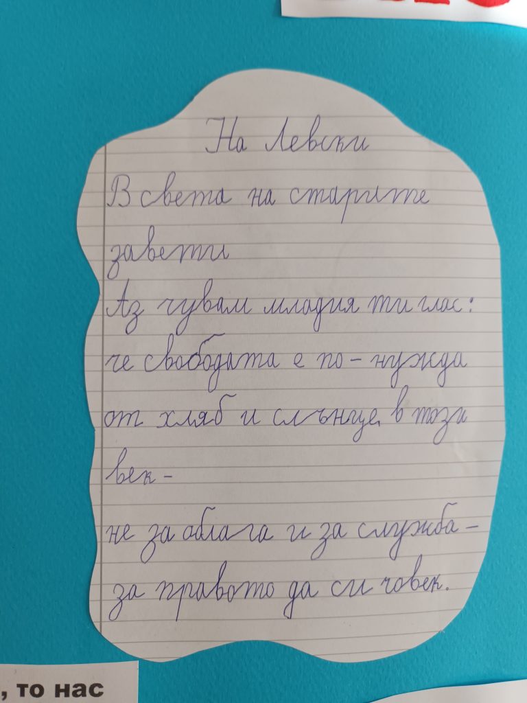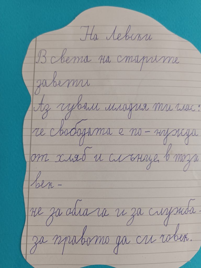 „За дългия път към свободата“- под това заглавие учениците от 1“б“клас, отбелязаха годишнината от гибелта на Васил Левски. Първокласниците четоха стихове, преписваха мисли за Апостола и нарисуваха негови портрети.