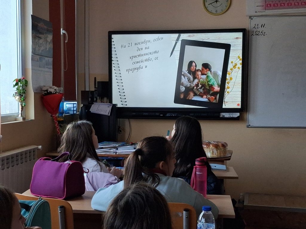Семейството е място, където всеки се чувства обичан и значим. То е мост от миналото към настоящето. В този празничен ден наш гост беше г-жа Момчева – баба на Божидара Момчева . Тя разказа на учениците историята за появата на празника, за традициите, предавани от поколение на поколение. С много вълнение сподели свои лични спомени. Децата я поздравиха със свои любими песни. По традиция се почерпихме с вкусна погача.