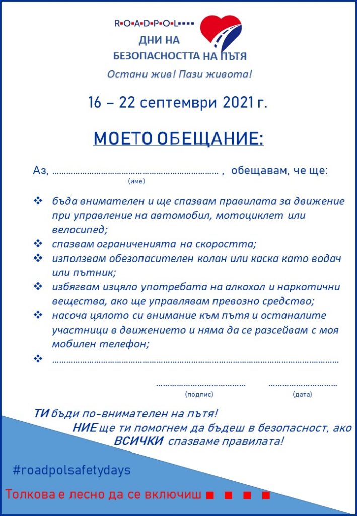 Представители на ученическия съвет към училището отправиха призиви за безопасно поведение на пътя, използването на светли дрехи и светлоотразителни материали и поставиха на видно място плакат с логото и посланието на инициативата „Лесно е да спасиш живот! Просто спазвай правилата!“. Учениците подготвиха призив към своите родители -водачи на МПС, да станат посланици на инициативата, като подпишат „Обещание за спазване на правилата за движение по пътищата“