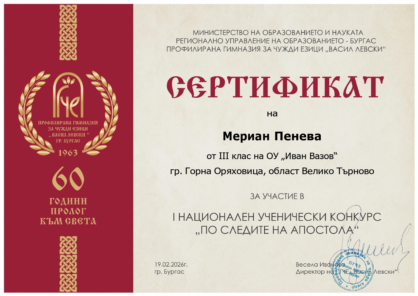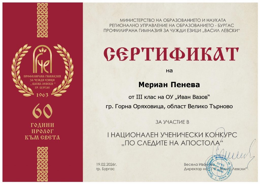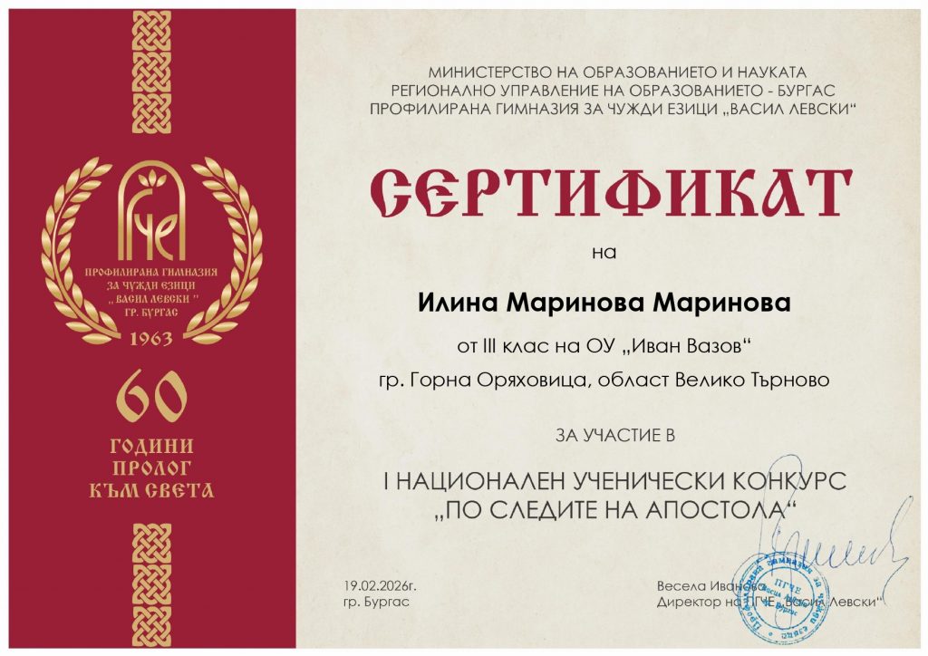 Възпитаници на ОУ „Иван Вазов“, гр. Горна Оряховица, взеха участие в I Национален ученически конкурс „По следите на Апостола“. Събитието, организирано от Профилирана гимназия за чужди езици „Васил Левски“ – гр. Бургас, бе посветено на паметта на Васил Левски и се проведе на 19 февруари 2026 г..