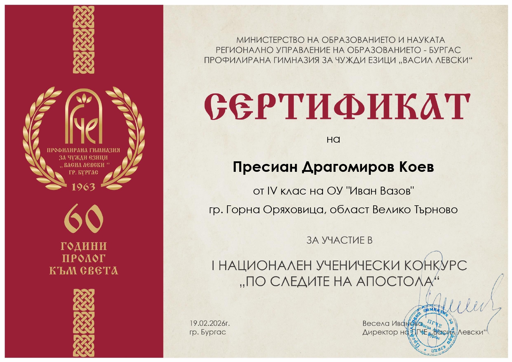 - Пресиан Драгомиров Коев – ученик от IV клас;