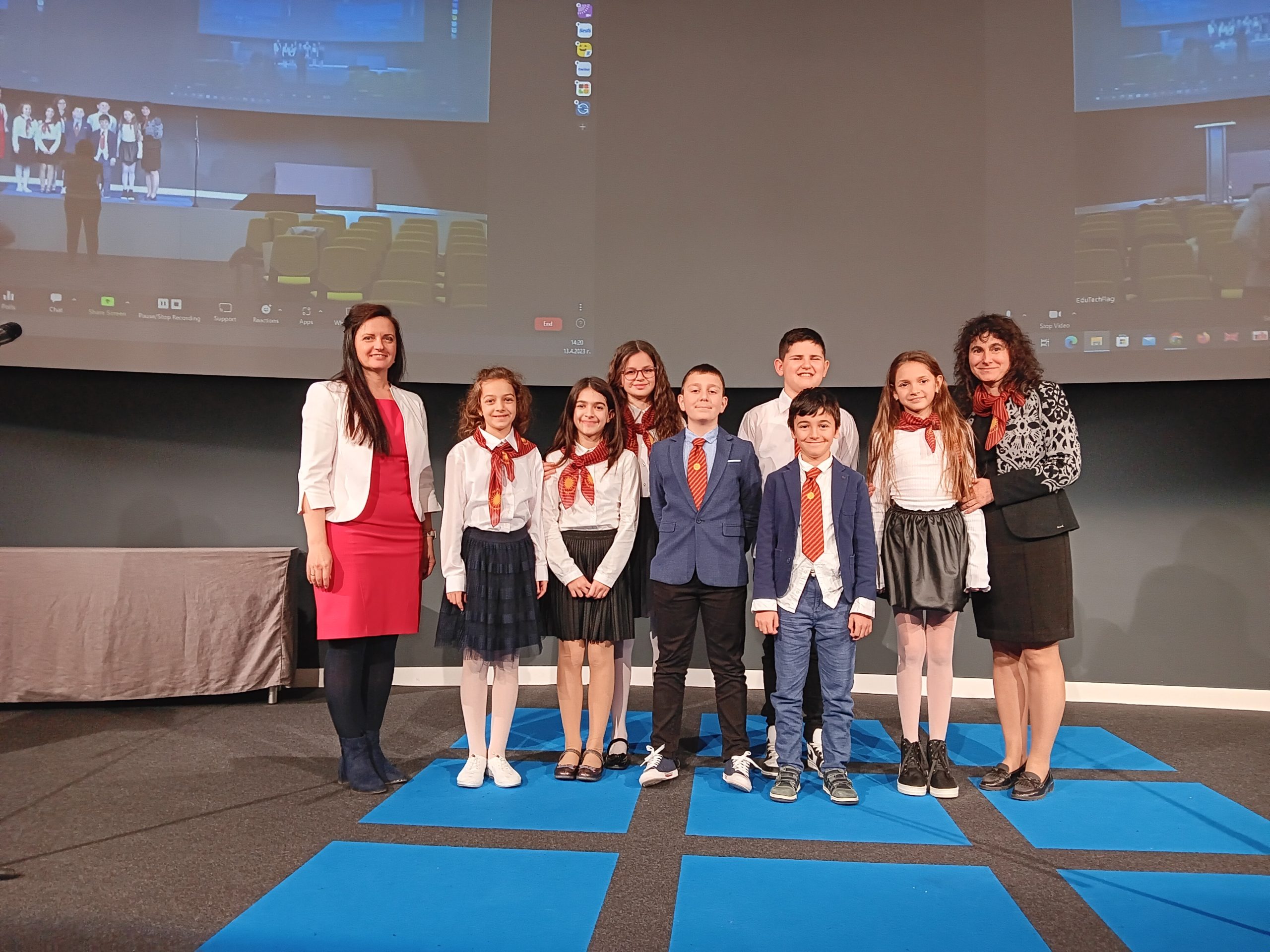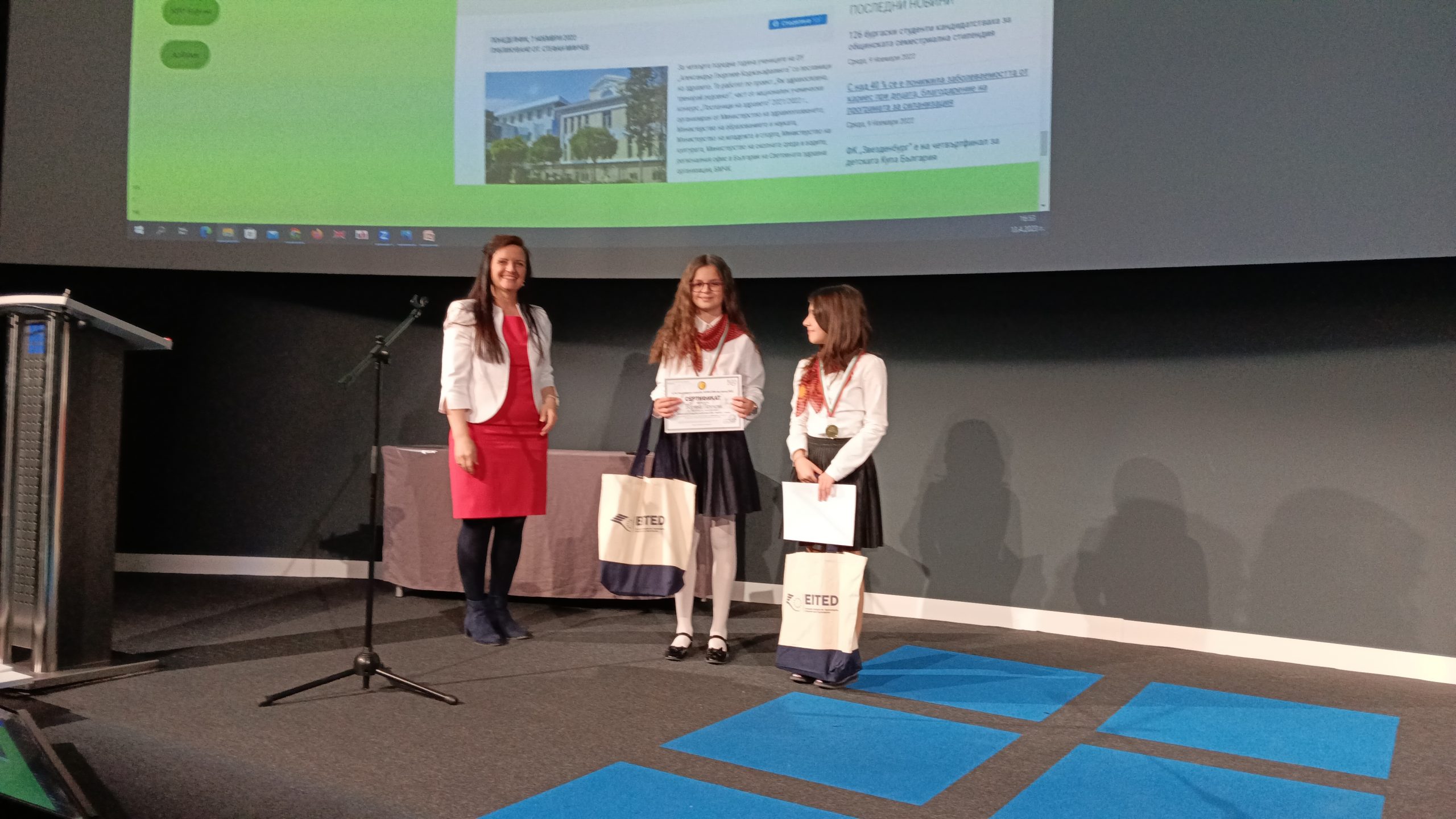 Голямата награда на конкурса за националните победители от ОУ „Иван Вазов“ – Горна Оряховица е да представят своите проекти на Националната конференция „STEM Образование и иновации“, секция STEM ученически проекти, която се провежда от 13 -15 април 2023 г. Малките момичета успяха достойно да защитят името на своето училище, показвайки своите презентационни умения от сцената пред десетки участници в залата на Интер Експо Център, София. Сертификати, златни медали и книга с публикация на проекта им бяха връчени от д-р Милена Крумова – Европейски институт за технологии, образование и дигитализация (EITED) и EduTechFlag, София.