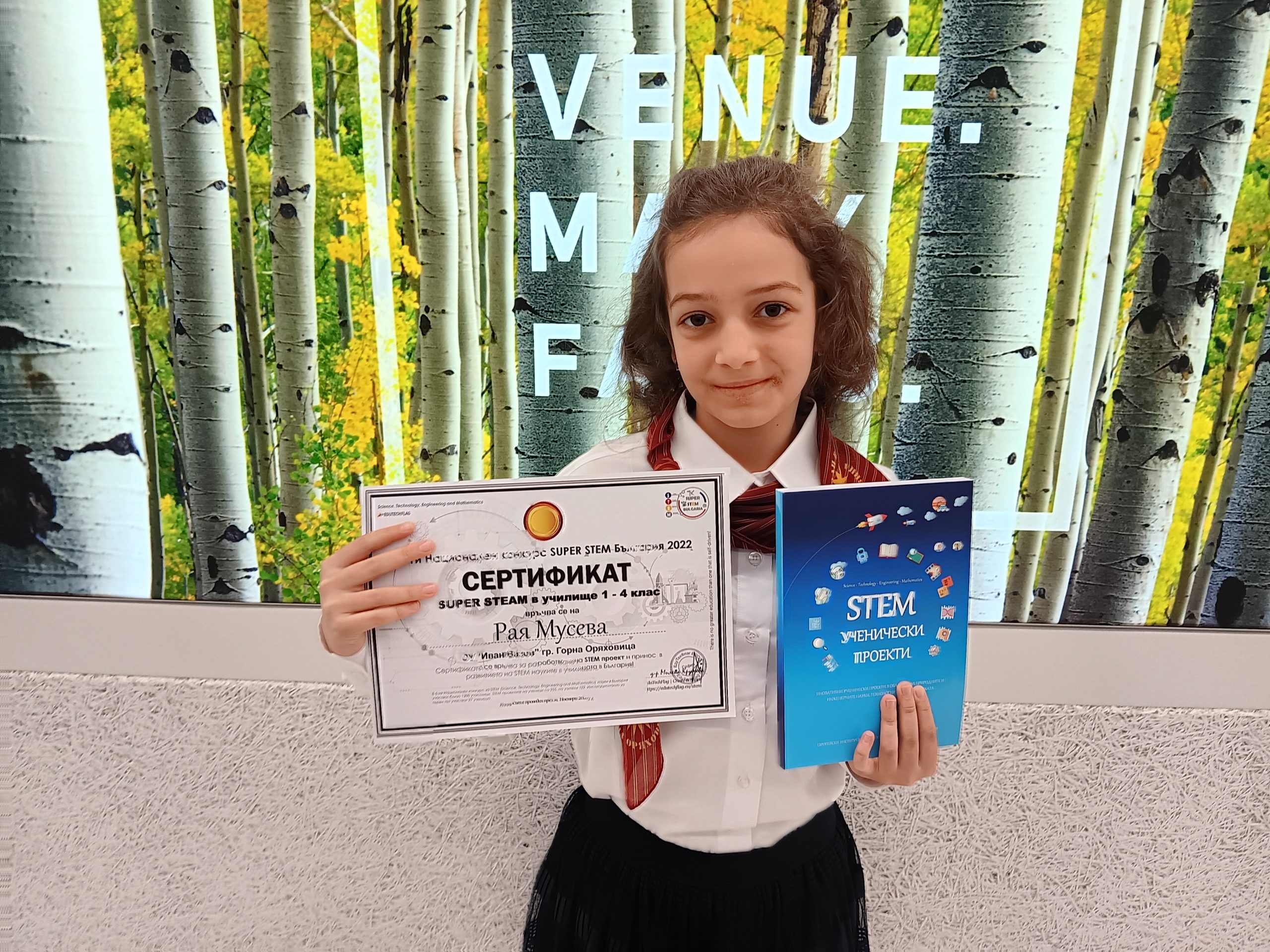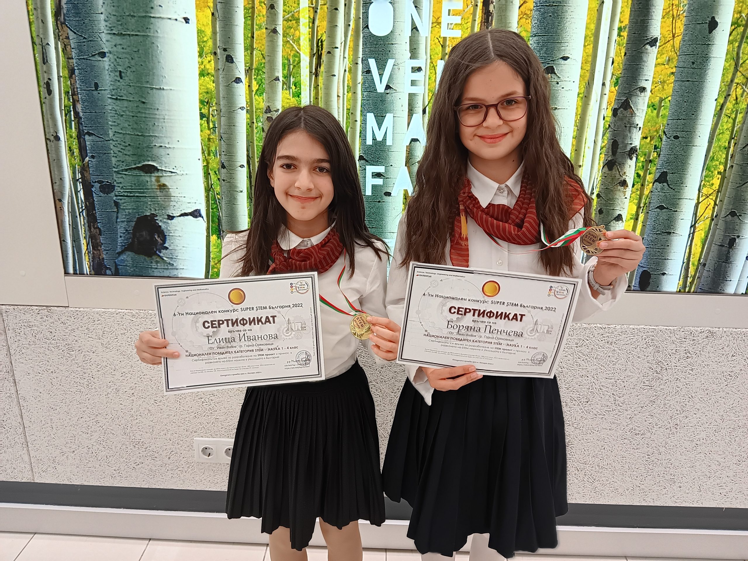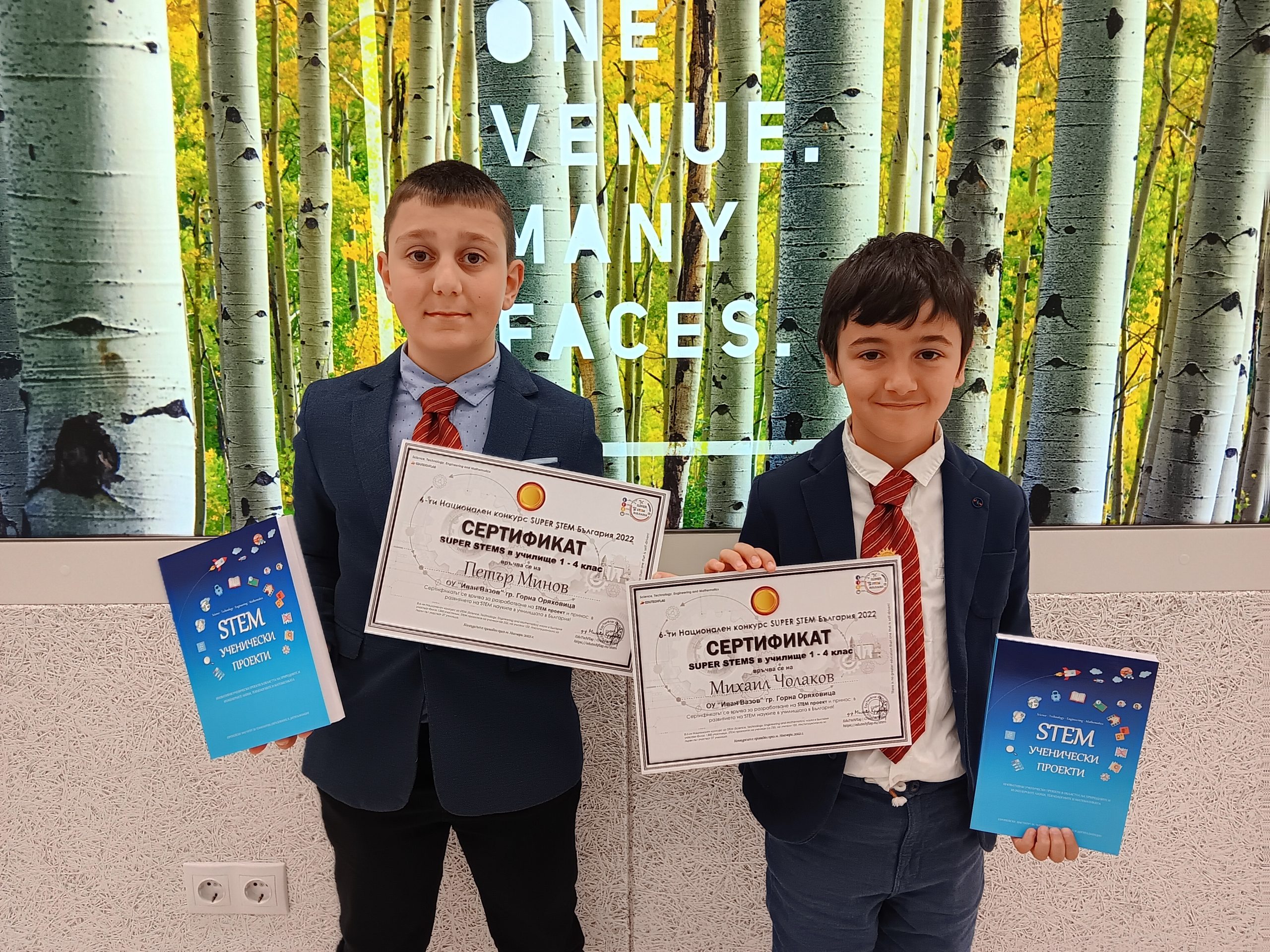 Велики четвъртък сбъдна мечтите на четвъртокласниците от ОУ „Иван Вазов“ – Боряна Пенчева и Елица Иванова, които спечелиха първо място на престижния Национален конкурс за STEM науки в България „SUPER STEM 2022“. Тази година в конкурса взеха участие над 1300 участници. Организацията и провеждането на 6-ия Национален конкурс за STEM науки в България „SUPER STEM 2022“ се осъществи от EduTechFlag с подкрепата на организации-партньори. Целта на конкурса е да се поощрят талантливи ученици от различни възрастови групи в областта на науките STEM в училище, които са инициативни и любопитни да създават идеи, да творят и да експериментират.