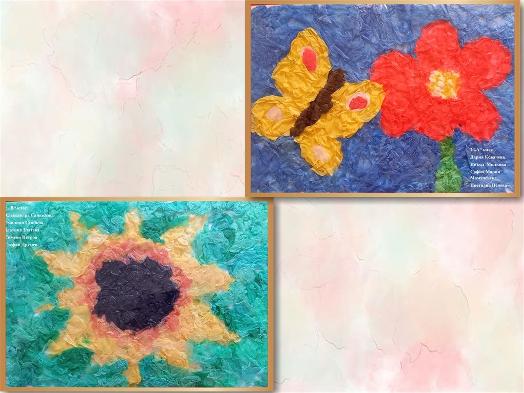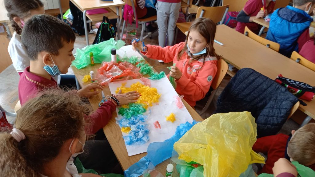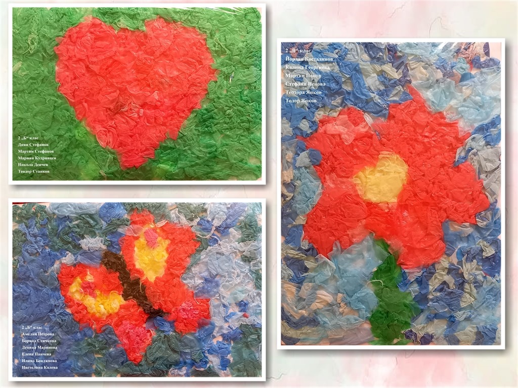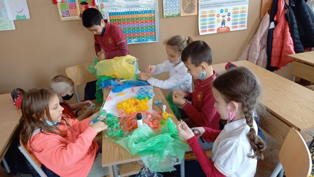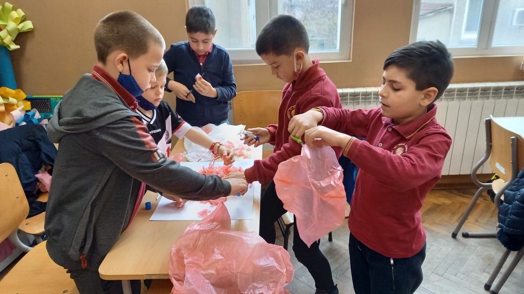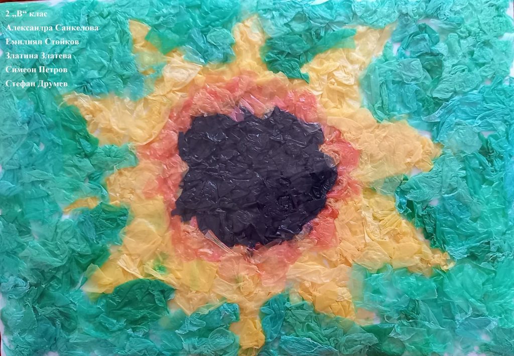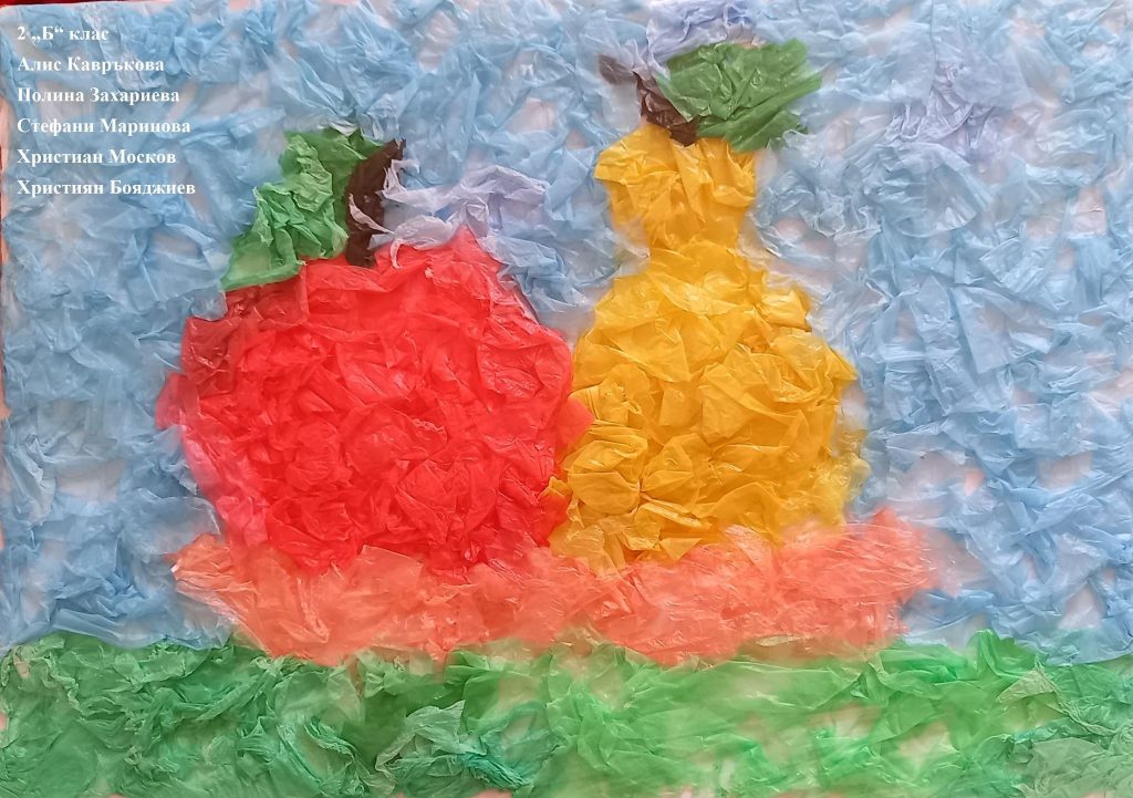 Учениците от 2 а, б, и в класове съвместно заедно с техния преподавател по изобразително изкуство, г-жа Нанкова, изработиха пана от найлонови торбички. В часовете за занимания по интереси изработиха къщи от картон. Вдъхновени от творчеството със отпадъци учениците си направиха модно ревю от рециклирани материали..