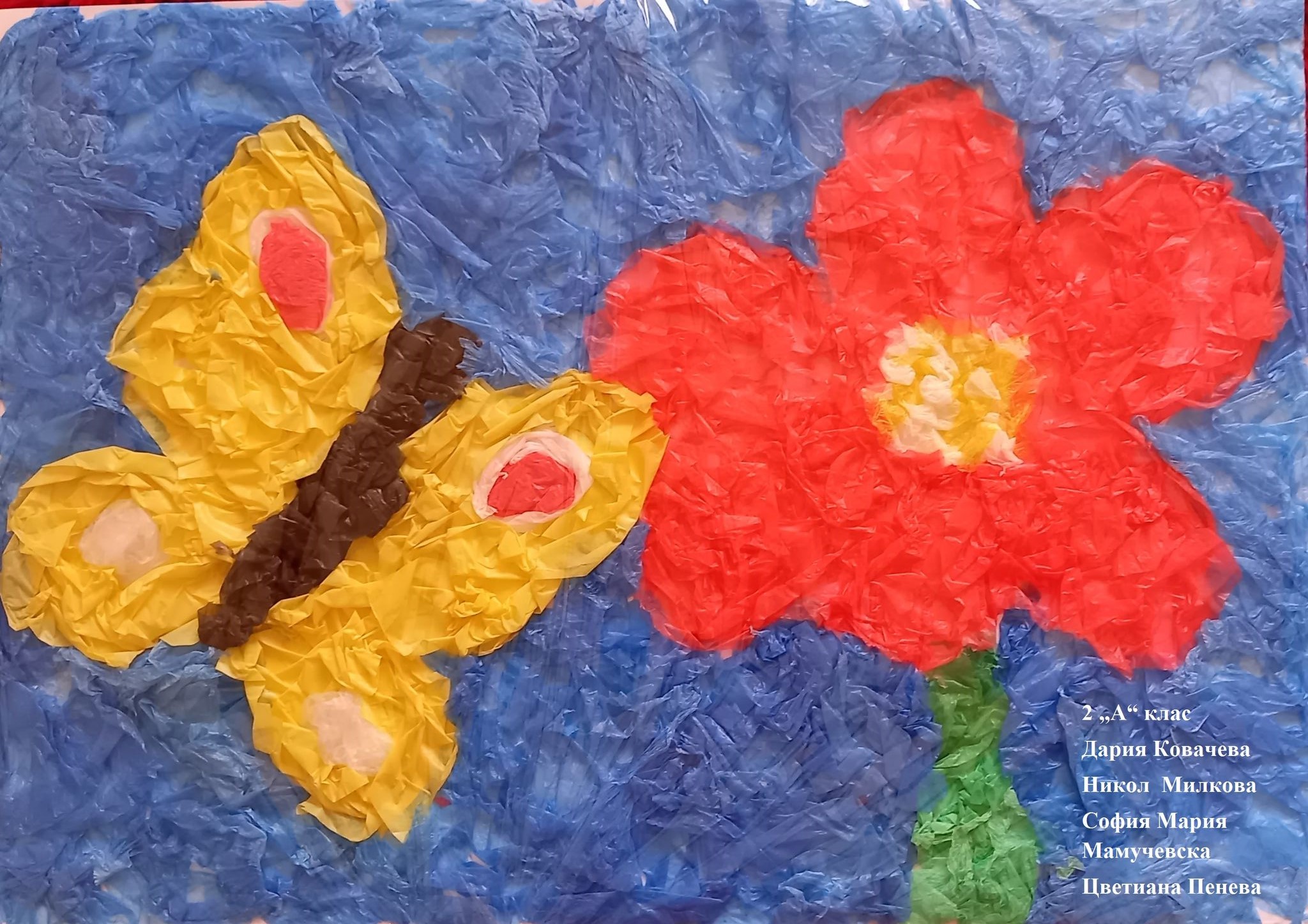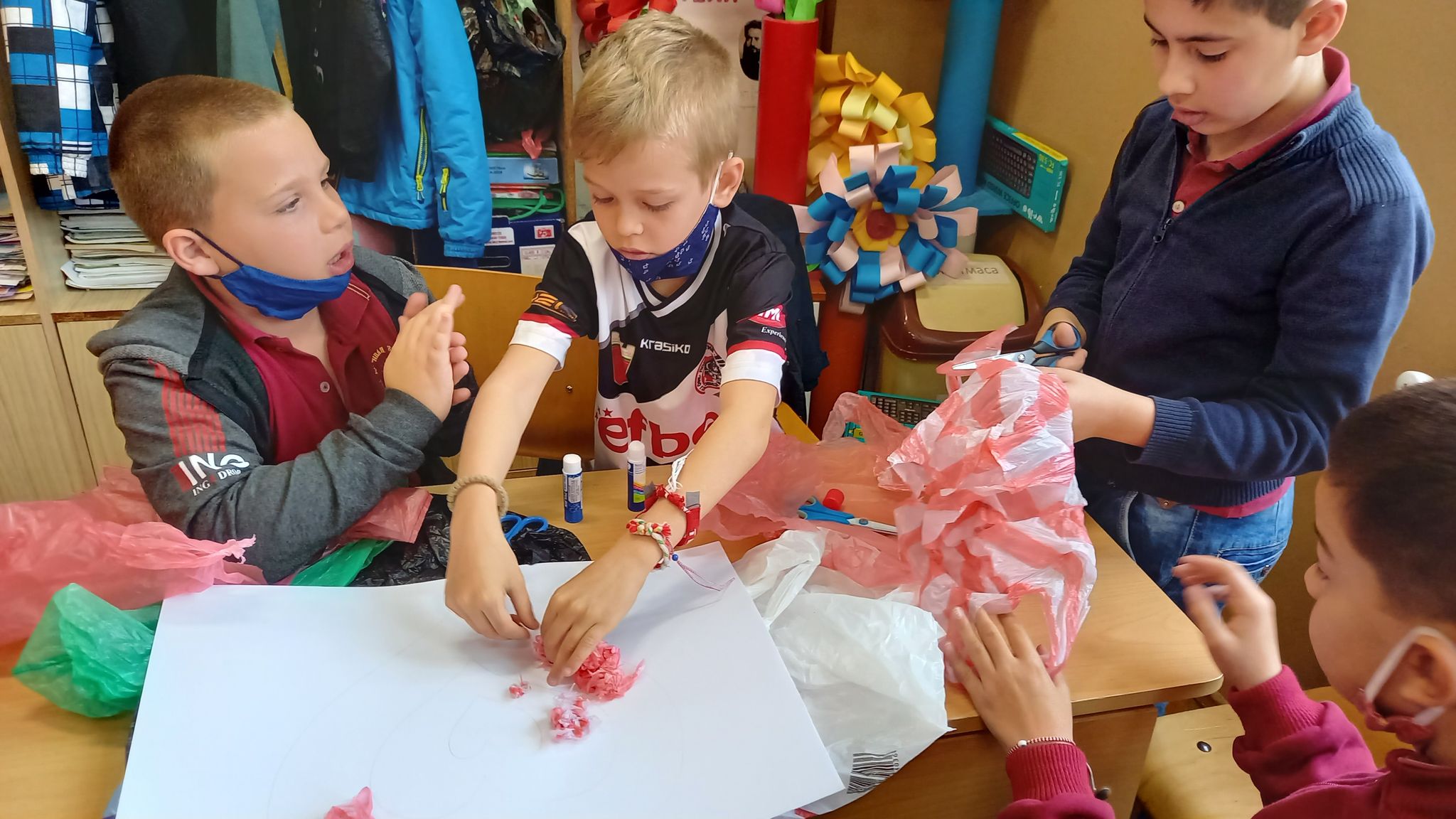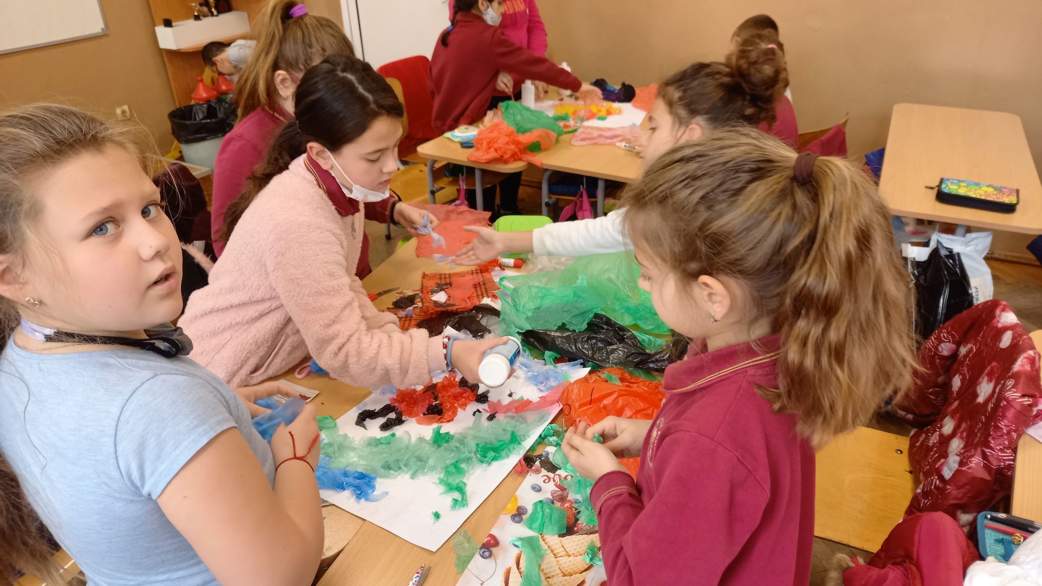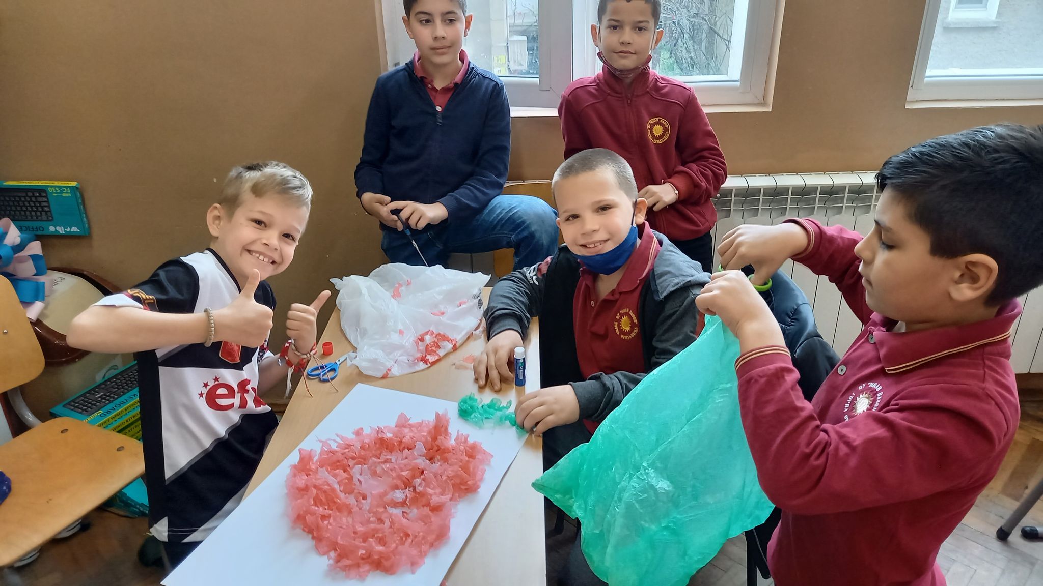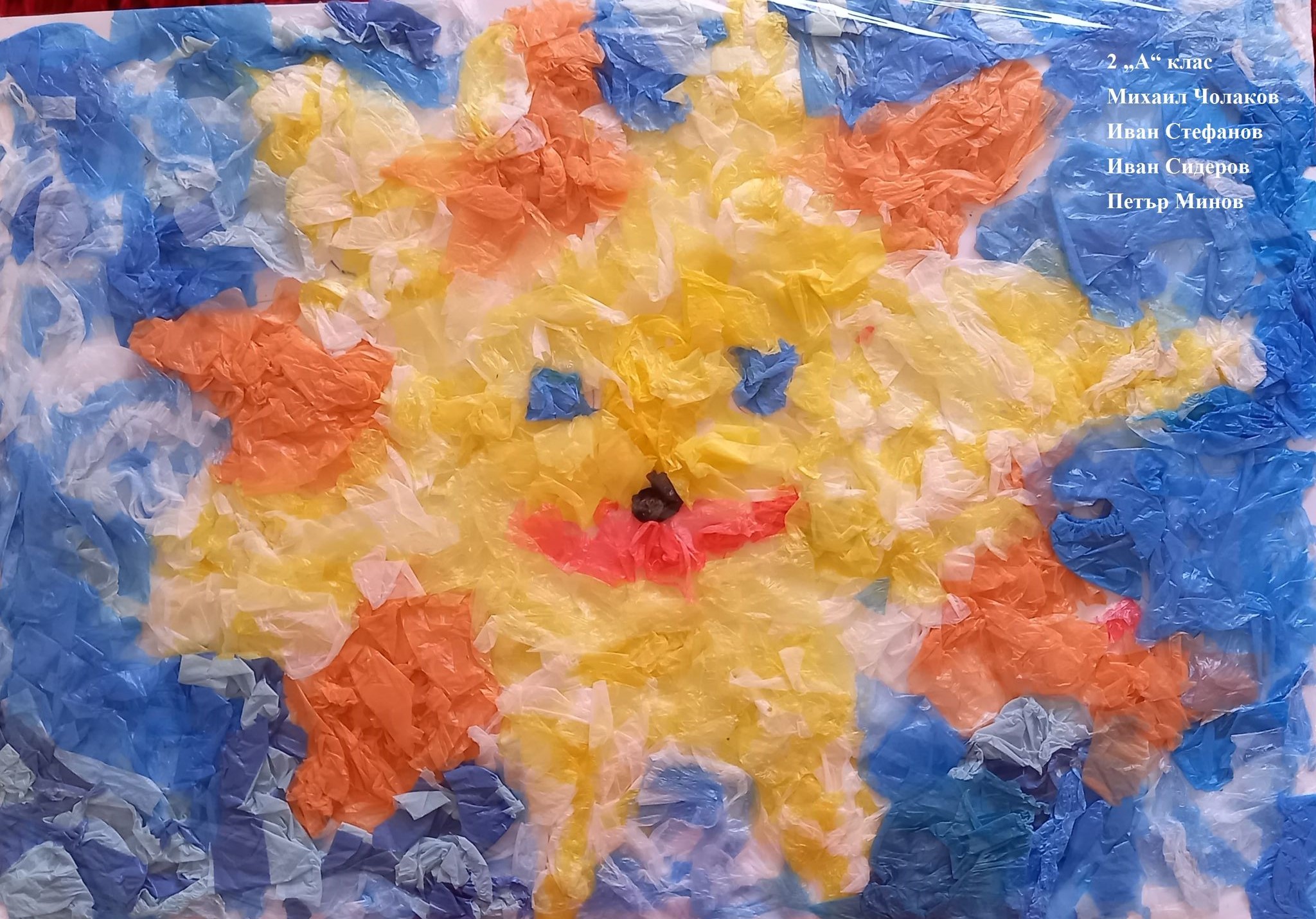 Учениците от 2 а, б, и в класове съвместно заедно с техния преподавател по изобразително изкуство, г-жа Нанкова, изработиха пана от найлонови торбички. В часовете за занимания по интереси изработиха къщи от картон. Вдъхновени от творчеството със отпадъци учениците си направиха модно ревю от рециклирани материали..