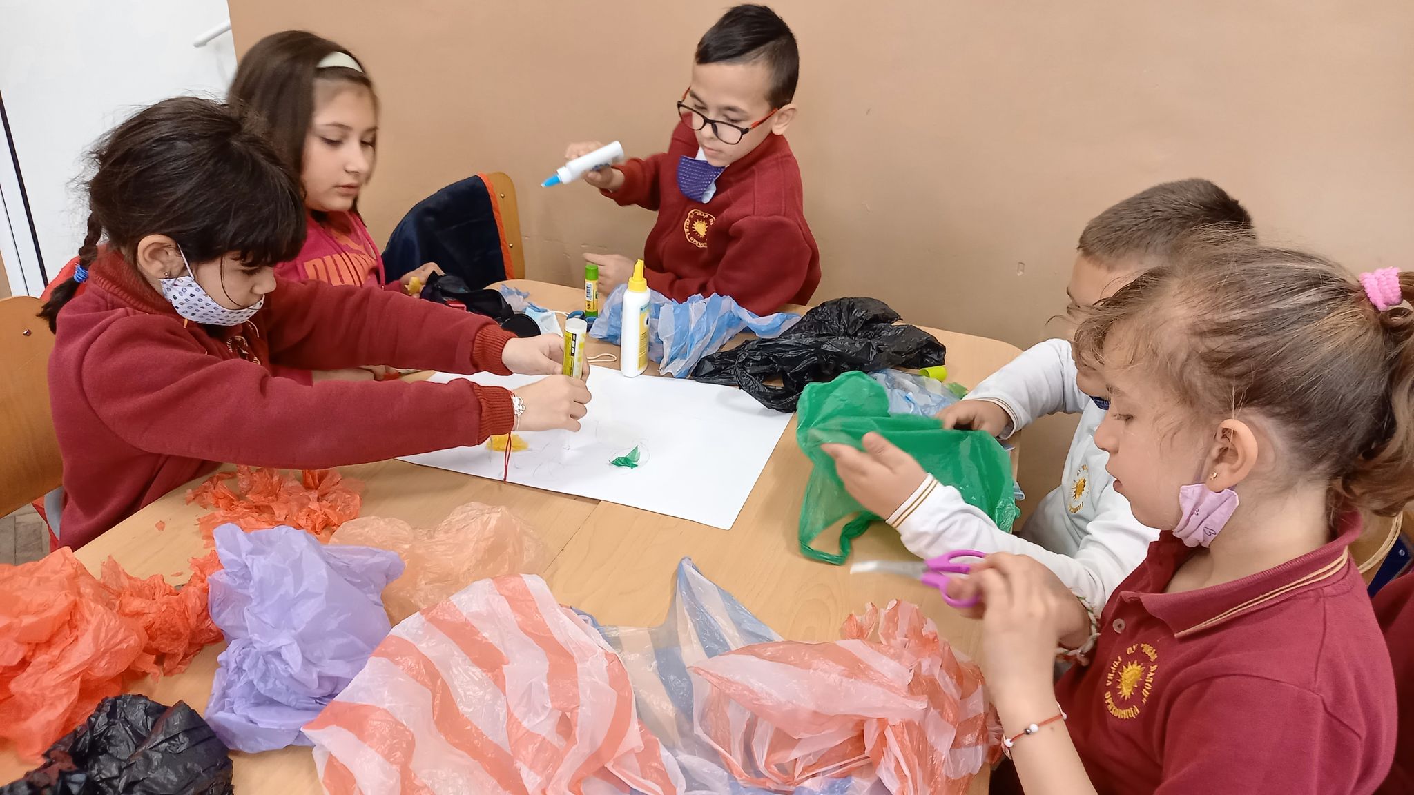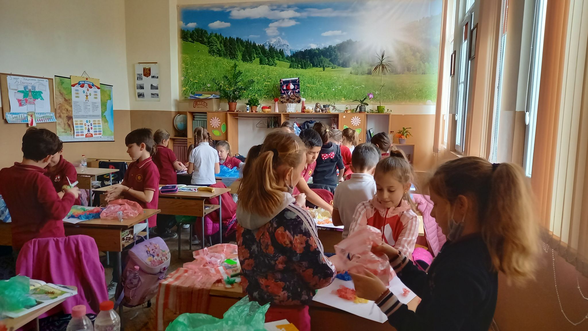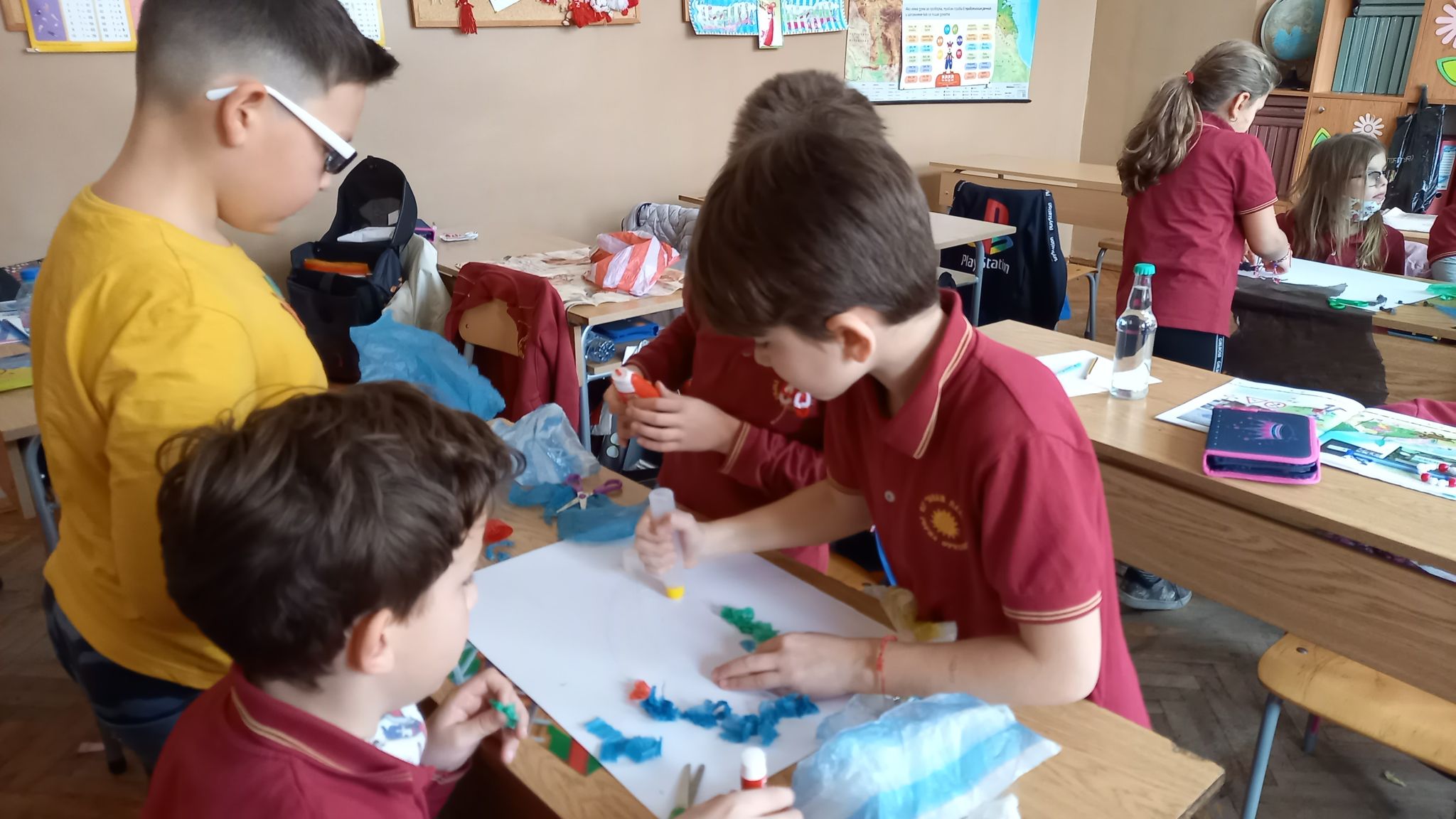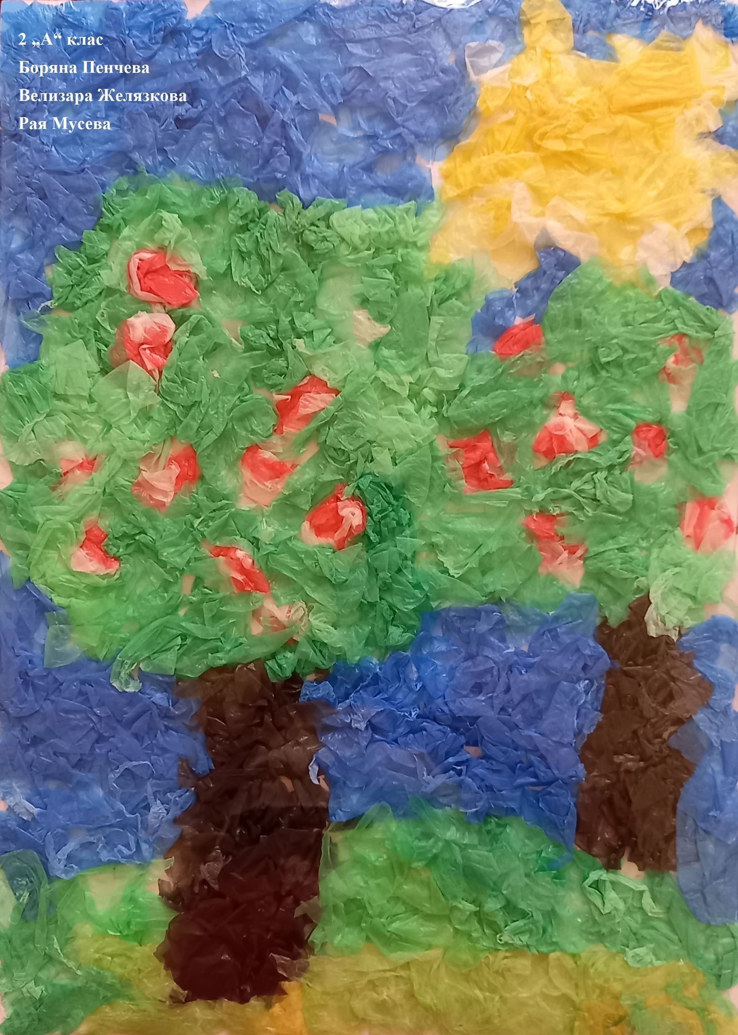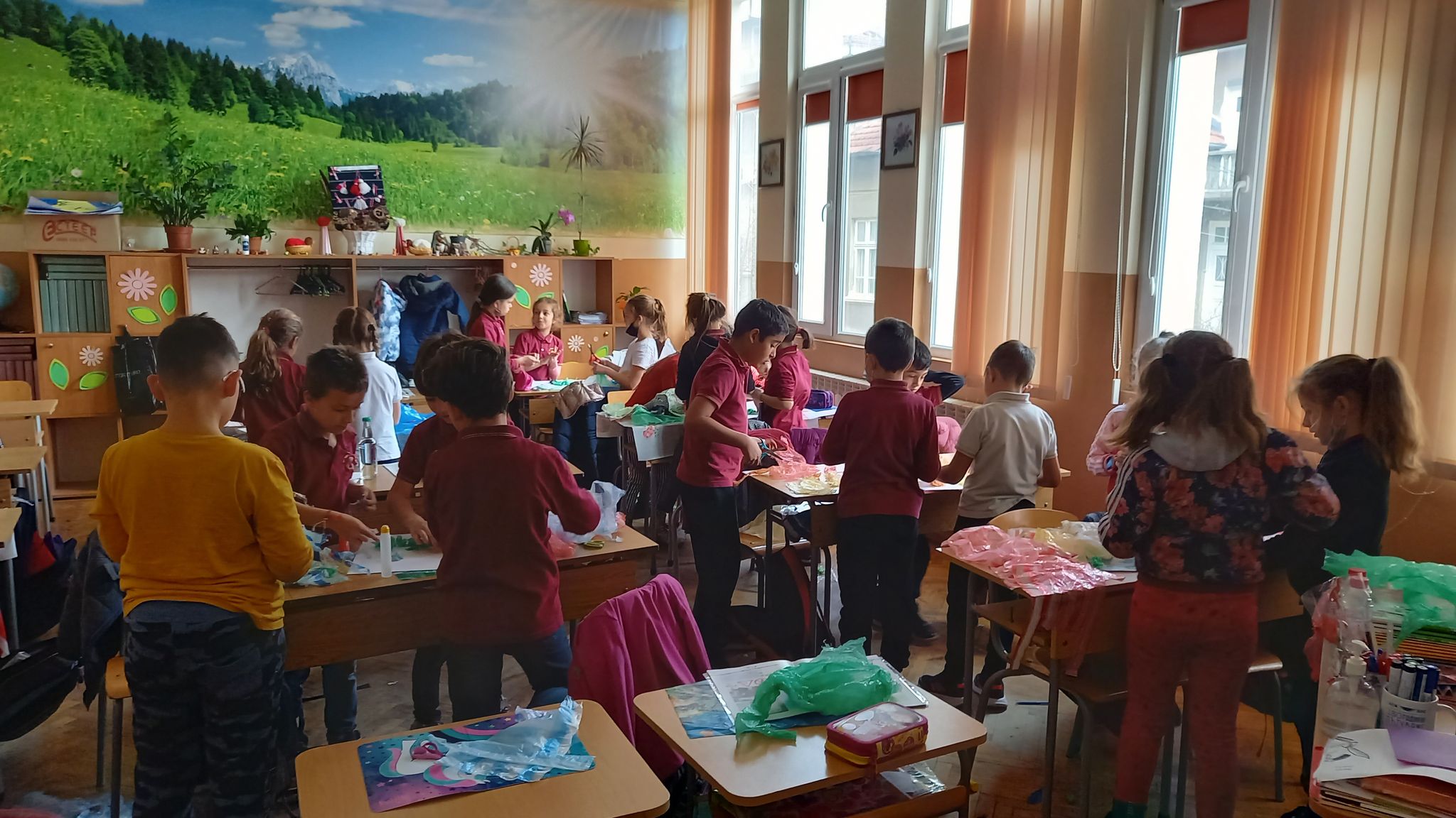 Учениците от 2 а, б, и в класове съвместно заедно с техния преподавател по изобразително изкуство, г-жа Нанкова, изработиха пана от найлонови торбички. В часовете за занимания по интереси изработиха къщи от картон. Вдъхновени от творчеството със отпадъци учениците си направиха модно ревю от рециклирани материали..