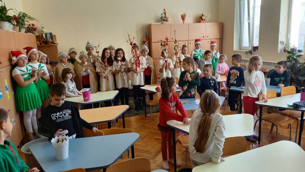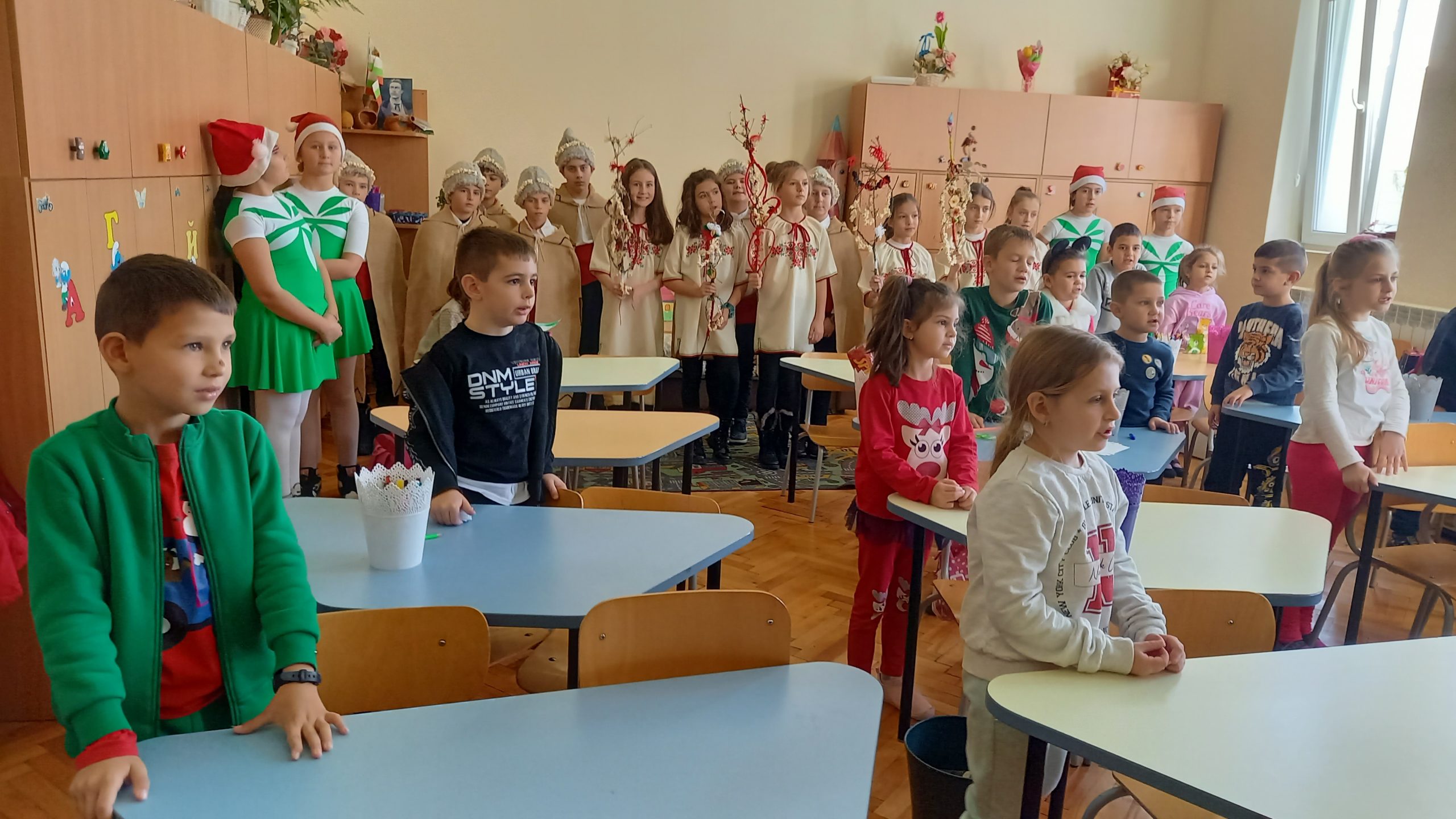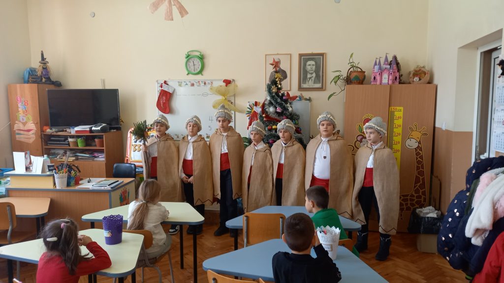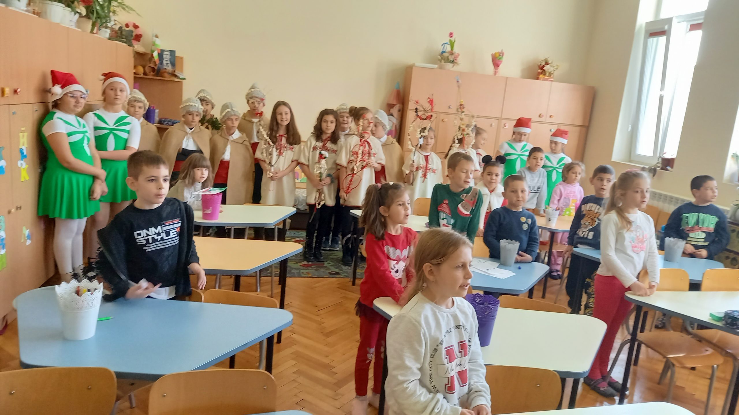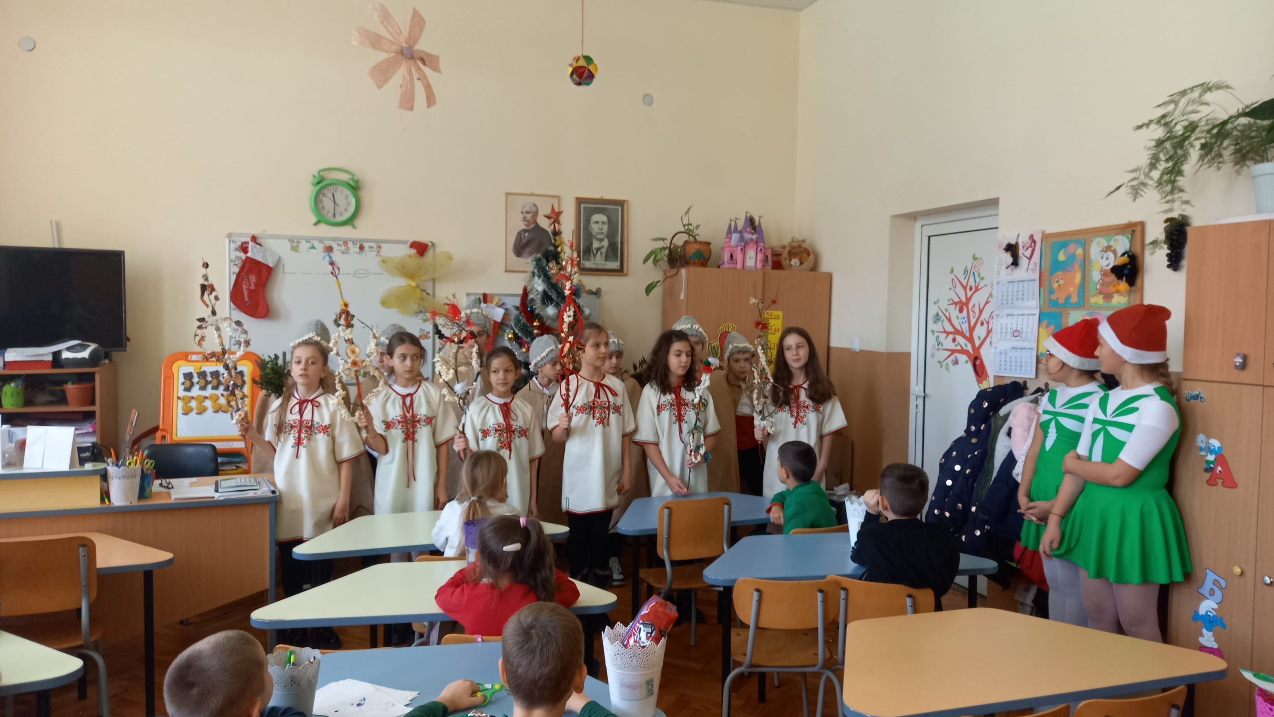 Коледни наричания и сурвакарски благопожелания отправиха четвъртокласниците и към децата от ПГ на нашето училище. Те също се представиха със стихове и песни, а в края всички заедно се поздравиха с изпълнение на коледна песен.