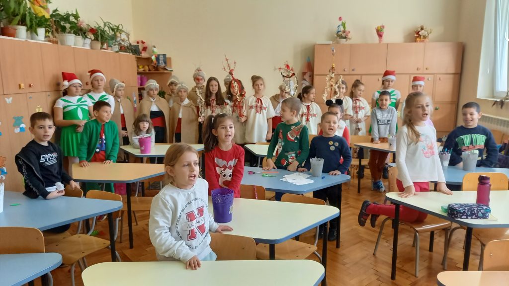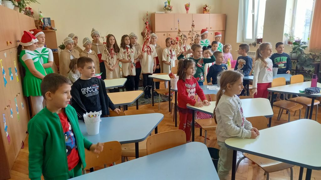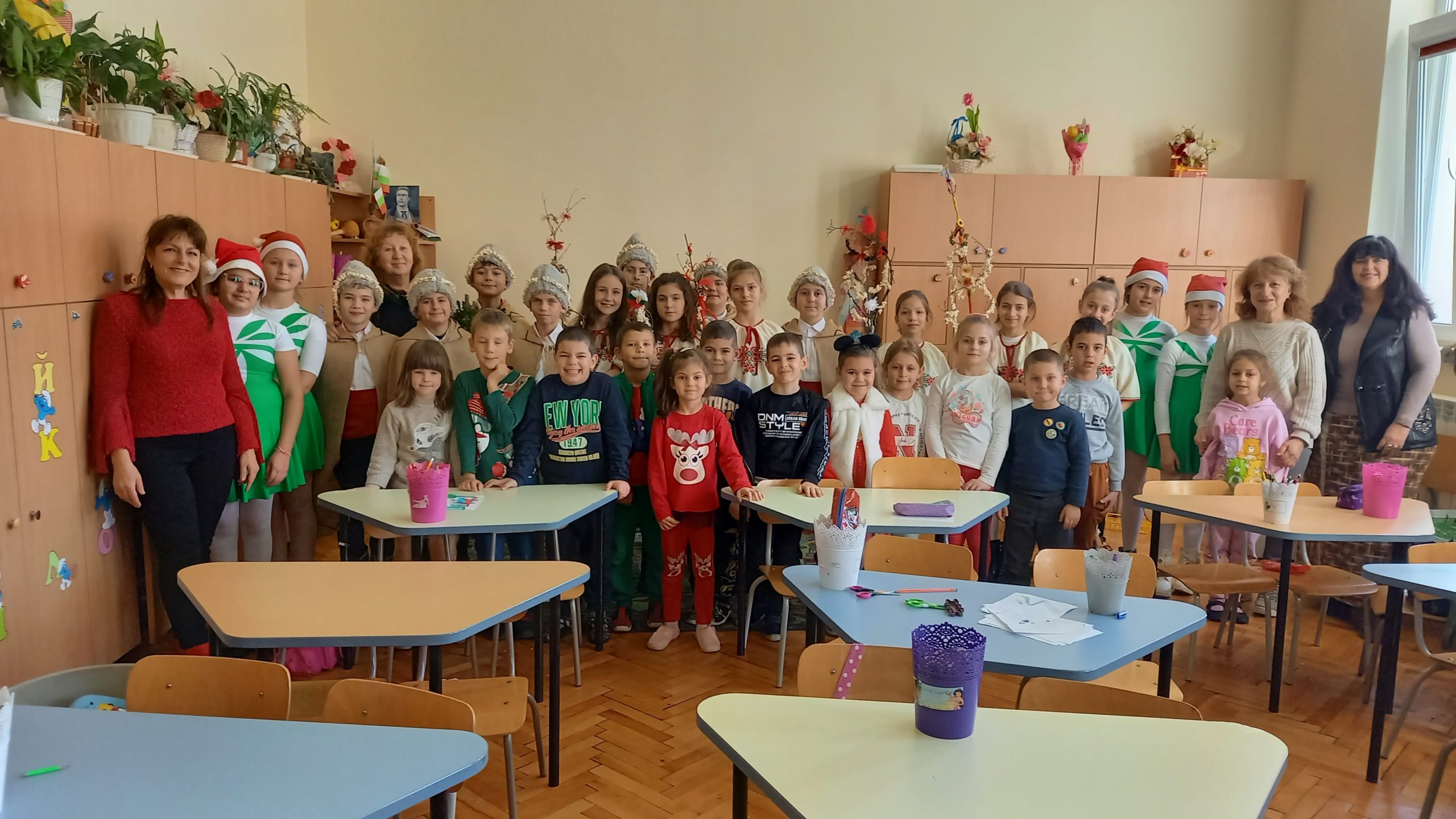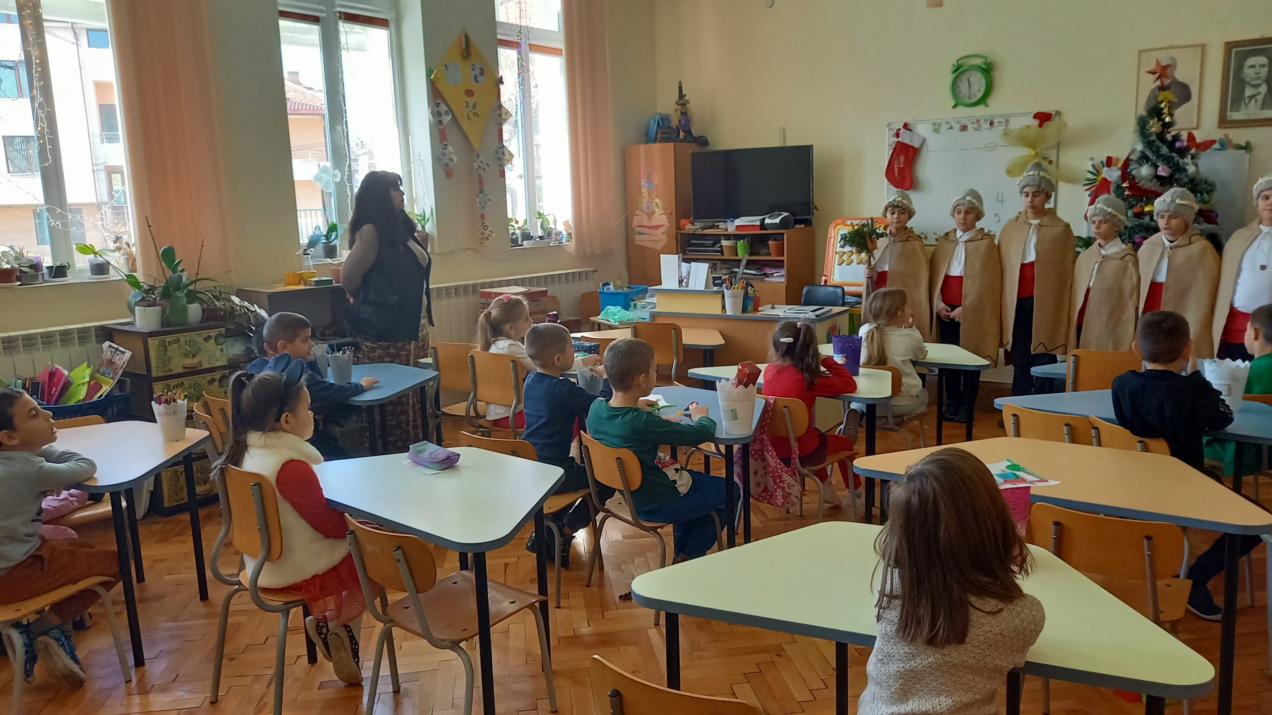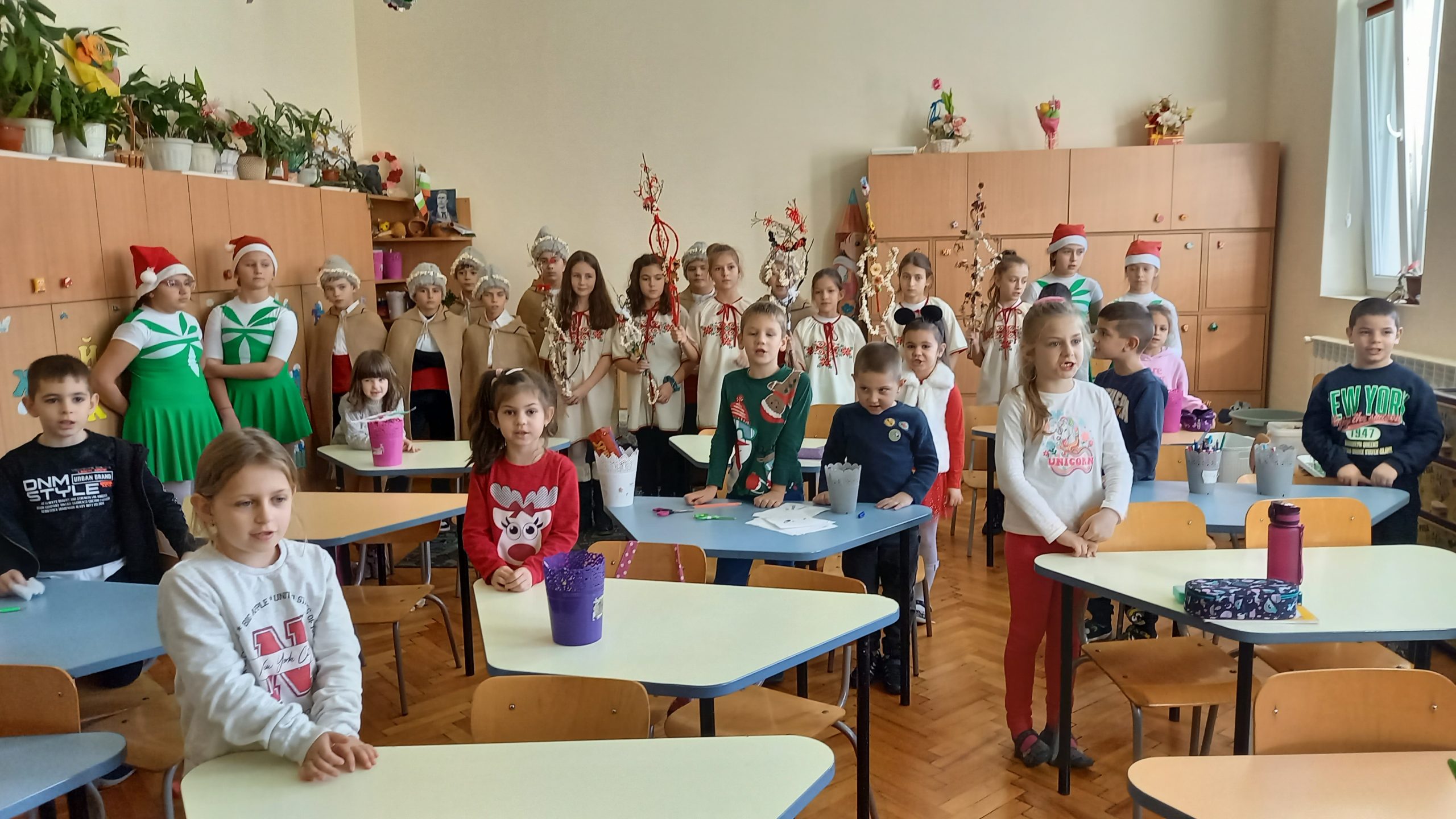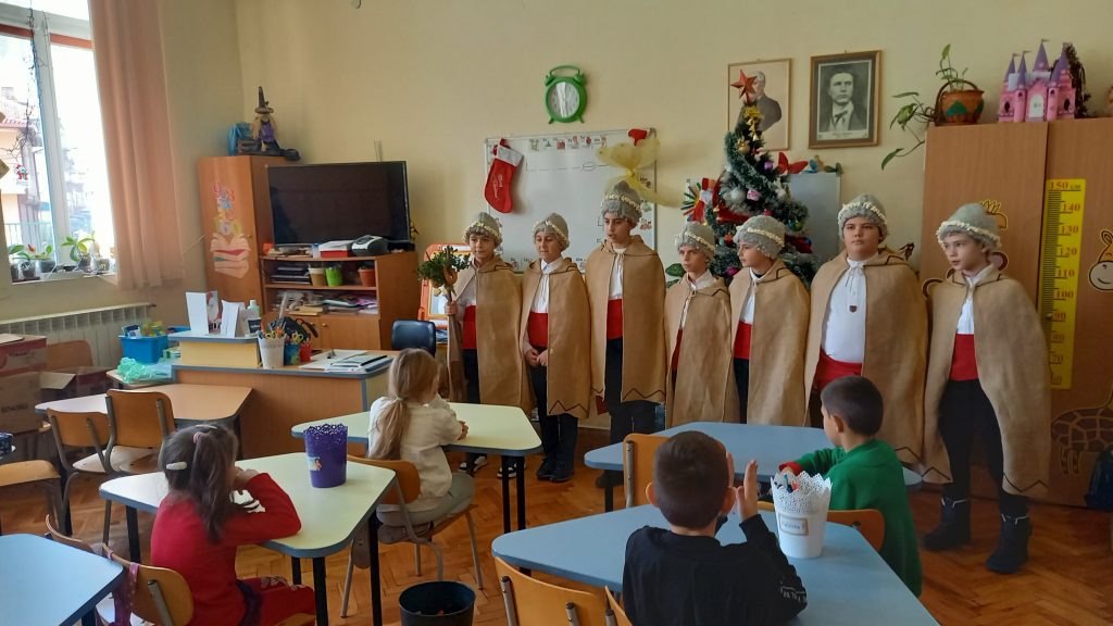 Коледни наричания и сурвакарски благопожелания отправиха четвъртокласниците и към децата от ПГ на нашето училище. Те също се представиха със стихове и песни, а в края всички заедно се поздравиха с изпълнение на коледна песен.