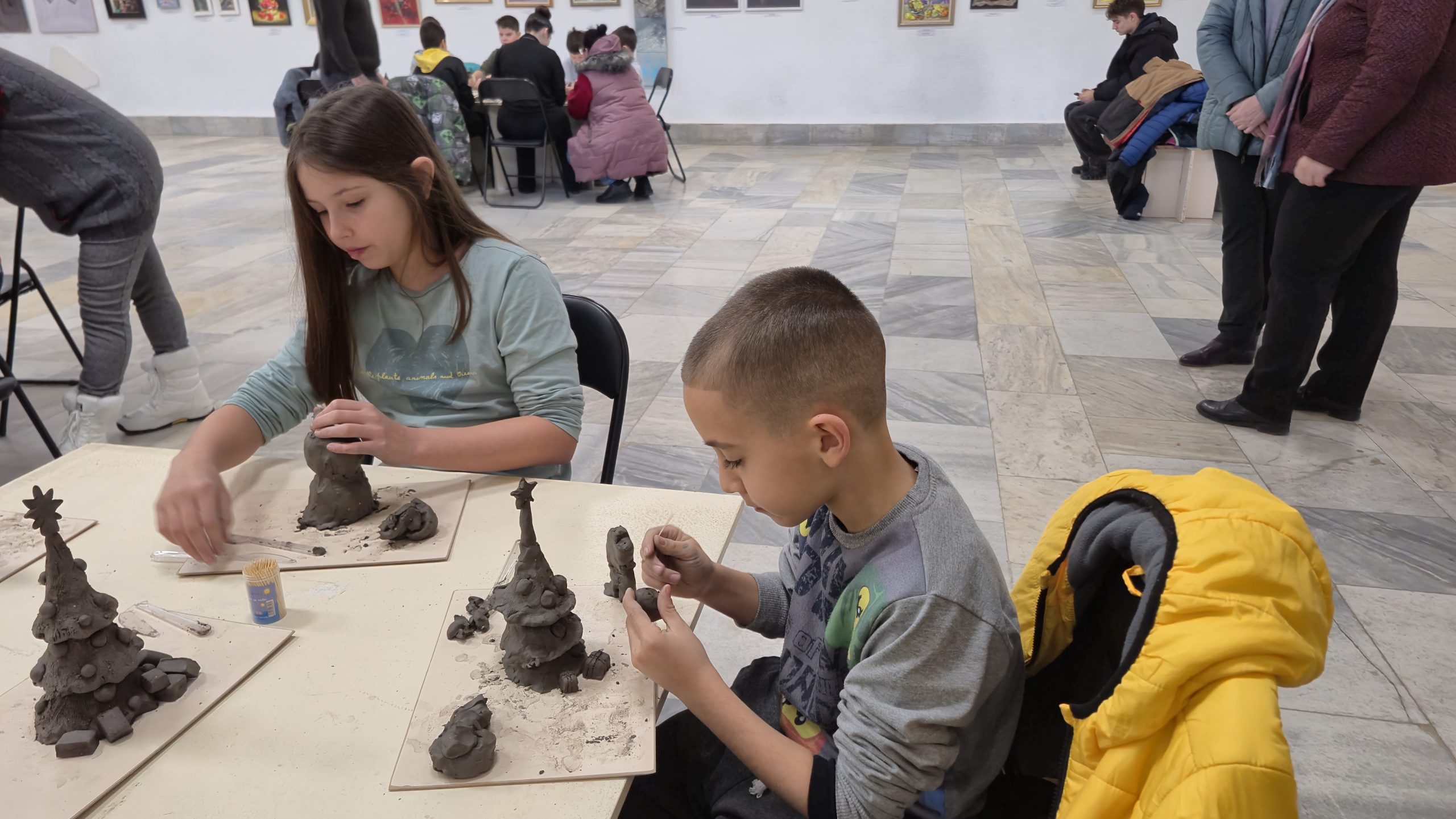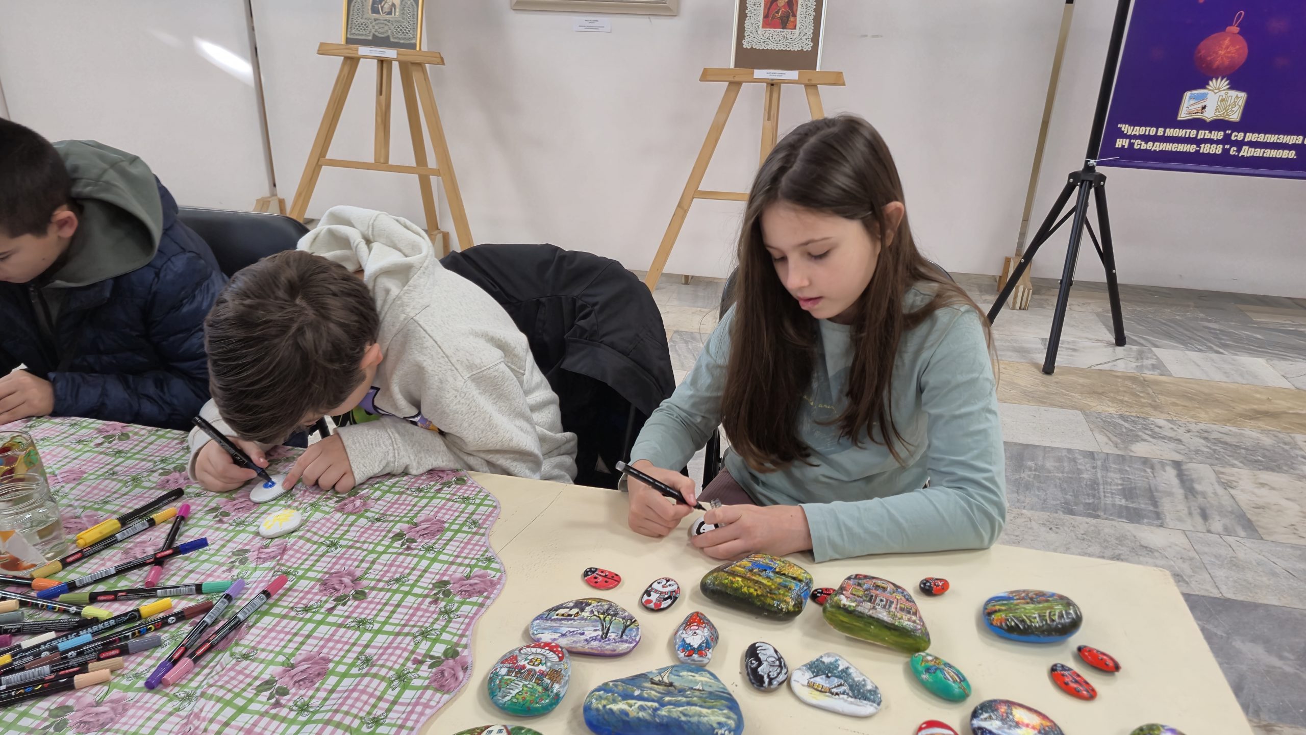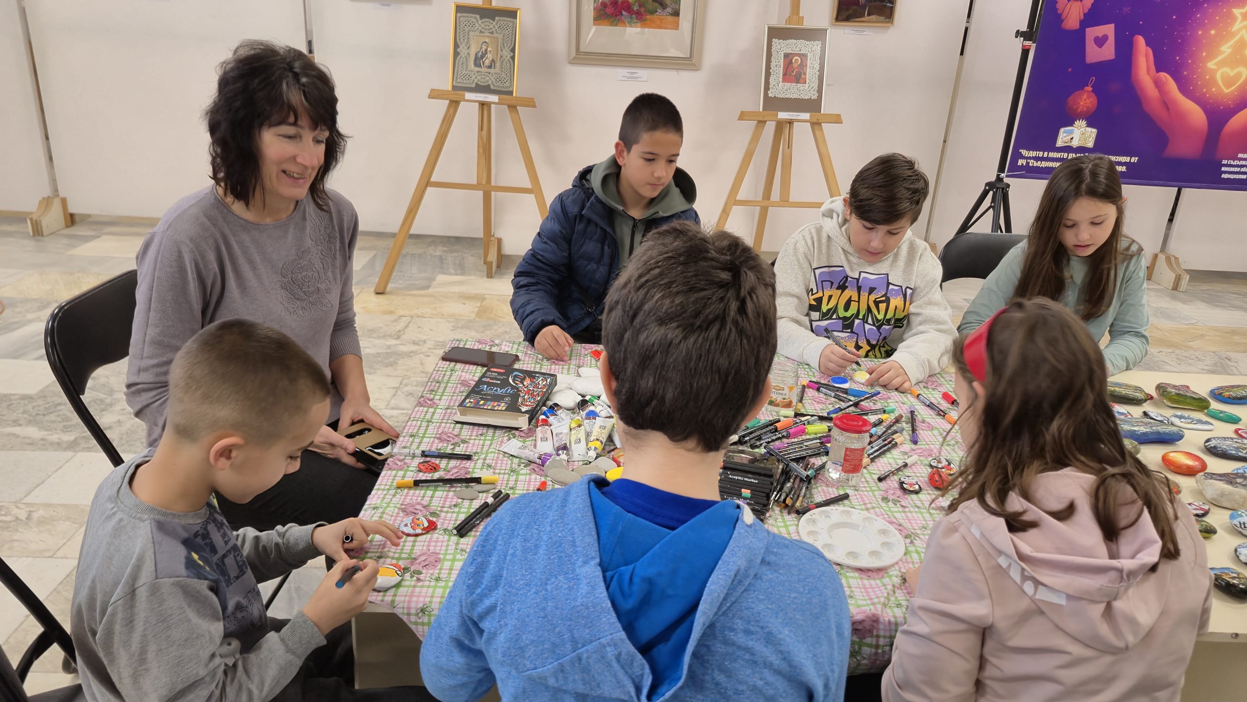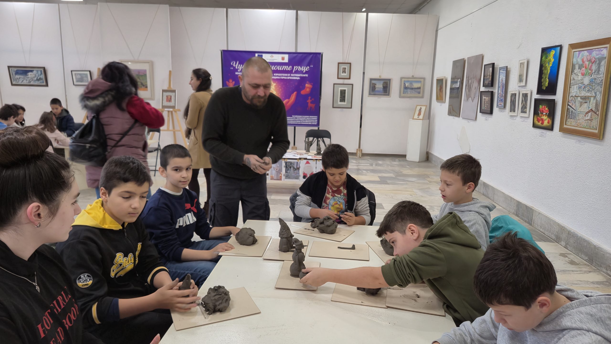 В един от творческите кътове учениците низаха гривни от мъниста, заедно с психолога Росица Иванова. Във втори кът рисуваха камъчета, заедно с поета-художник Таня Мезева, а в третия кът изработиха коледни фигурки от глина под скулптура Гълъбин Христов. Всички твориха с голямо старание и любов, а изработените сувенири ще са един прекрасен спомен от чудото, което сътвориха със собствените си ръце, споделен със своите близки и приятели.