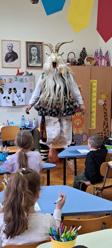 По време на срещата Веселин разказа за символиката на маските, изработката от кожа, вълна и мъниста, за силата на чановете и как всеки звънец има свой специфичен глас и защо е важно те да бъдат „настроени“ правилно. Децата показахя своите знания за обичая „Кукеруване“ и пътят на кукерите през домовете на хората и благословията за здраве, която носят.