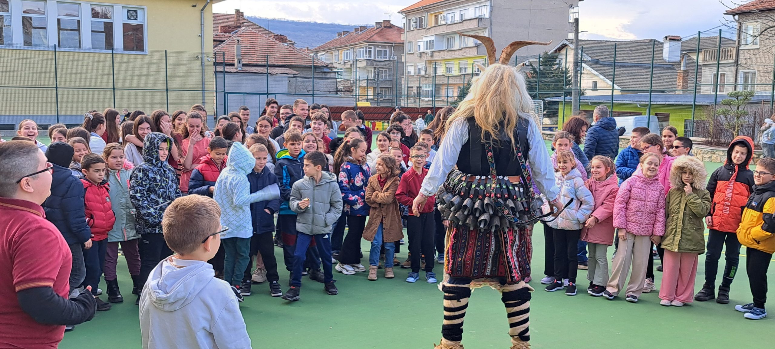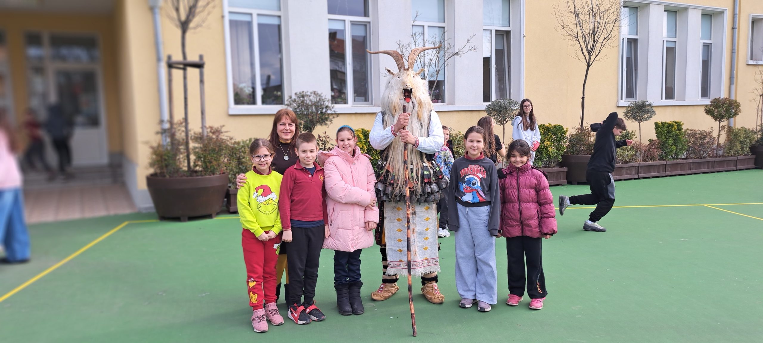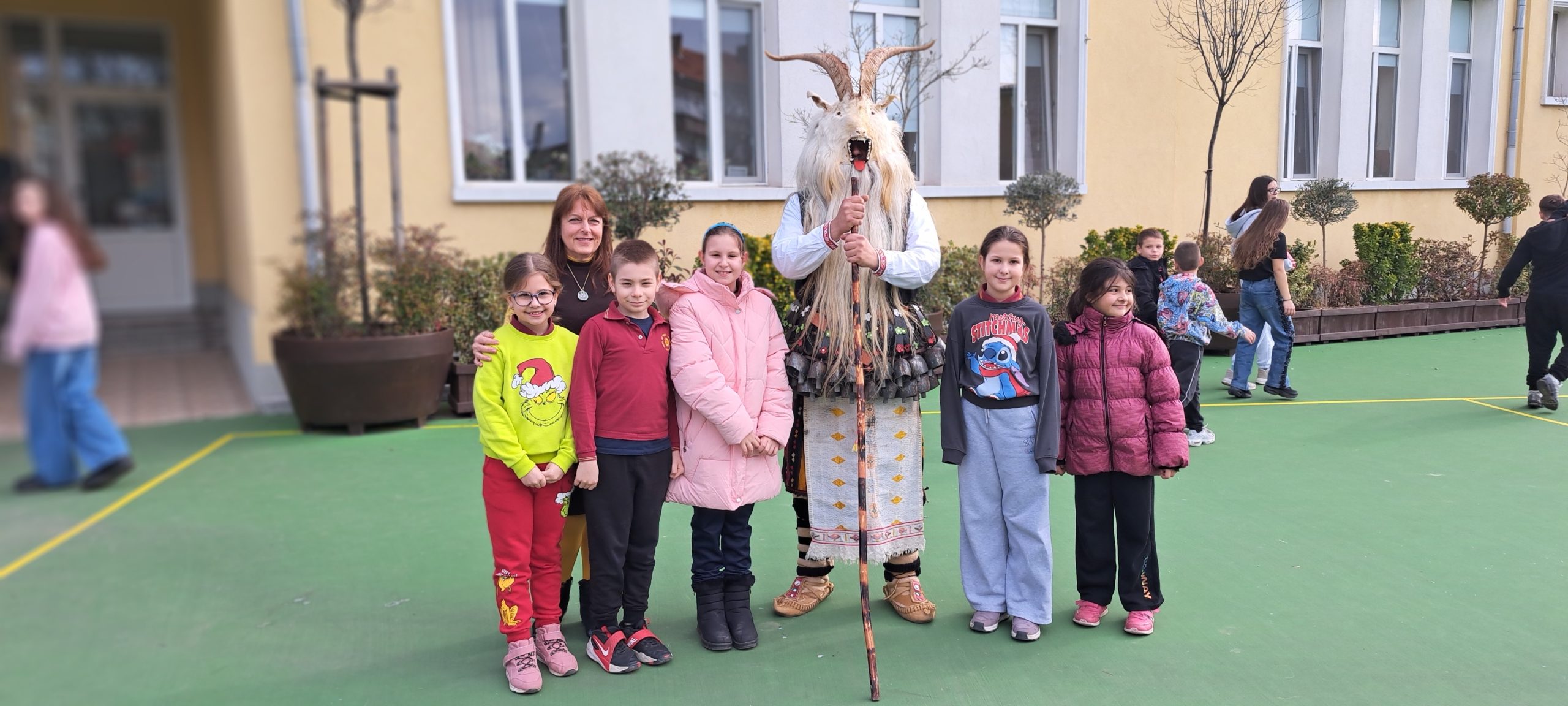 В един необикновен учебен ден дворът и коридорите на ОУ „Иван Вазов», се огласиха от ритмичния звън на десетки чанове. Училището посрещна специален гост – Веселин Петков, представител на именитата кукерска група при село Победа, област Ямбол.
