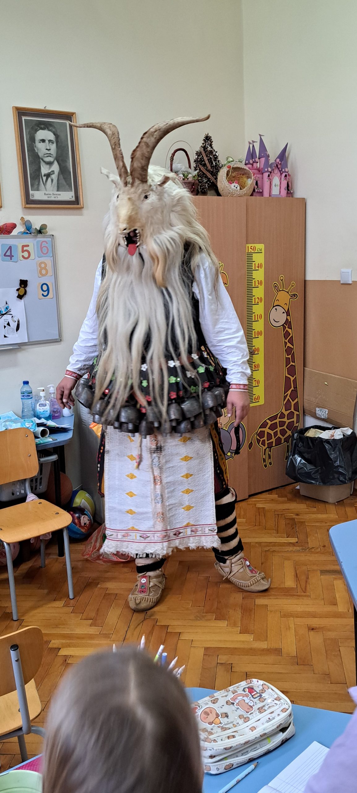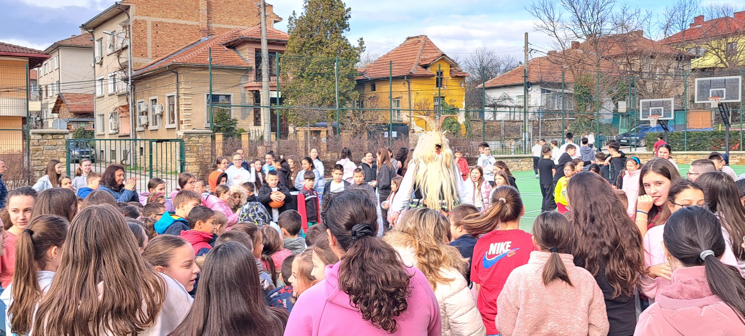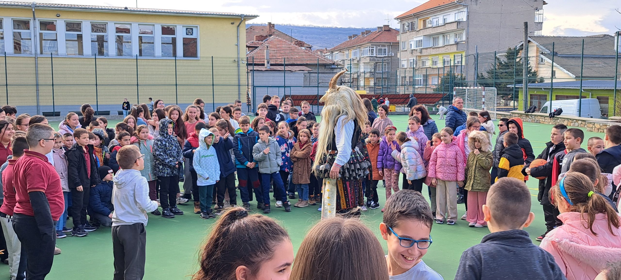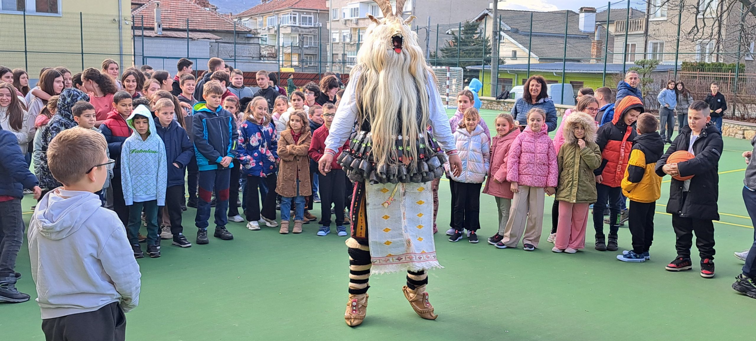 В един необикновен учебен ден дворът и коридорите на ОУ „Иван Вазов», се огласиха от ритмичния звън на десетки чанове. Училището посрещна специален гост – Веселин Петков, представител на именитата кукерска група при село Победа, област Ямбол.