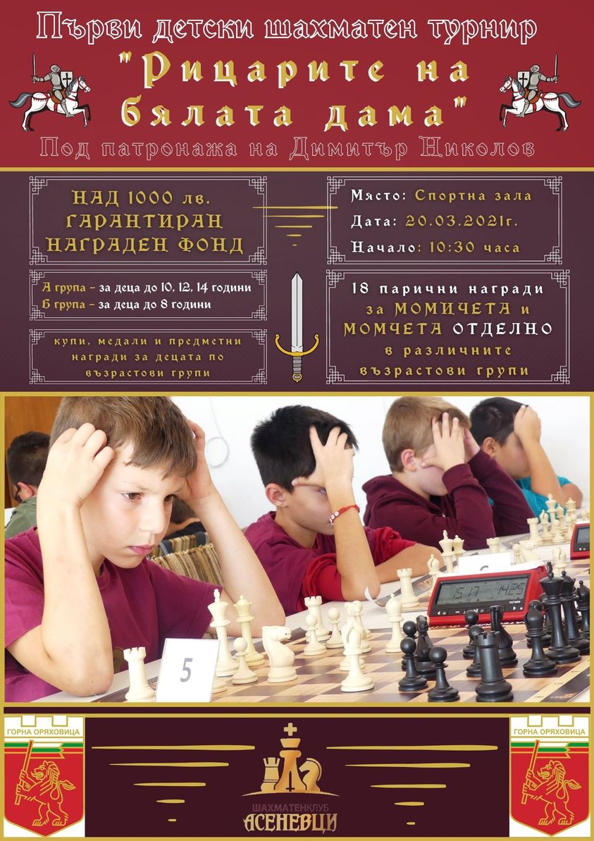 Пожелаваме нови успехи на предстоящия първи детски шахматен турнир „Рицари на бялата дама“ под патронажа на Димитър Николов, председател на Общински съвет, Г. Оряховица. Турнирът ще се проведе на 20.03.2021 г. в Спортна зала „Никола Петров“, Г. Оряховица и е с награден фонд 1000 лв. за малките шахматни рицари.