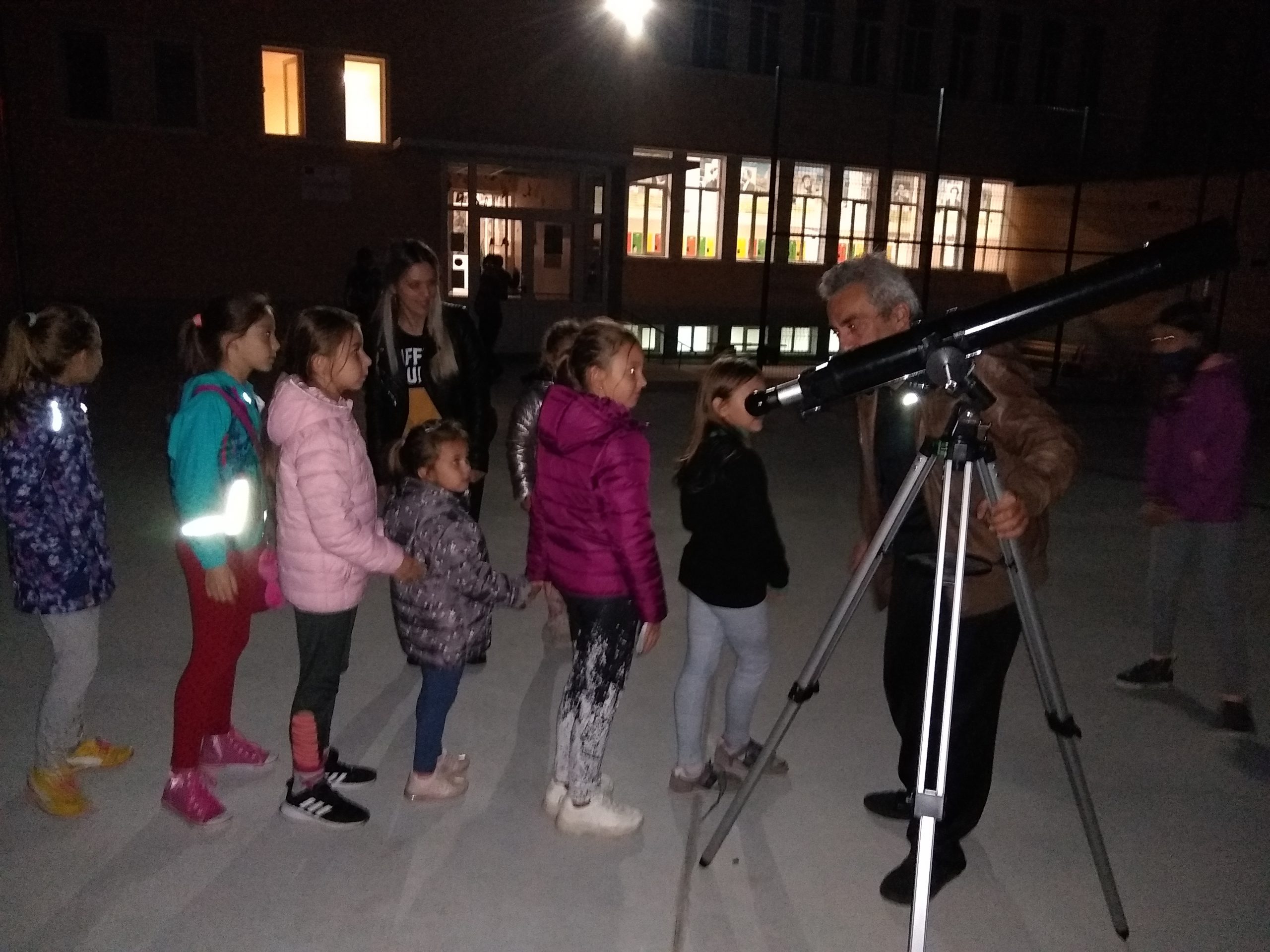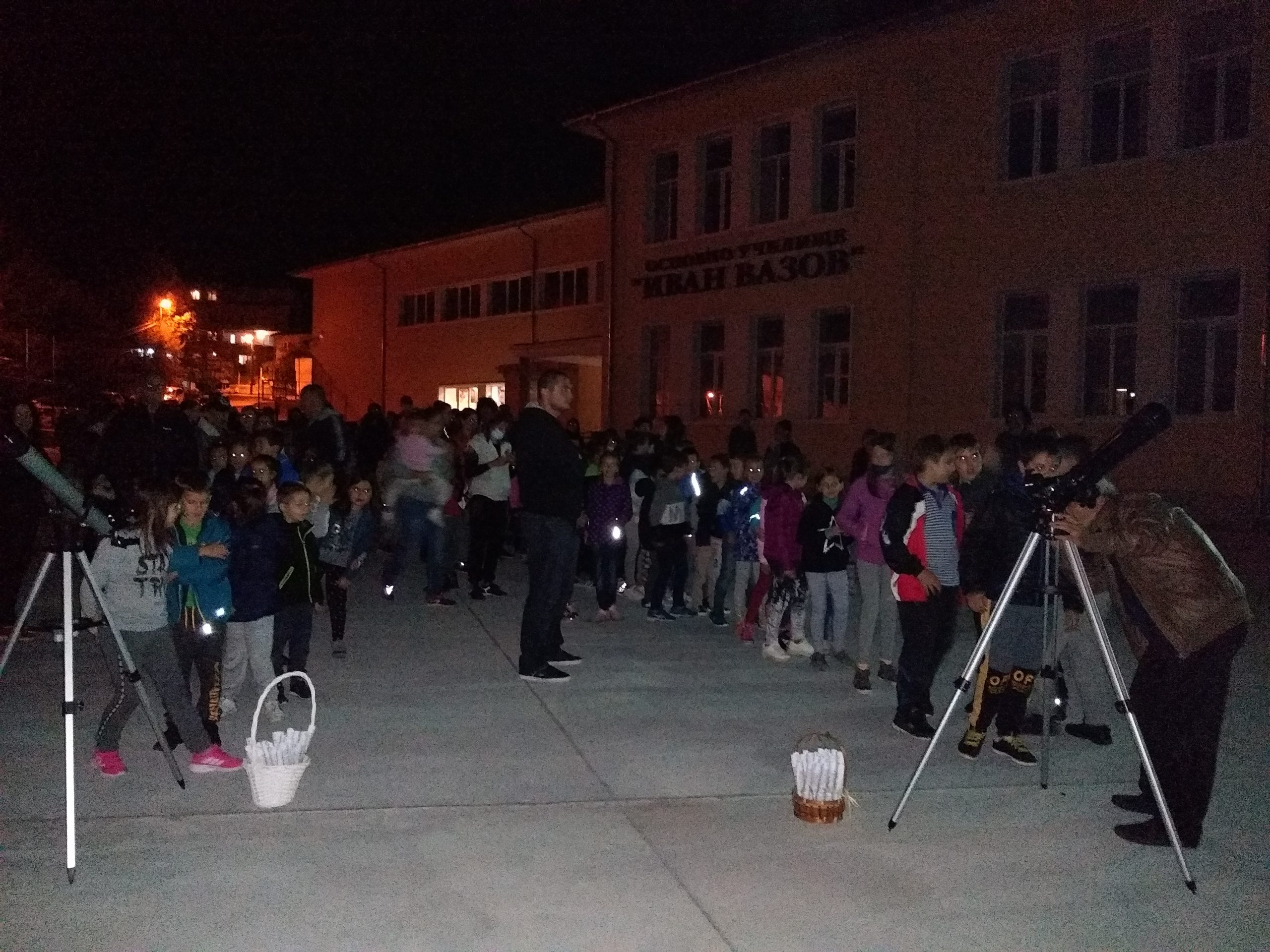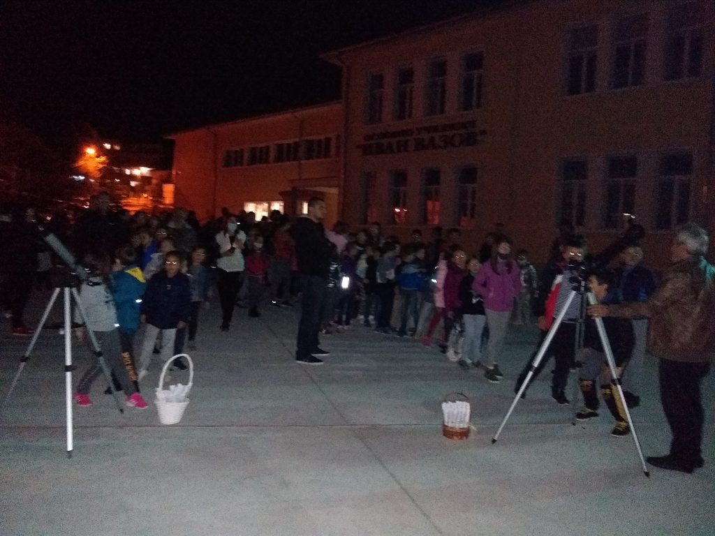 В международния ден на ученика – 15 октомври 2020 г., ученици, родители и учители от ОУ „Иван Вазов“ превърнаха училищния двор в площадка за вечерно астрономическо наблюдение. В нощното небе през есента могат да се видят много красиви обекти, сред които лесно се различават не само звездите. Две ярко греещи тела, които можем да видим с невъоръжено око, са планетите Юпитер и Сатурн.