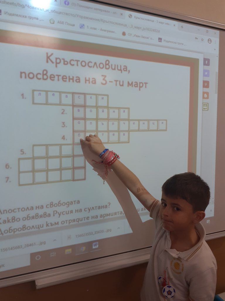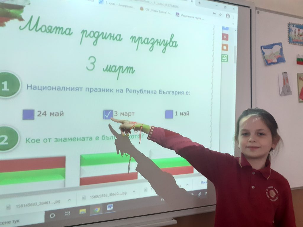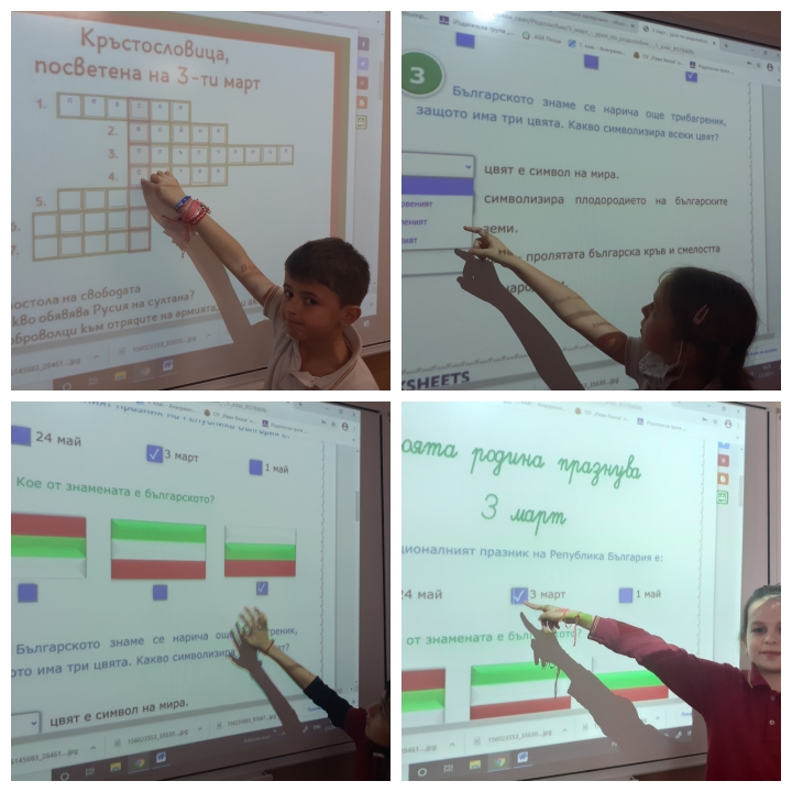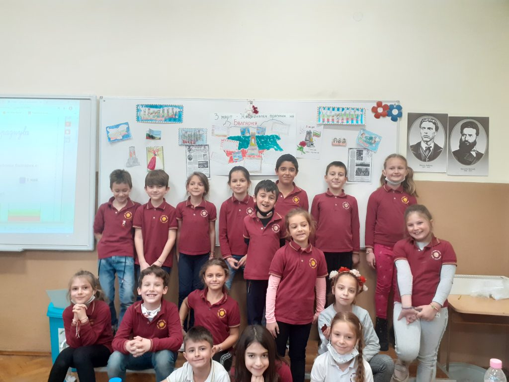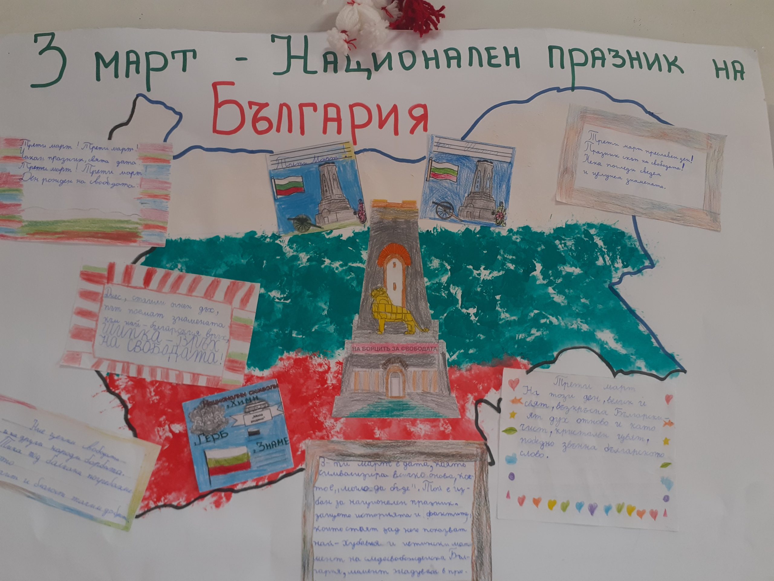 Учениците от група ЦОУД – 2 А клас участваха в урок по родолюбие на тема „Моята родина празнува“ , посветен на националния празник на Република България – 3 март. Учениците изработиха табло с рисунки и препис на откъси от стихотворения свързани с 3 март. Показаха знанията си по темата, вземайки участие в различни интерактивни упражнения.
