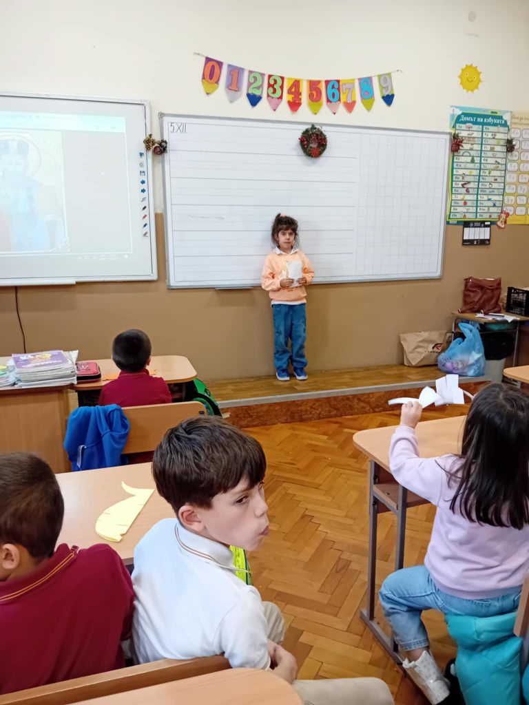 Второкласниците четоха и разказваха за Свети Николай- пазител на моряците и рибарите, който бил човек с добро сърце,спасявал моряци в бури, давал пример за смелост и милосърдие, бил справедлив към всички.Затова хората започнали да го наричат Чудотворец. Разказаха и за българските традиции.На този ден хората се събират около празничната маса с най- важното ястие – шаран, пълнен с орехи , лук и подправки, наречен рибник .