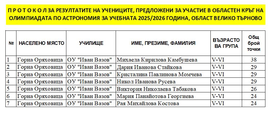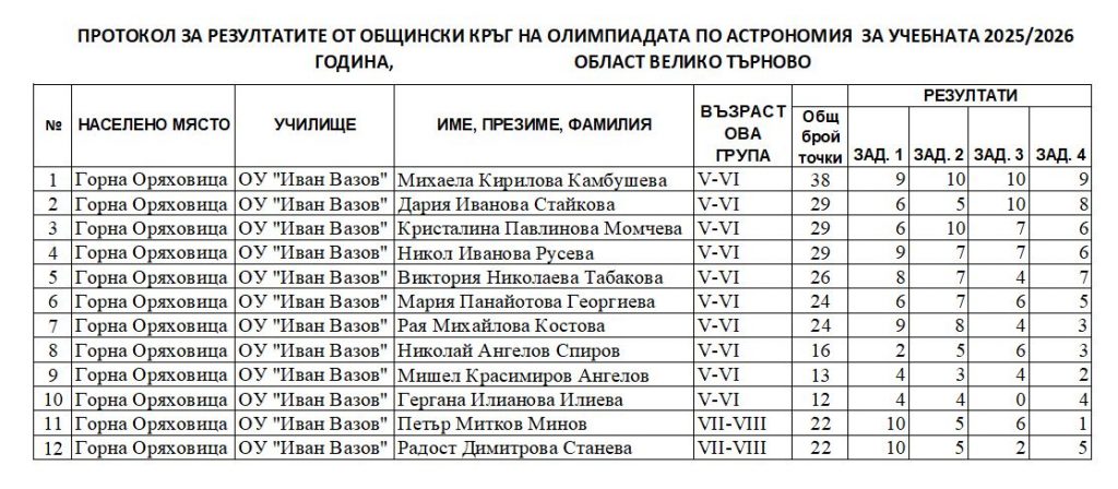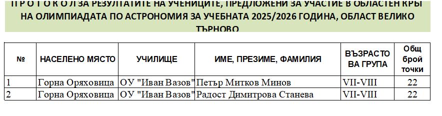 ОЛИМПИАДА ПО АСТРОНОМИЯ – ОБЩИНСКИ КРЪГ | ОУ "Иван Вазов"