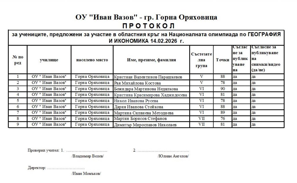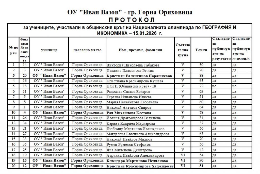 ОЛИМПИАДА ПО ГЕОГРАФИЯ И ИКОНОМИКА - ОБЩИНСКИ КРЪГ