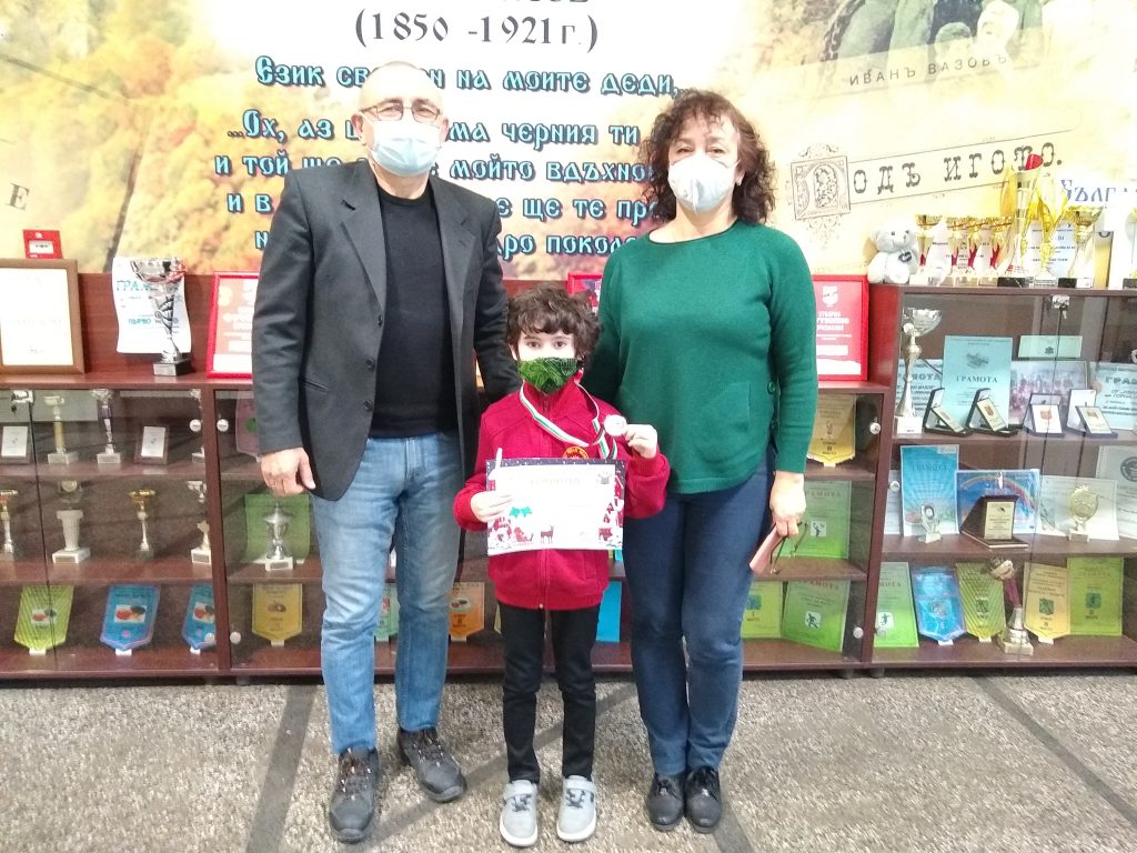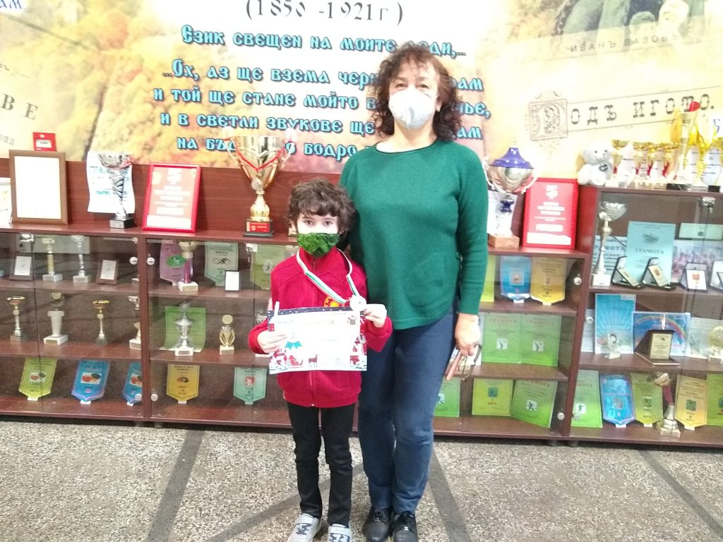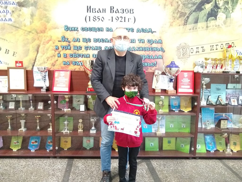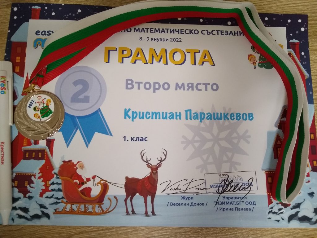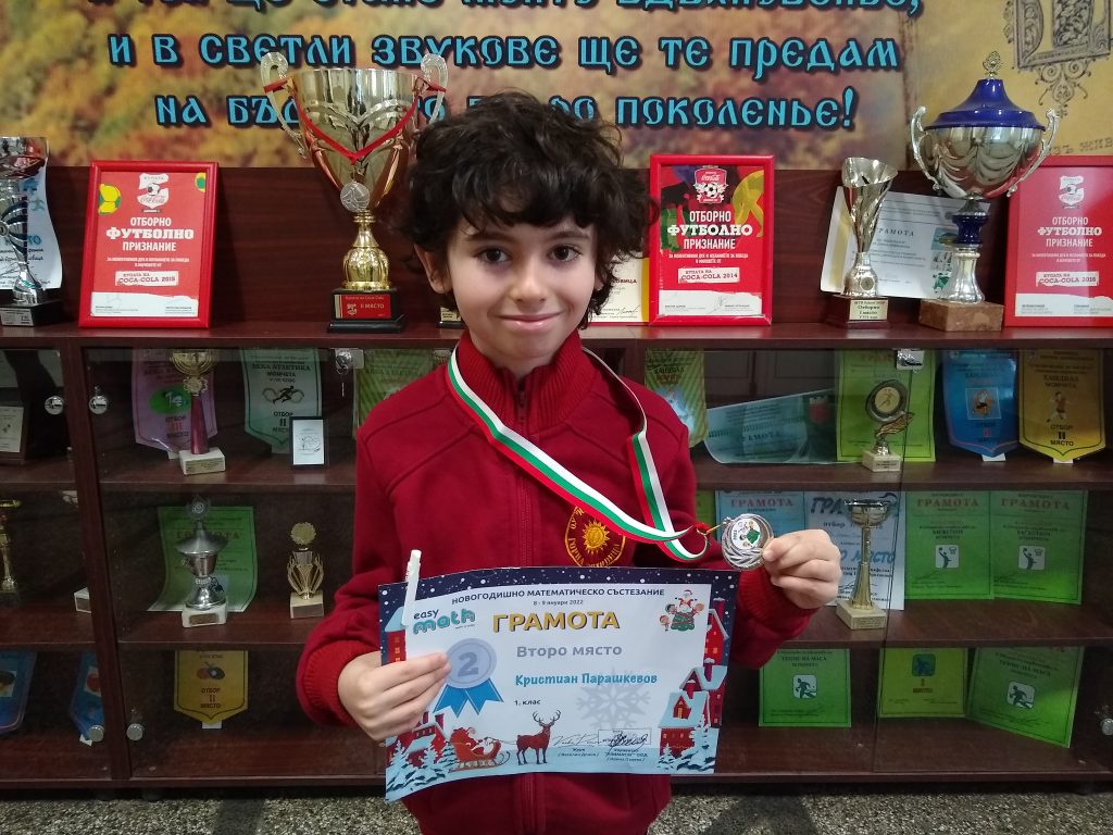 Кристиан Парашкевов от 1а клас, с класен ръководитеб Лидия Минчева, е отличен със сребърен медал и грамота за участие в Новогодишното математическо състезание на ИЗИМАТ.БГ