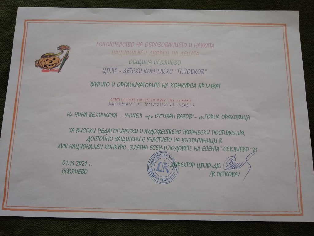 Учениците от литературен клуб „Вдъхновение” при ОУ „Иван Вазов” се включиха в Осемнадесетия конкурс „Златна есен – плодовете на есента“ Севлиево 2021 заедно с творци от още 73 школи, клубове, читалища. Конкурсът е организиран от Министерството на образованието и науката, Национален дворец на децата, Община Севлиево и ЦПЛР-Детски комплекс „Йордан Йовков”. Децата от ОУ „Иван Вазов” се представиха достойно и извоюваха за училището и своите ръководители още едно признание. Училището получи Диплом за участие и отлично представяне, а творческите ръководители на учениците Сертификат за високи педагогически и художествено-творчески постижения.