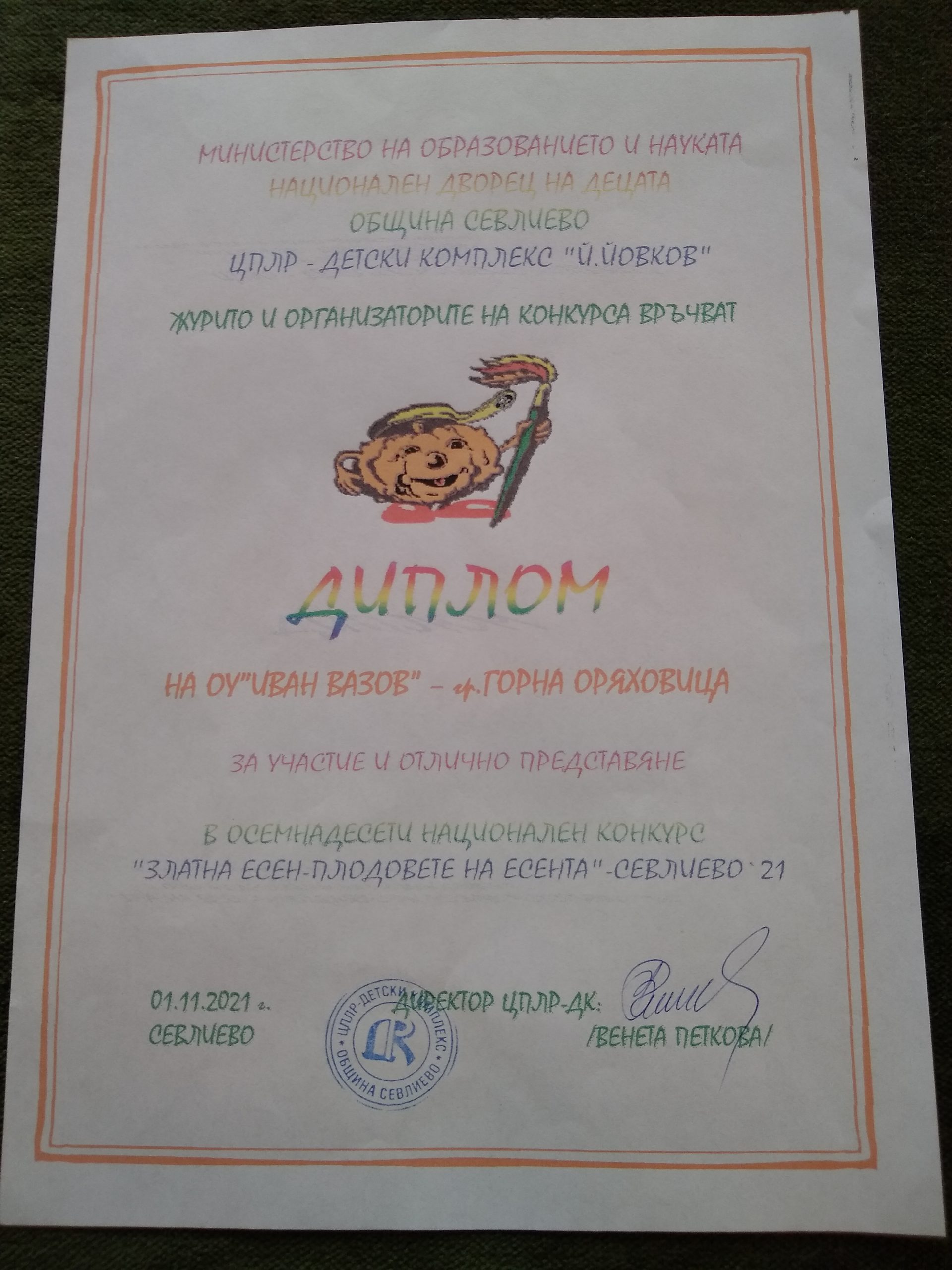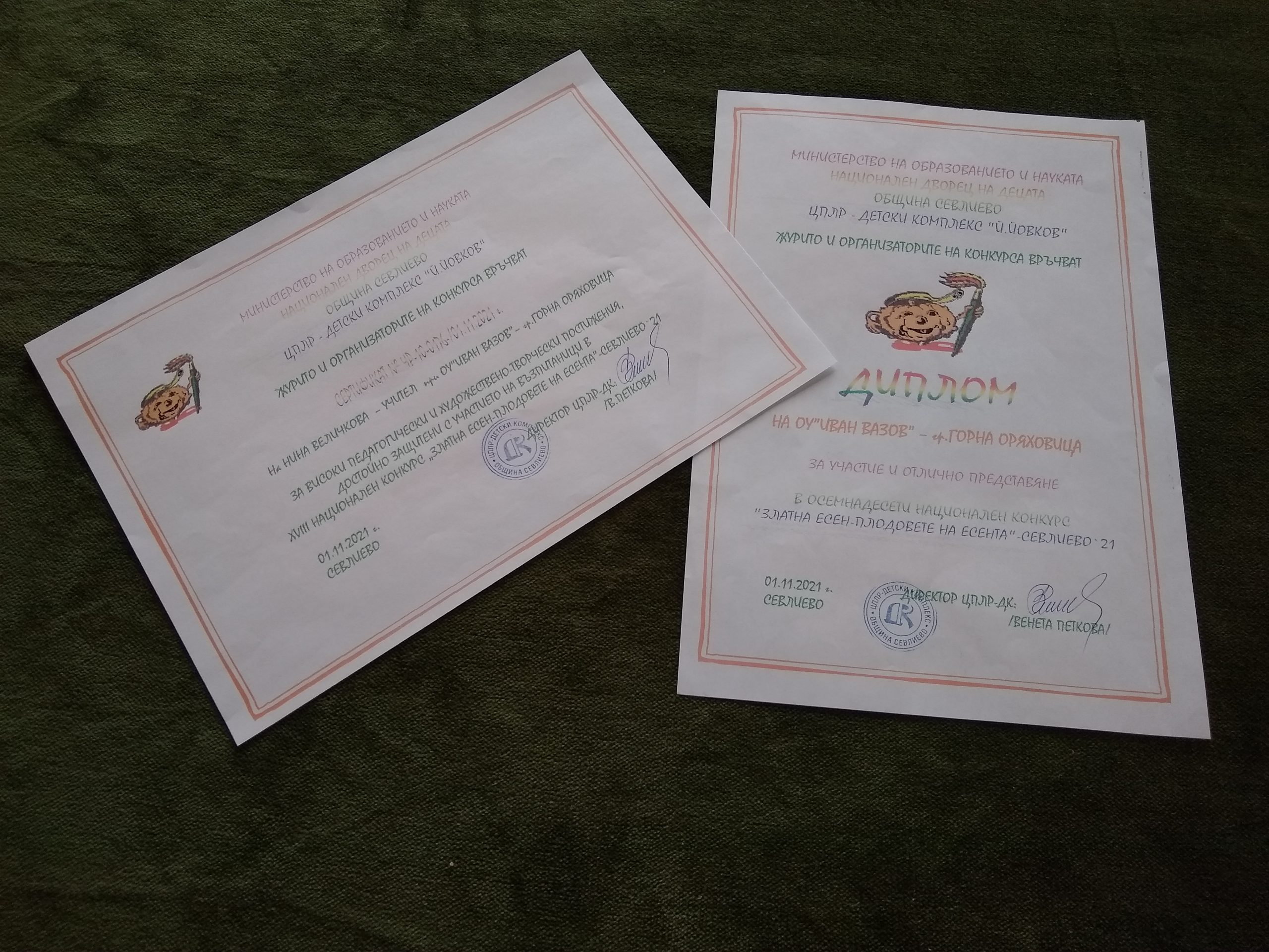 Учениците от литературен клуб „Вдъхновение” при ОУ „Иван Вазов” се включиха в Осемнадесетия конкурс „Златна есен – плодовете на есента“ Севлиево 2021 заедно с творци от още 73 школи, клубове, читалища. Конкурсът е организиран от Министерството на образованието и науката, Национален дворец на децата, Община Севлиево и ЦПЛР-Детски комплекс „Йордан Йовков”. Децата от ОУ „Иван Вазов” се представиха достойно и извоюваха за училището и своите ръководители още едно признание. Училището получи Диплом за участие и отлично представяне, а творческите ръководители на учениците Сертификат за високи педагогически и художествено-творчески постижения.