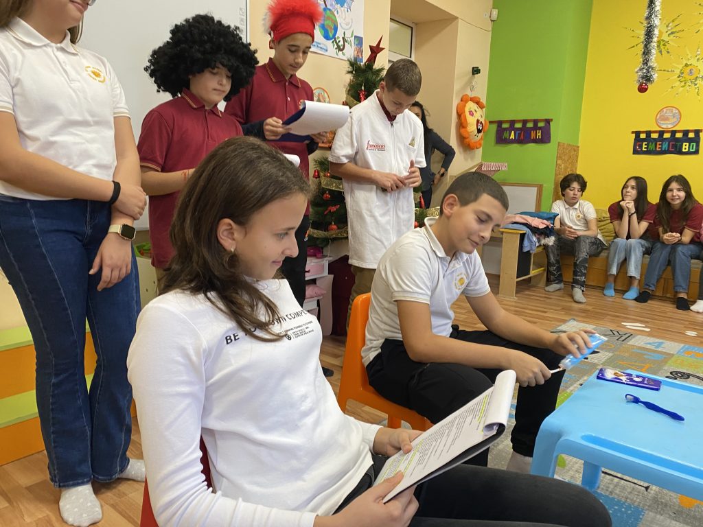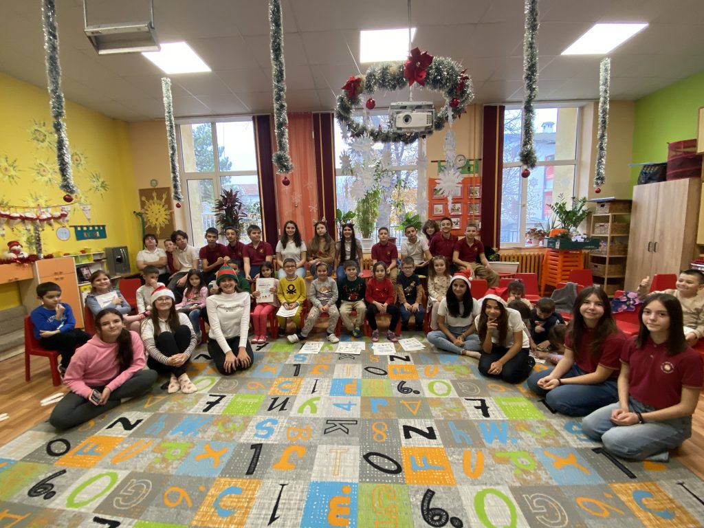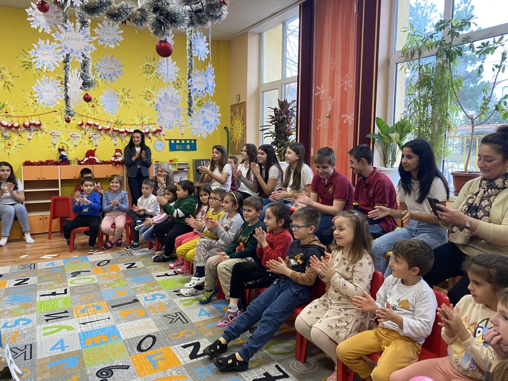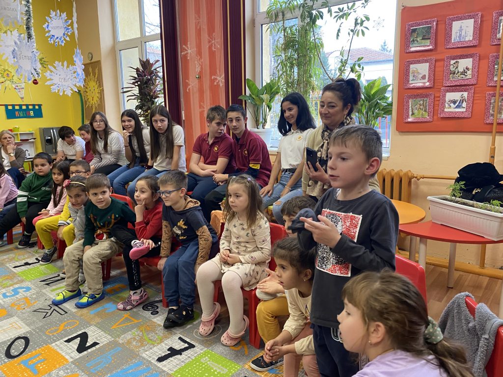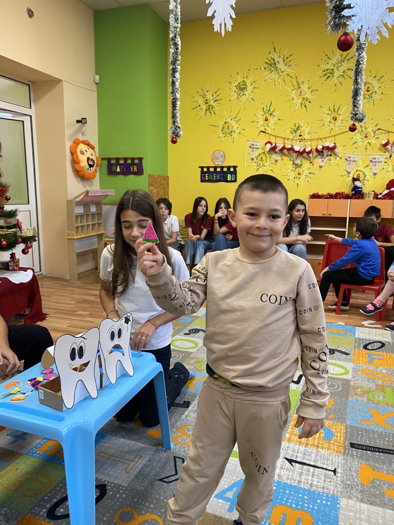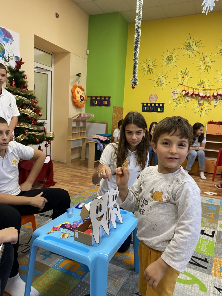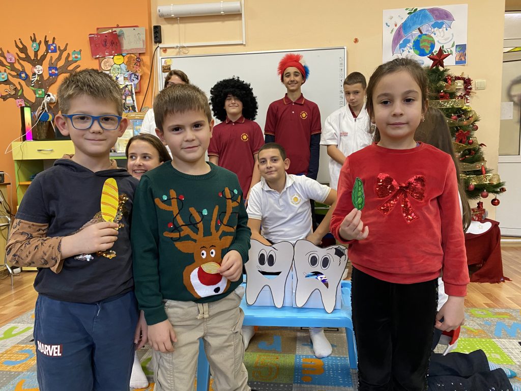 По интересен начин като герои от приказката за „Пук и Чук“, седмокласниците запознаха децата с това, защо трябва да си мием зъбките и ръцете, защо трябва да се къпем всеки ден. За да бъде още по-интересно и забавно на всички малчугани бе подарена образователна книжка „Забавни игри за хигиенни навици за малки и големи“. Книжката е изработена от седмокласниците с помощта на класния ръководител г-жа Калина Йорданова и педагогическия съветник Антоанета Баланова. За добро настроение с настъпването на предстоящите празници момичетата и момчетата поздравиха вече своите приятели с коледни песни. Пожелаха си да бъдат здрави, весели и да се срещнат отново.