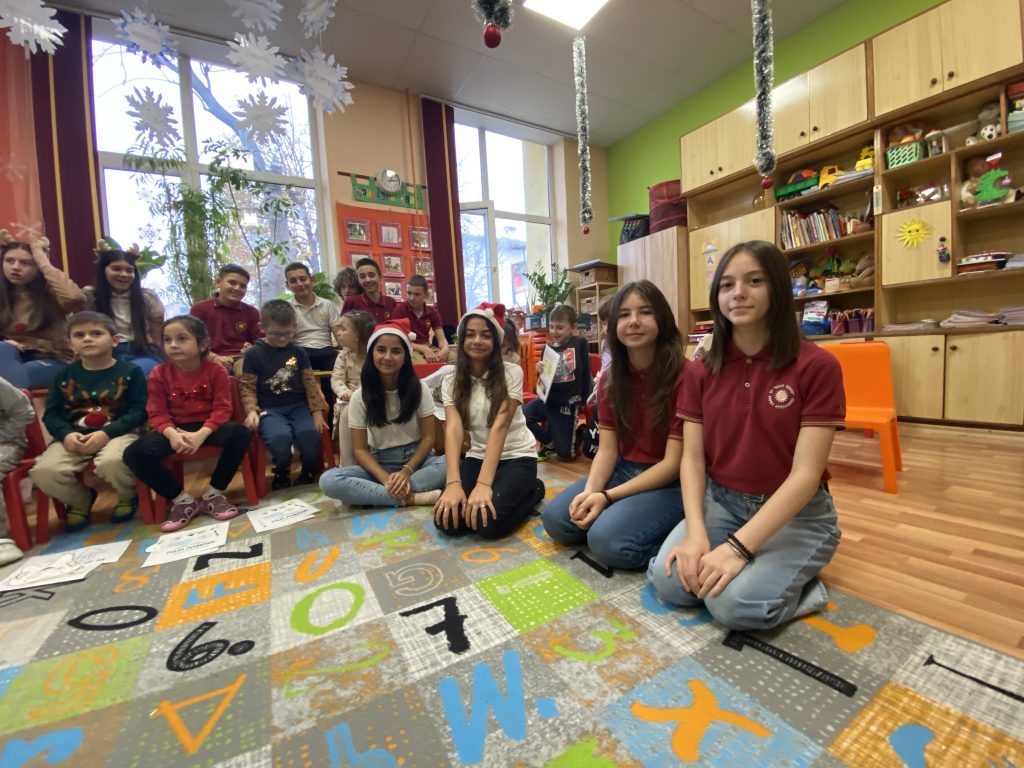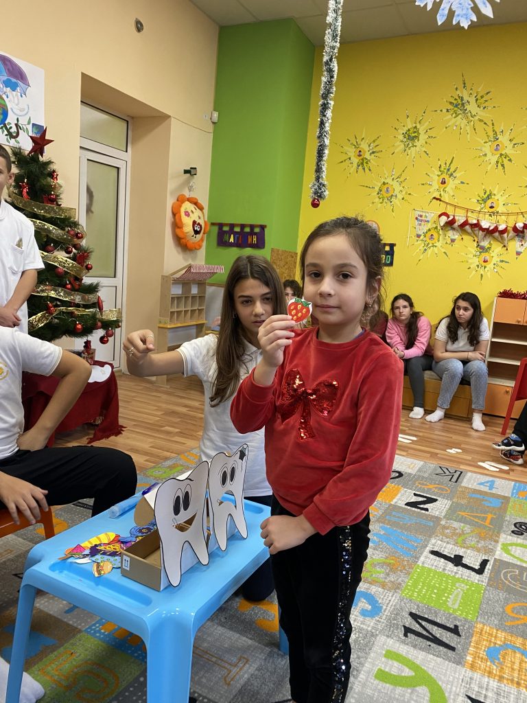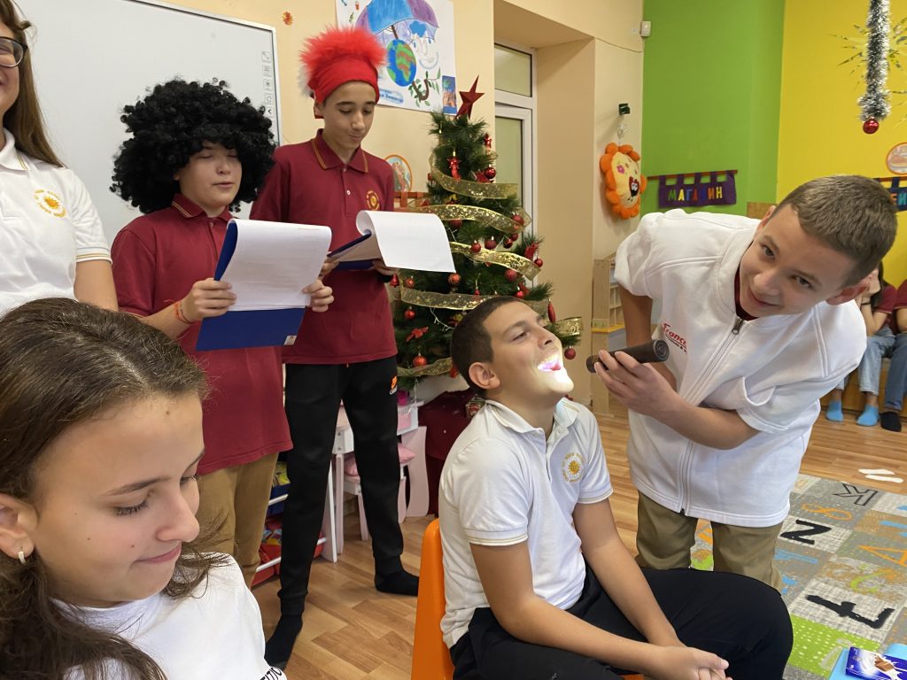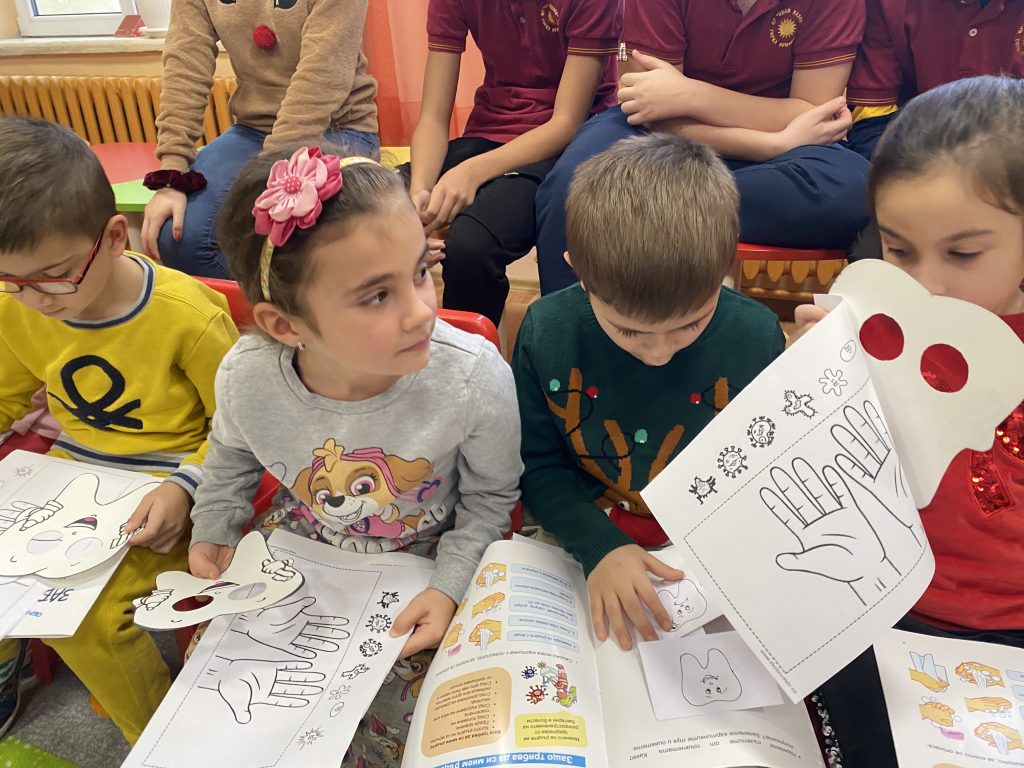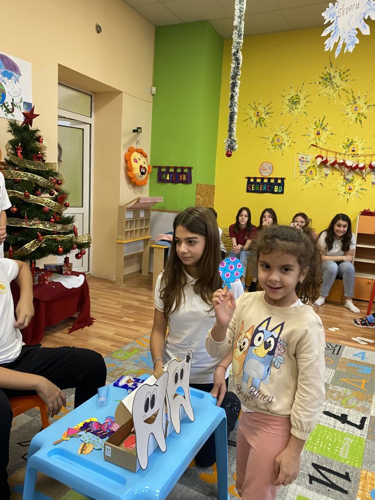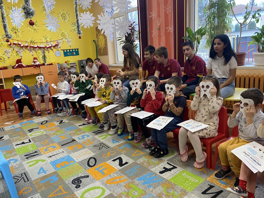 По интересен начин като герои от приказката за „Пук и Чук“, седмокласниците запознаха децата с това, защо трябва да си мием зъбките и ръцете, защо трябва да се къпем всеки ден. За да бъде още по-интересно и забавно на всички малчугани бе подарена образователна книжка „Забавни игри за хигиенни навици за малки и големи“. Книжката е изработена от седмокласниците с помощта на класния ръководител г-жа Калина Йорданова и педагогическия съветник Антоанета Баланова. За добро настроение с настъпването на предстоящите празници момичетата и момчетата поздравиха вече своите приятели с коледни песни. Пожелаха си да бъдат здрави, весели и да се срещнат отново.