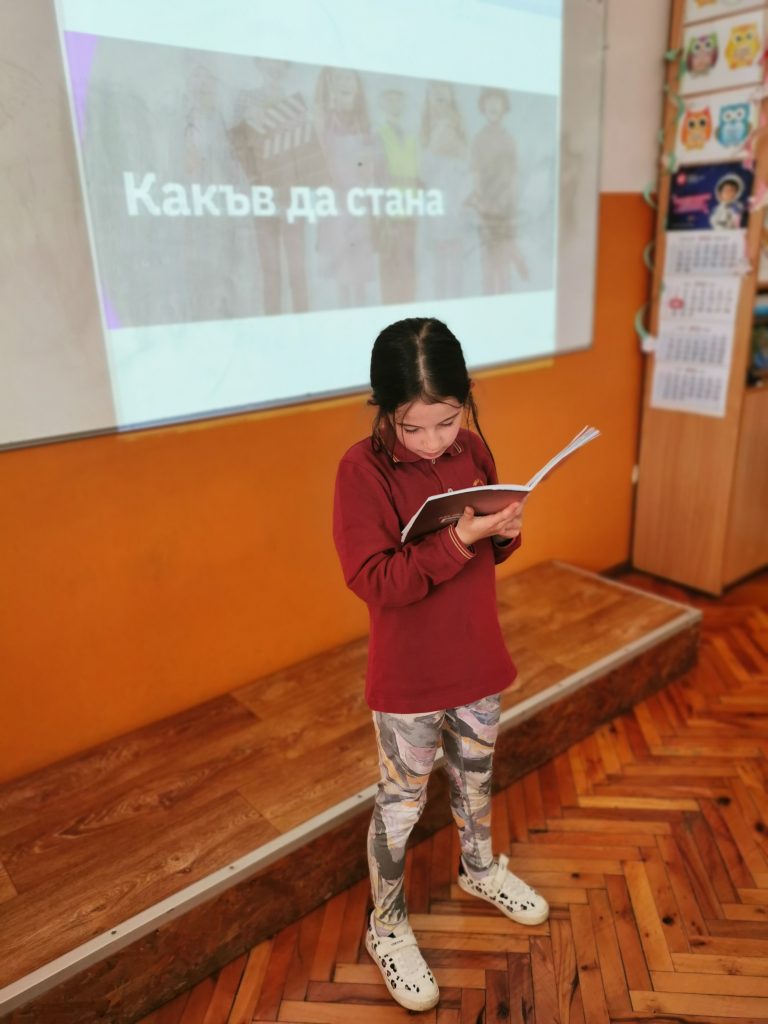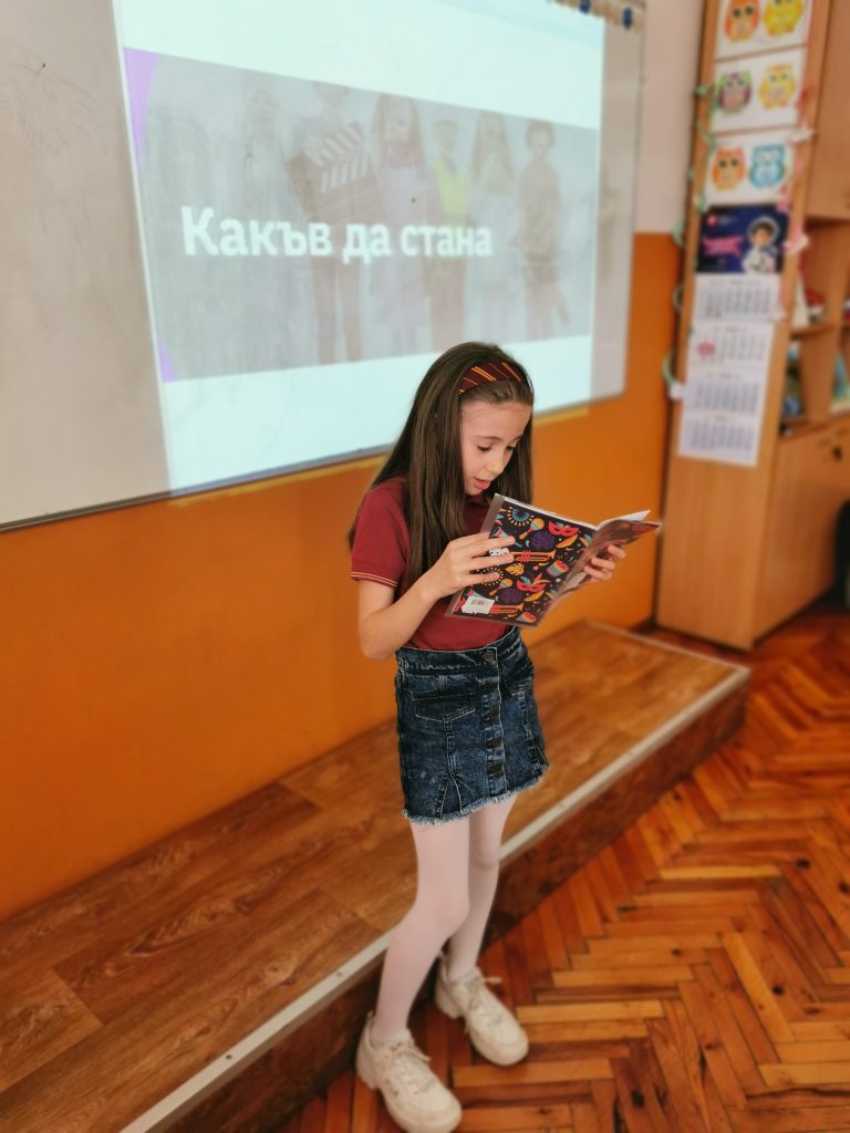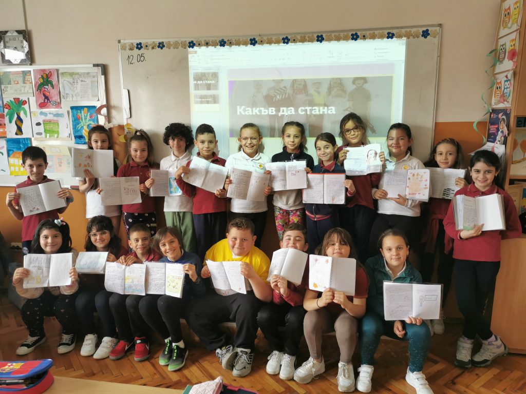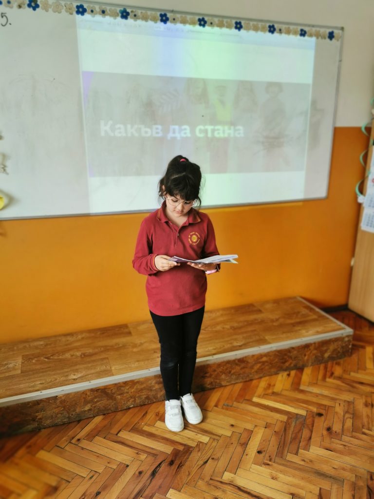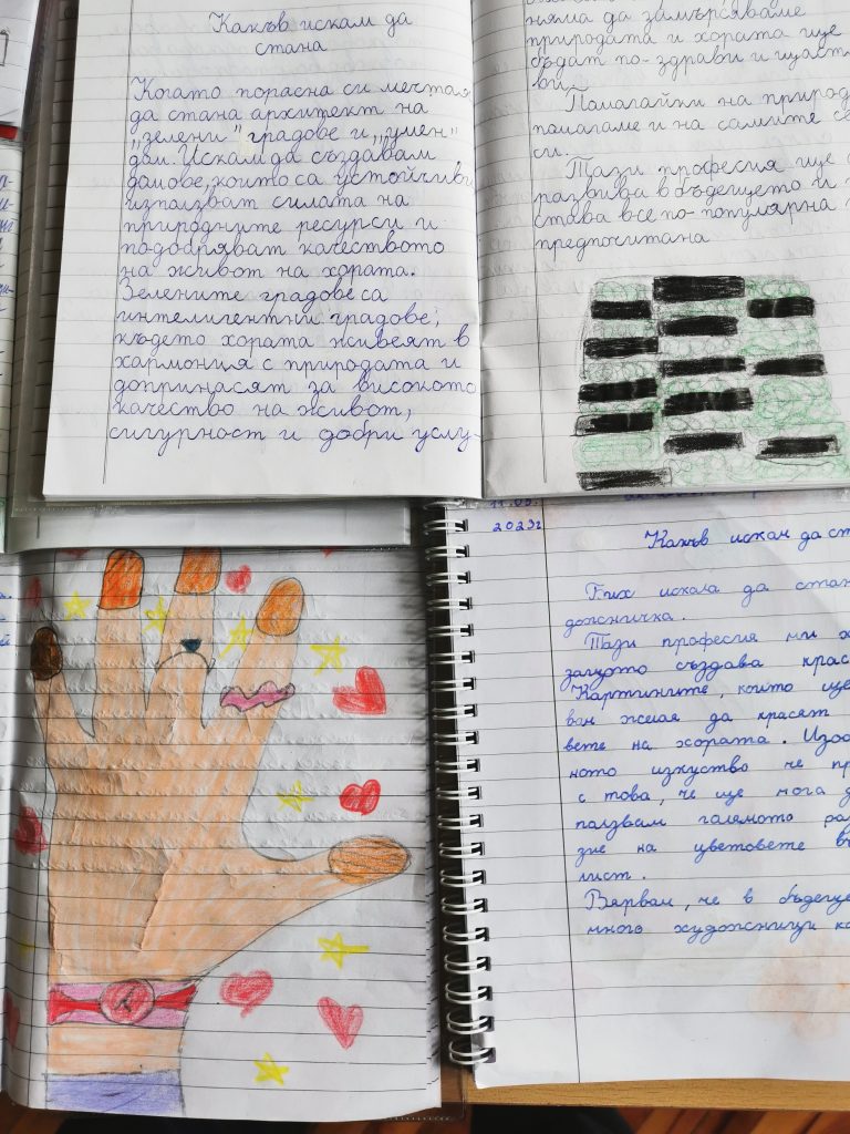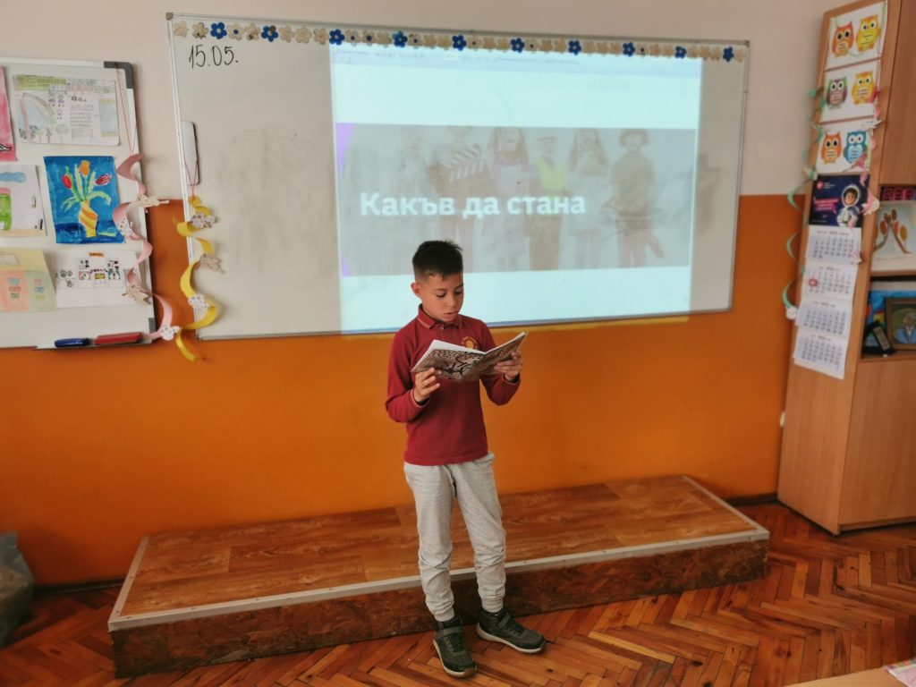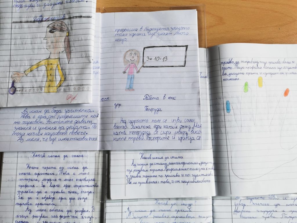 Децата от II“А“ клас с кл.р-л Лидия Минчева проведоха интересен и изпълнен с положителни емоции час, в които всеки описа, рисува и сподели как вижда себе си, когато порасне, за каква професия мечтае, как е направил този избор, какви занимания и лични постижения си представя. Те знаят, че без упорит труд мечтите никога няма да се сбъднат, а професията трябва да носи удоволствие за работещия и полза за хората. Така те си пожелаха най-доброто бъдеще!