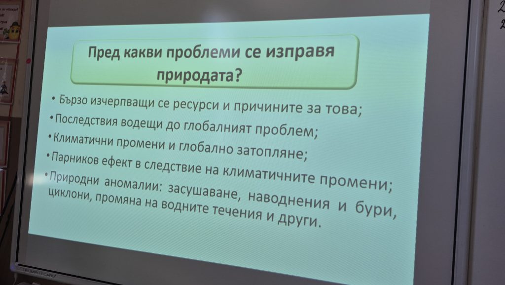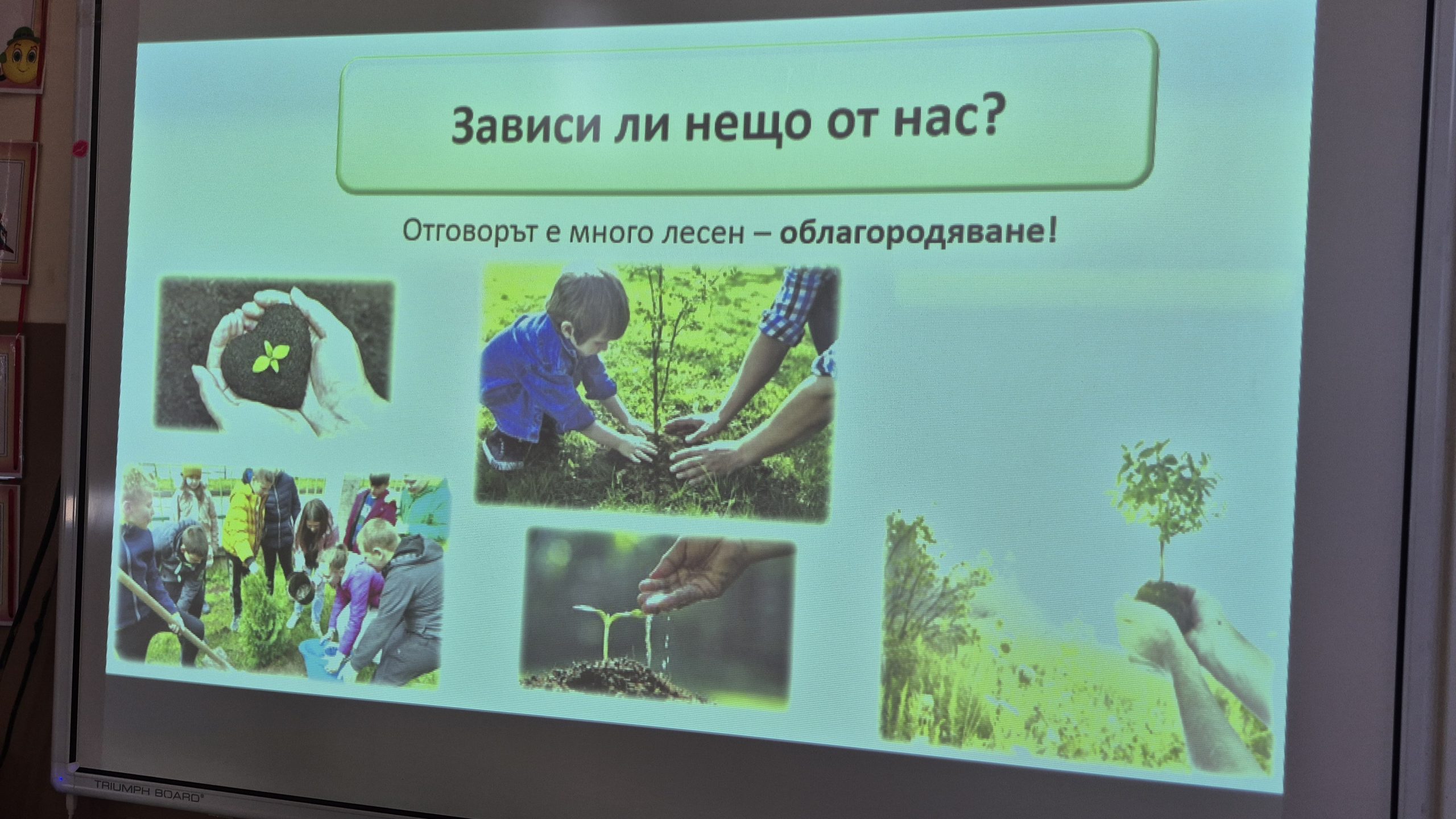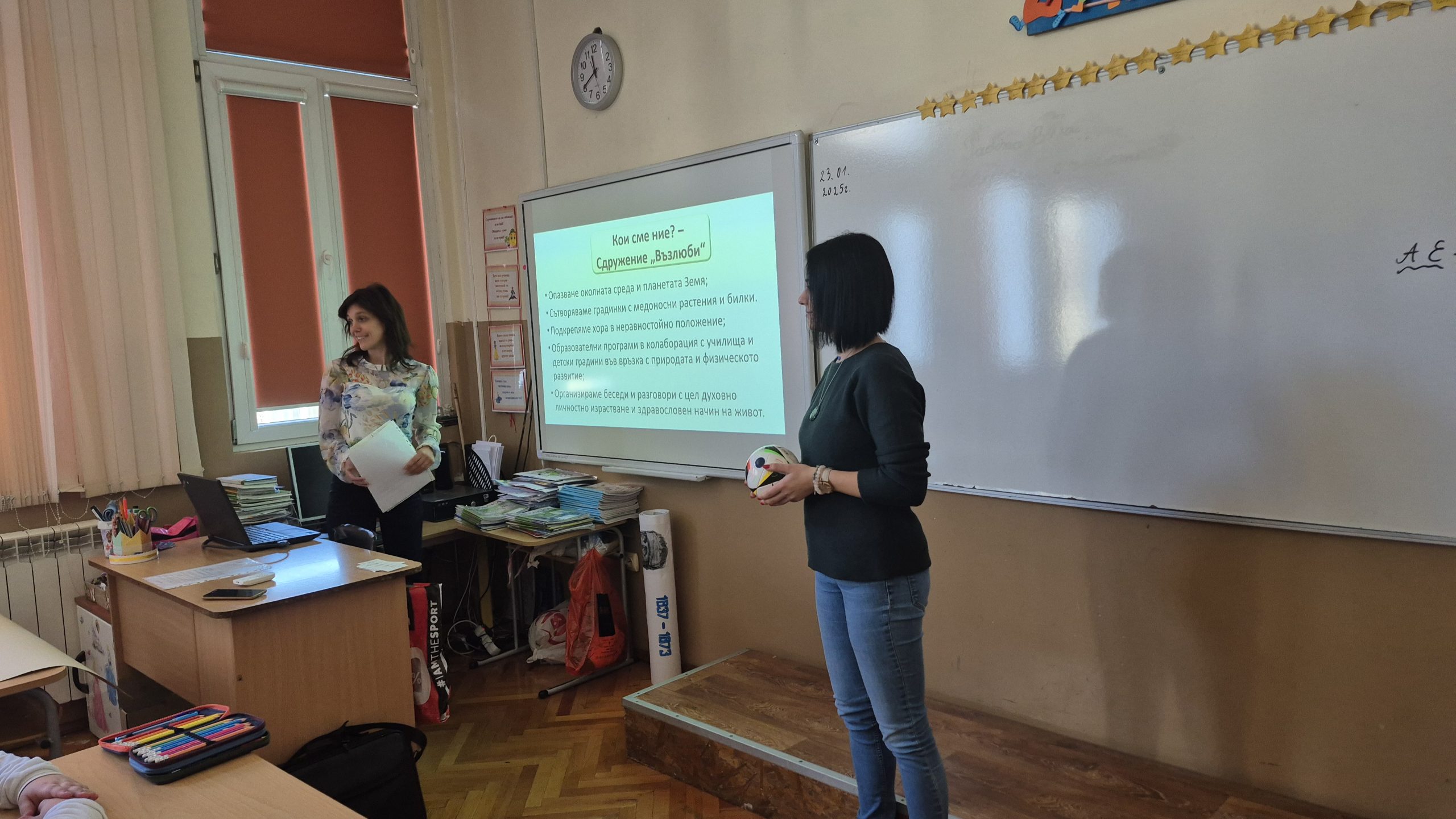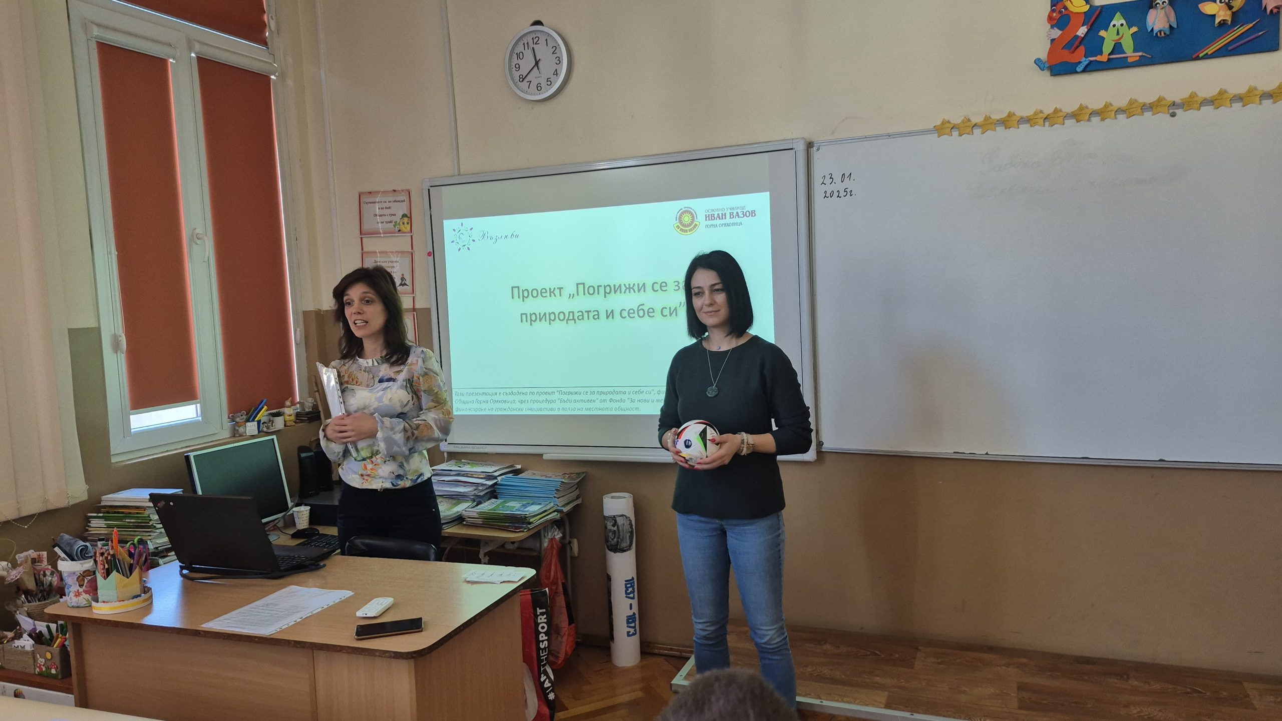 На 23 януари 2025 г. се проведе първата съвместна инициатива, която включваше посещение във 2„а“ клас, с класен ръководител госпожа Розалия Нанкова. Учениците се запознаха с важността за опазването на природата чрез интерактивна презентация, която обхващаше теми свързани със замърсяването, значението на залесяването, видовете билки и ролята на пчелите в екосистемата.