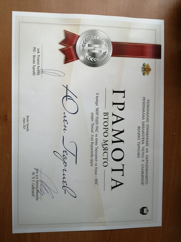 По повод 145-годишнина от избухването на Априлското въстание Регионално управление на образованието и Регионална библиотека „П. Р. Славейков”, Велико Търново обявиха конкурс за детско-юношеско творчество под наслов „Моят роден град” на тема „Героизмът на Април – 1876 година”. Юлен Георгиев от 7б клас се включи в конкурса със стихотворението си „Горна Оряховица – 1876”.
