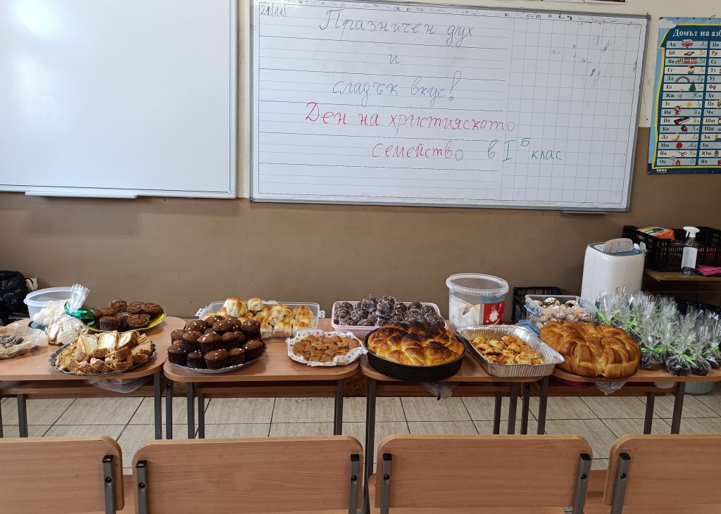 В класната стая на 1. „Б“ клас цареше истински празник по повод Деня на християнското семейство. На масата бяха подредени разнообразни вкусни домашни сладкиши, приготвени с много любов от семействата на учениците.Всеки ученик презентира пред своите съученици своята вкусотия, направена заедно с родителите, и сподели как е създаден неговият сладък подарък за празника.Ароматът, усмивките и споделената радост изпълниха стаята с топлина. Малките първокласници си тръгнаха с най-важния урок – че семейството е най-ценното богатство, което човек притежава.