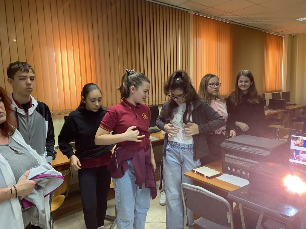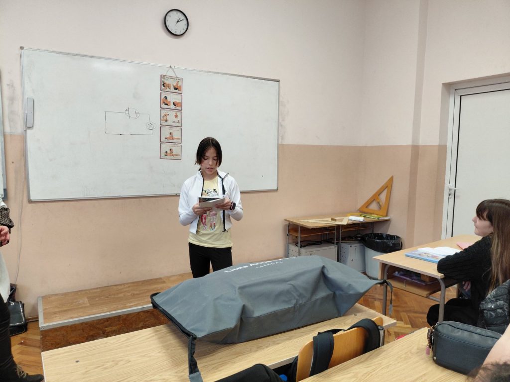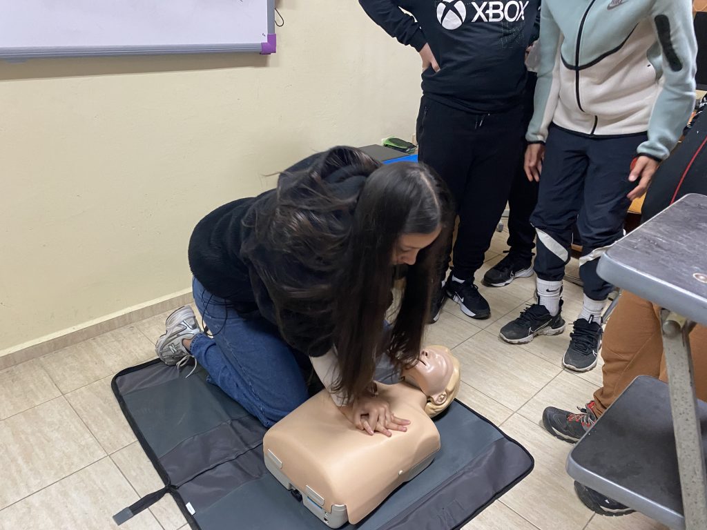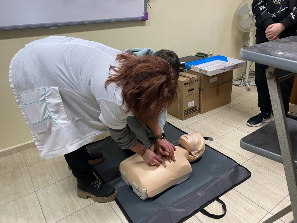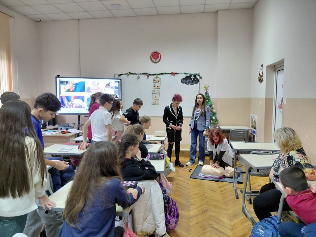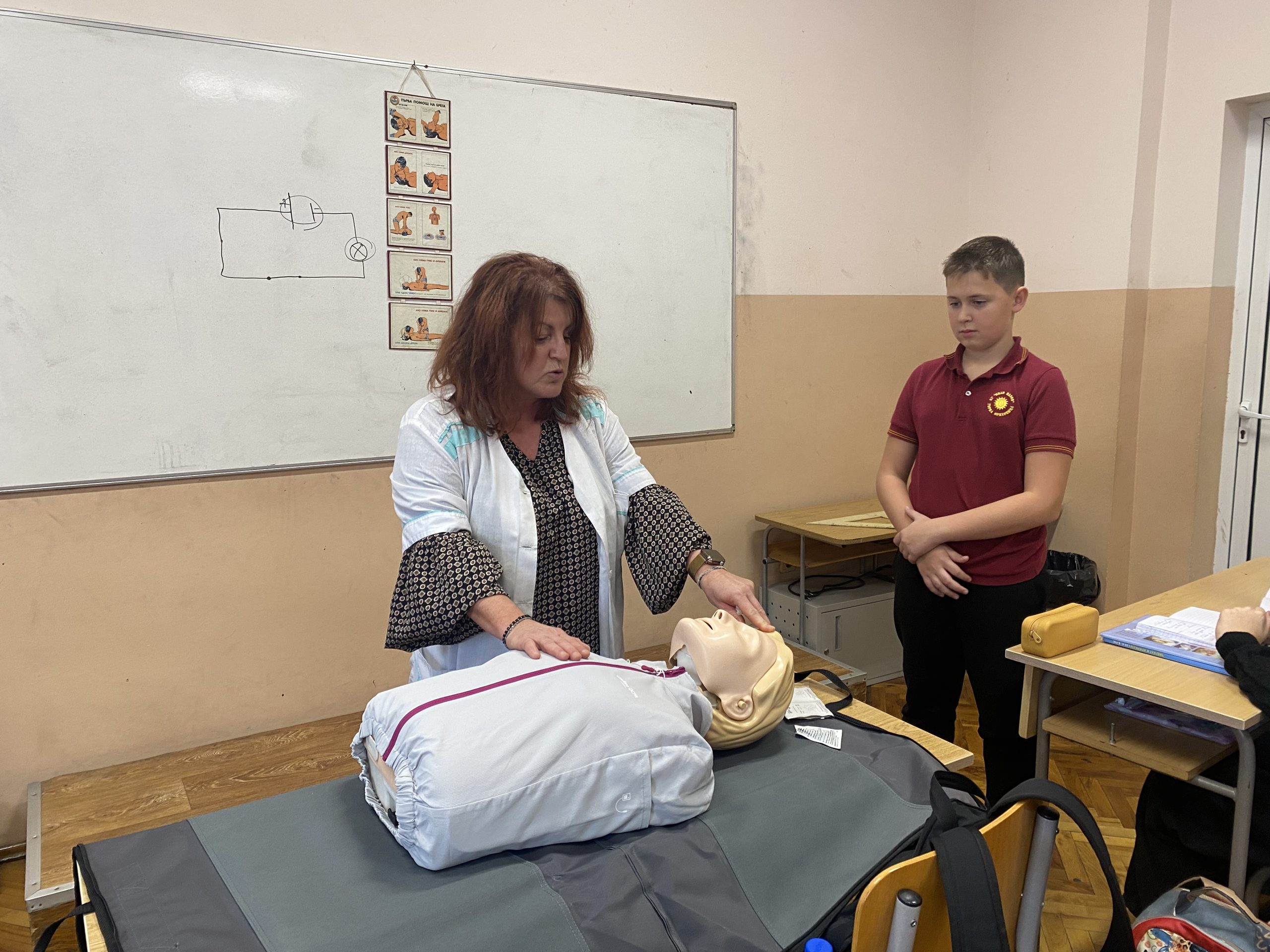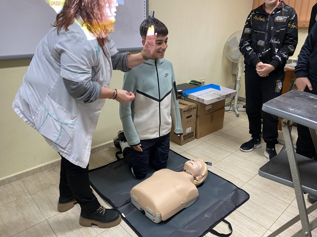 Във втората част на урока вниманието беше насочено към темата за токовия удар и действията при инцидент. Учениците обсъдиха какво представлява токовият удар, кои ситуации крият риск и какви са последователните стъпки за оказване на първа помощ. Съдействие оказа медицинската сестра на училището, която демонстрира как се оказва помощ на пострадал при изгаряне и липса на дишане и пулс. С помощта на специален манекен тя показа как правилно се извършва сърдечен масаж – кардиопулмонална ресусцитация, комбинирана с изкуствено дишане. Всеки от учениците имаше възможност лично да приложи наученото, като упражни сърдечен масаж върху манекен под ръководството на учителите и медицинската сестра. Демонстрацията помогна на шестокласниците да осъзнаят значението на бързата и адекватна реакция в критични ситуации.