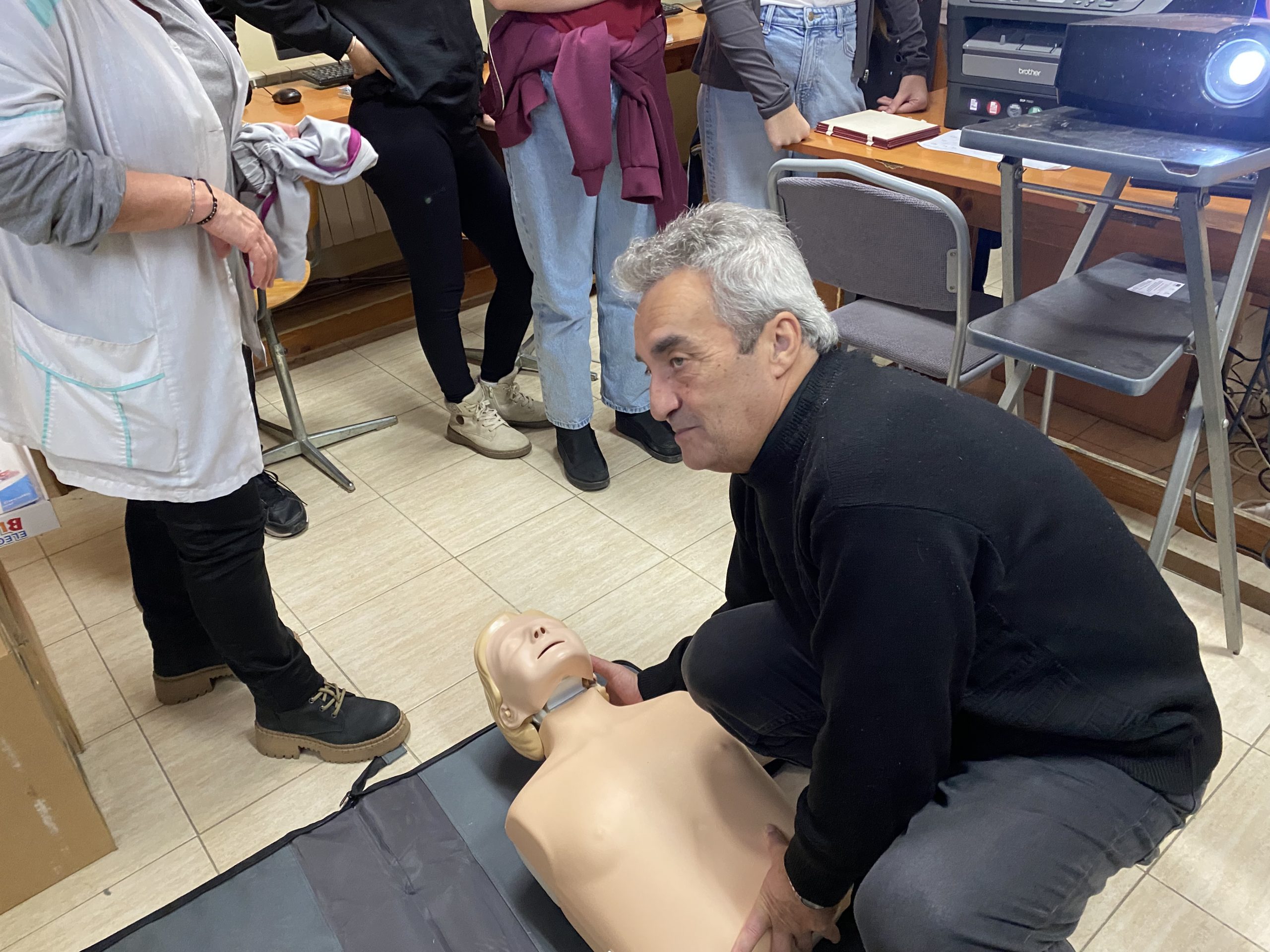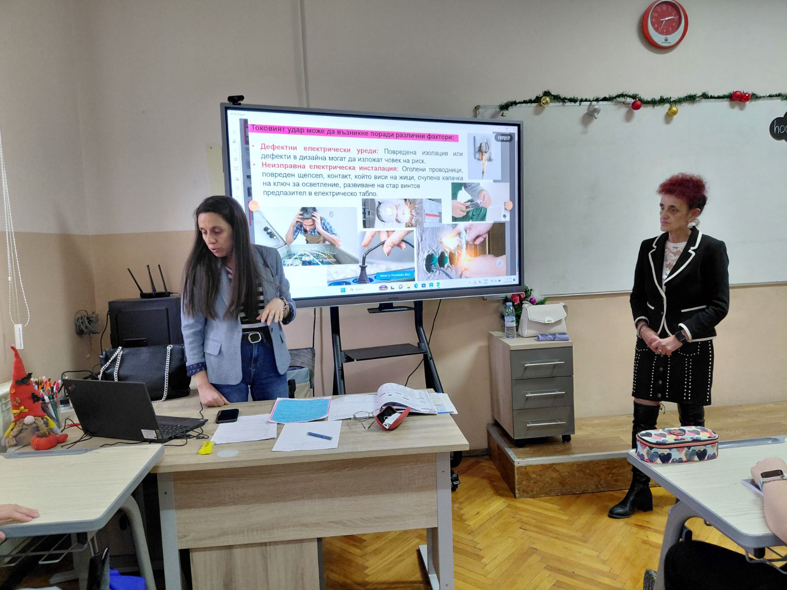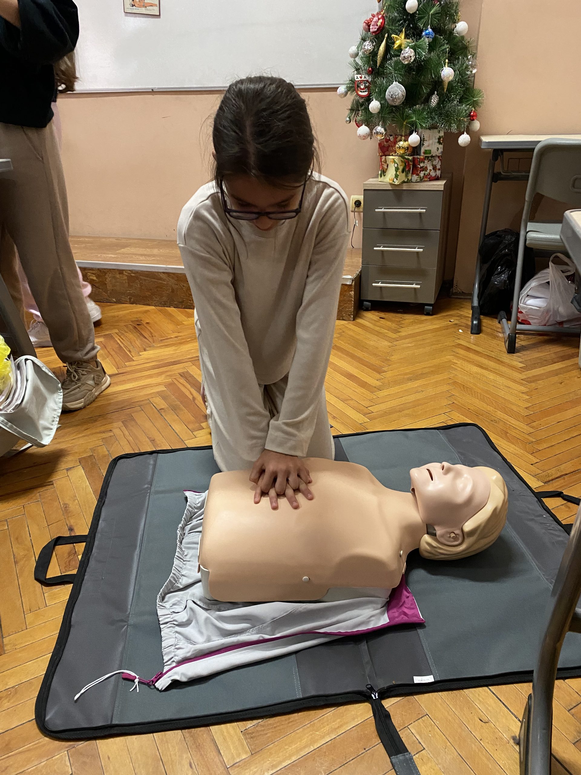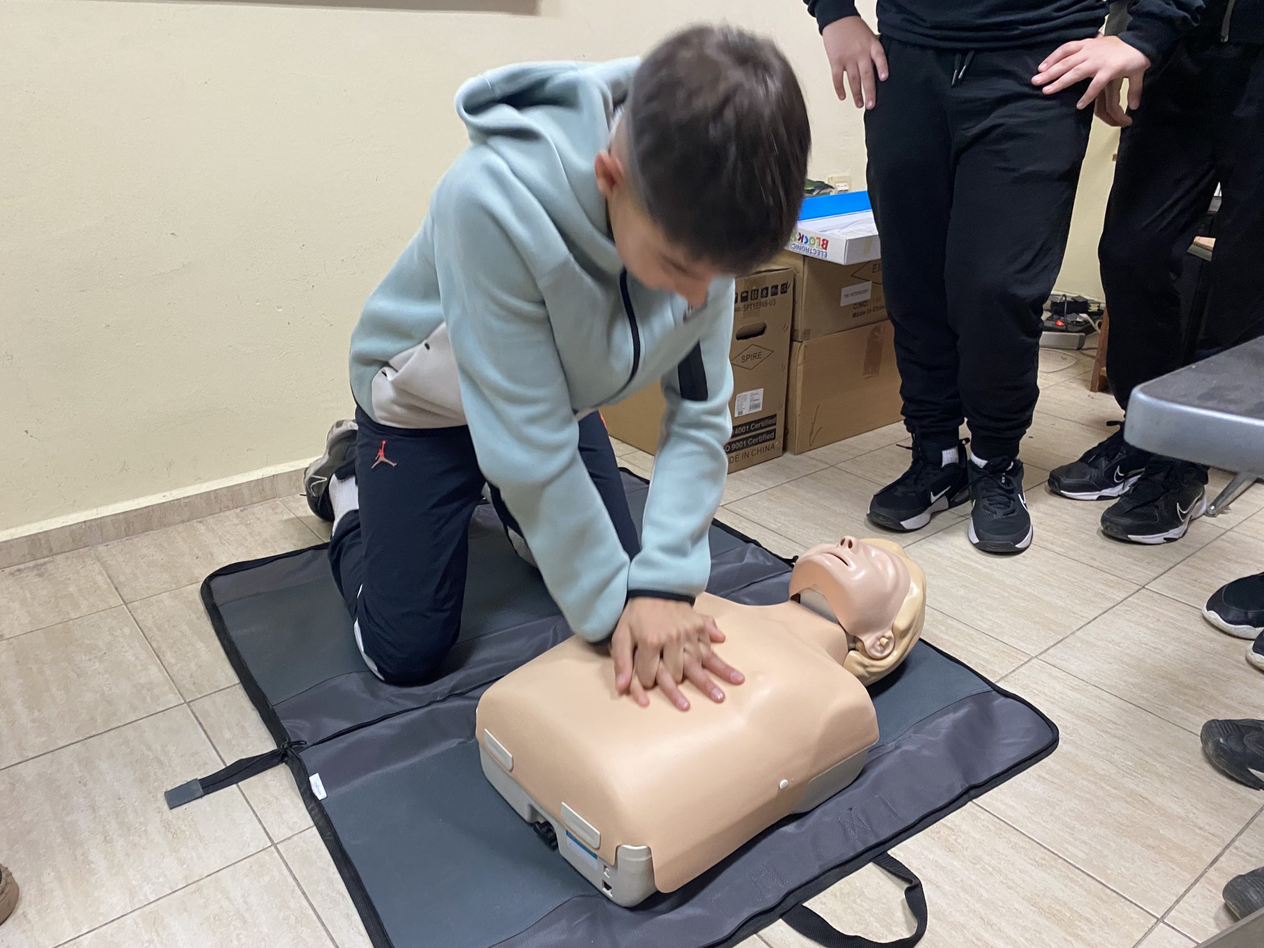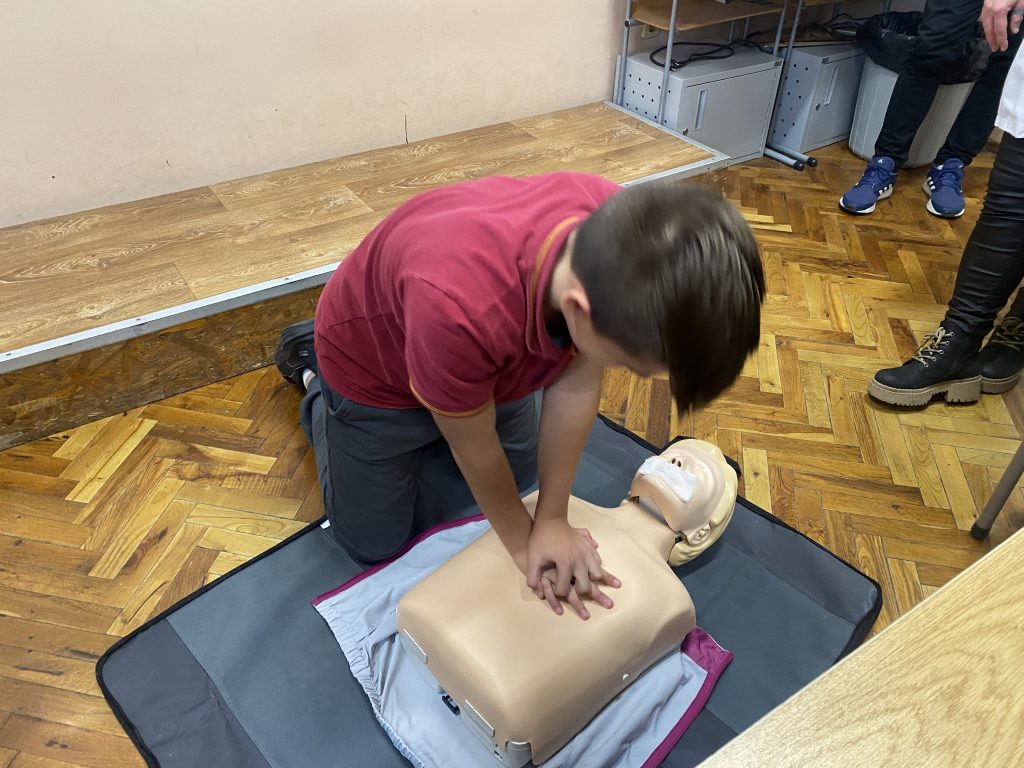 Във втората част на урока вниманието беше насочено към темата за токовия удар и действията при инцидент. Учениците обсъдиха какво представлява токовият удар, кои ситуации крият риск и какви са последователните стъпки за оказване на първа помощ. Съдействие оказа медицинската сестра на училището, която демонстрира как се оказва помощ на пострадал при изгаряне и липса на дишане и пулс. С помощта на специален манекен тя показа как правилно се извършва сърдечен масаж – кардиопулмонална ресусцитация, комбинирана с изкуствено дишане. Всеки от учениците имаше възможност лично да приложи наученото, като упражни сърдечен масаж върху манекен под ръководството на учителите и медицинската сестра. Демонстрацията помогна на шестокласниците да осъзнаят значението на бързата и адекватна реакция в критични ситуации.