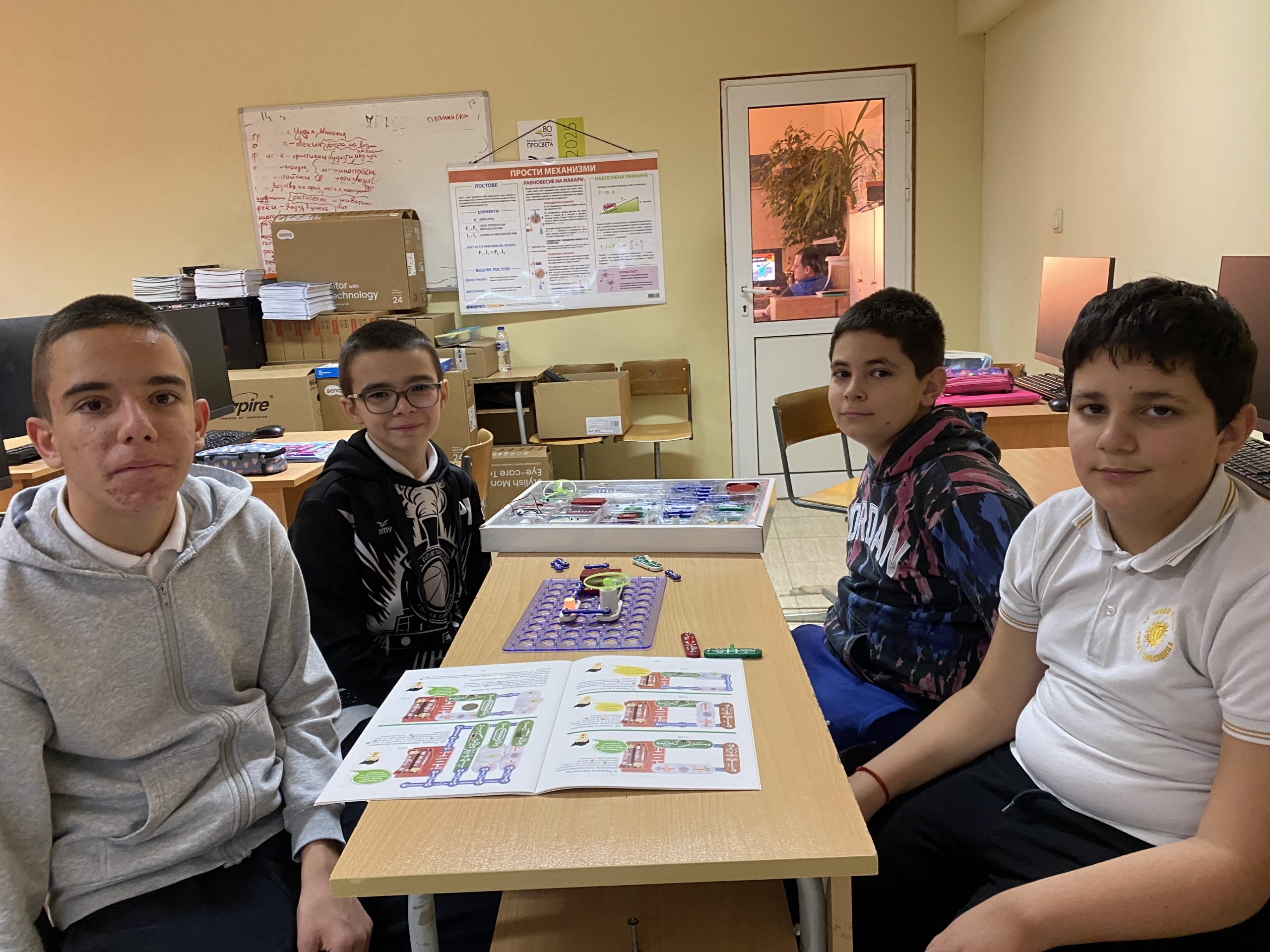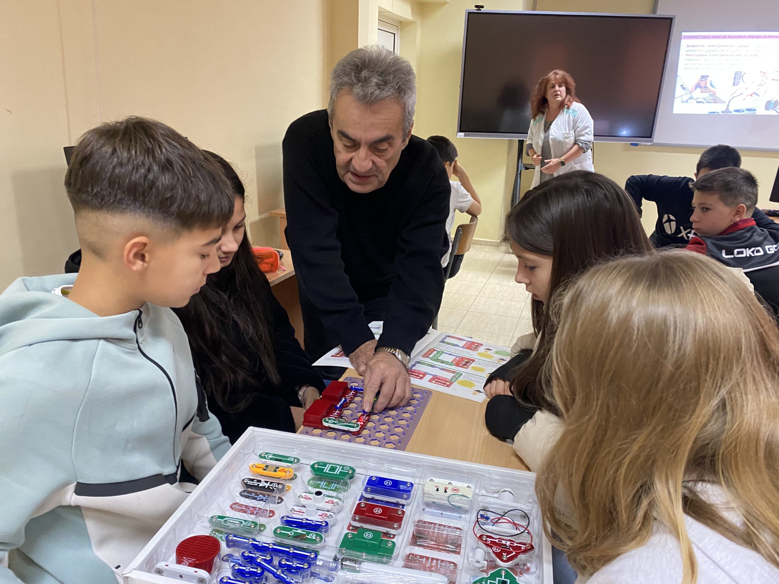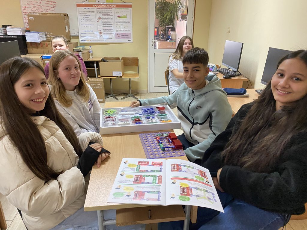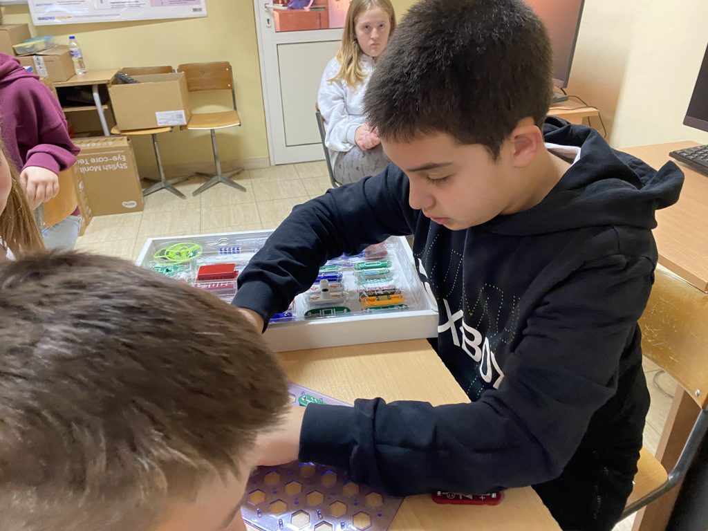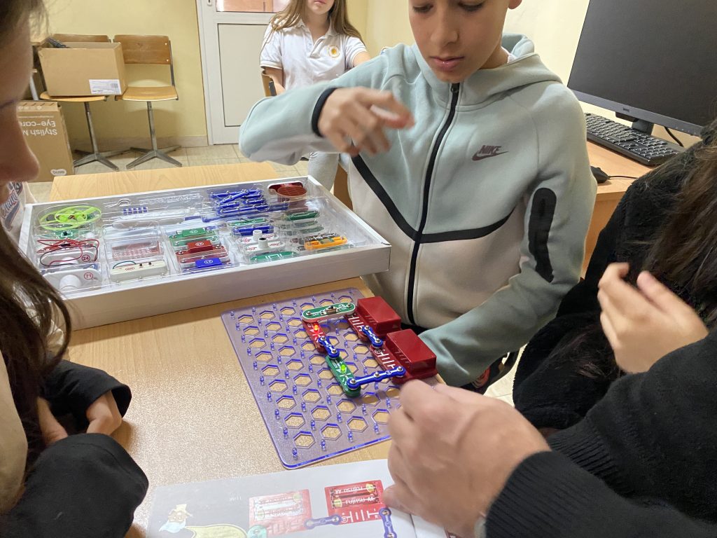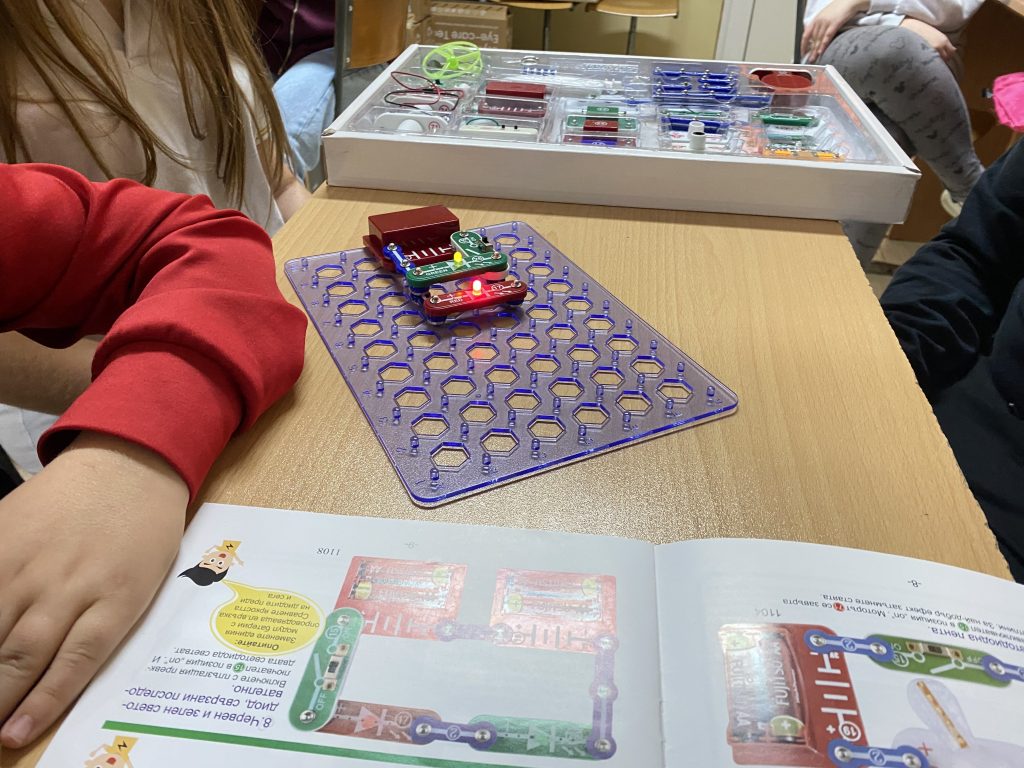 В първата част на урока шестокласниците работиха с образователен комплект, който позволява безопасно експериментиране с основите на електричеството. Учениците изграждаха реални електрически вериги, използвайки различни компоненти – проводници, крушки, мотори, радио и други елементи. Те изследваха последователни и паралелни връзки и затвърдиха знанията си за принципите на електричния ток и напрежението чрез практически дейности.