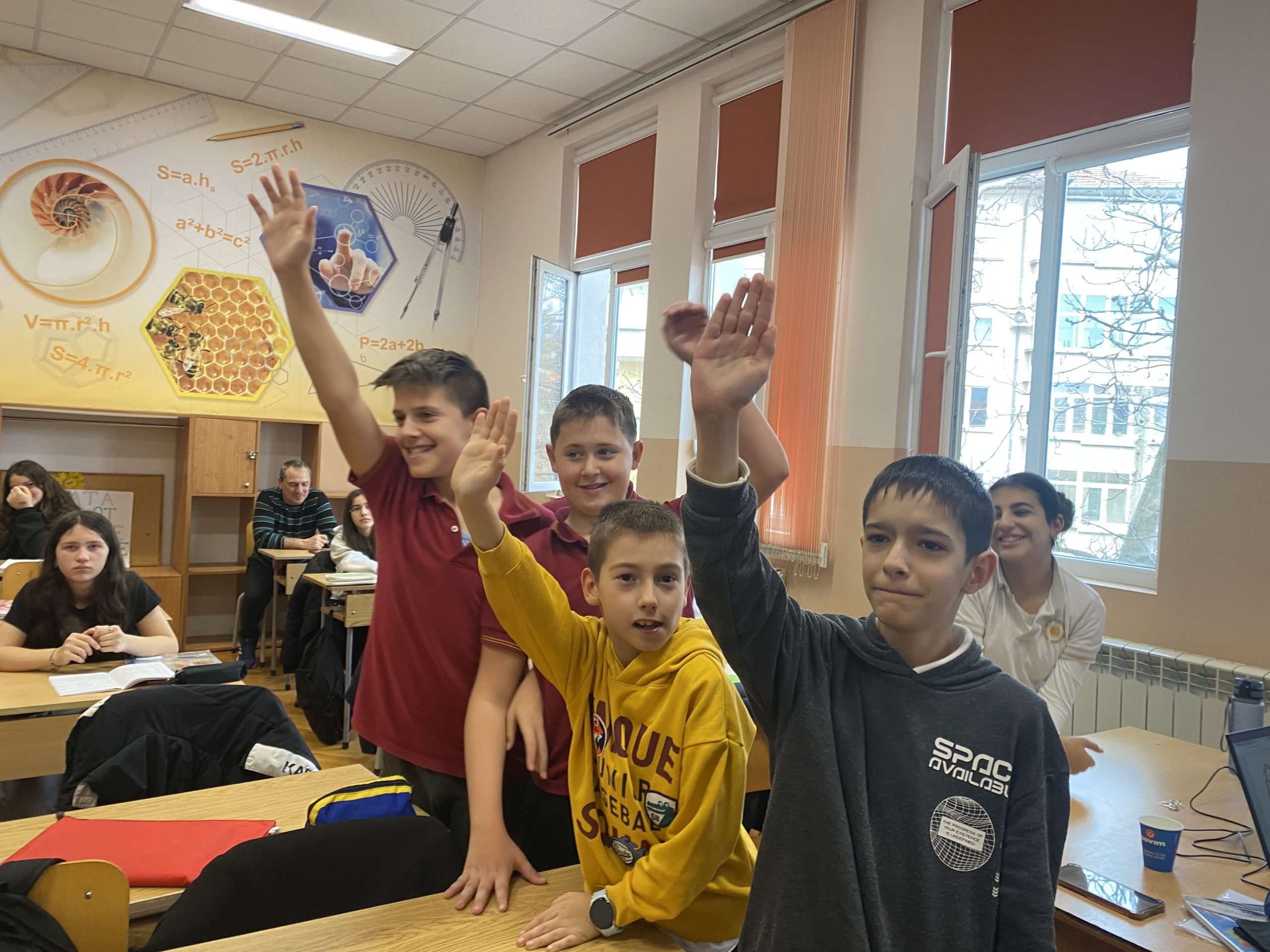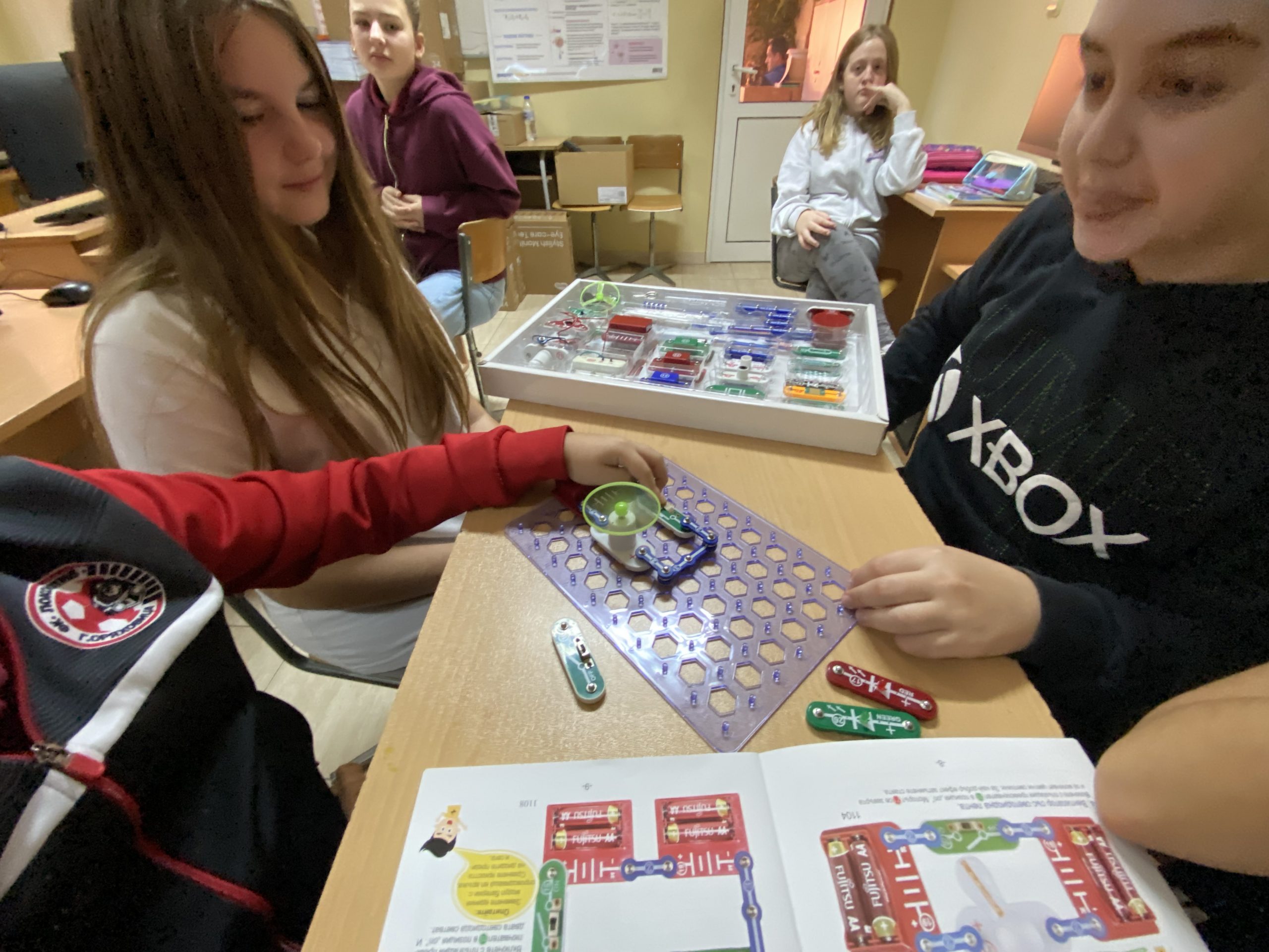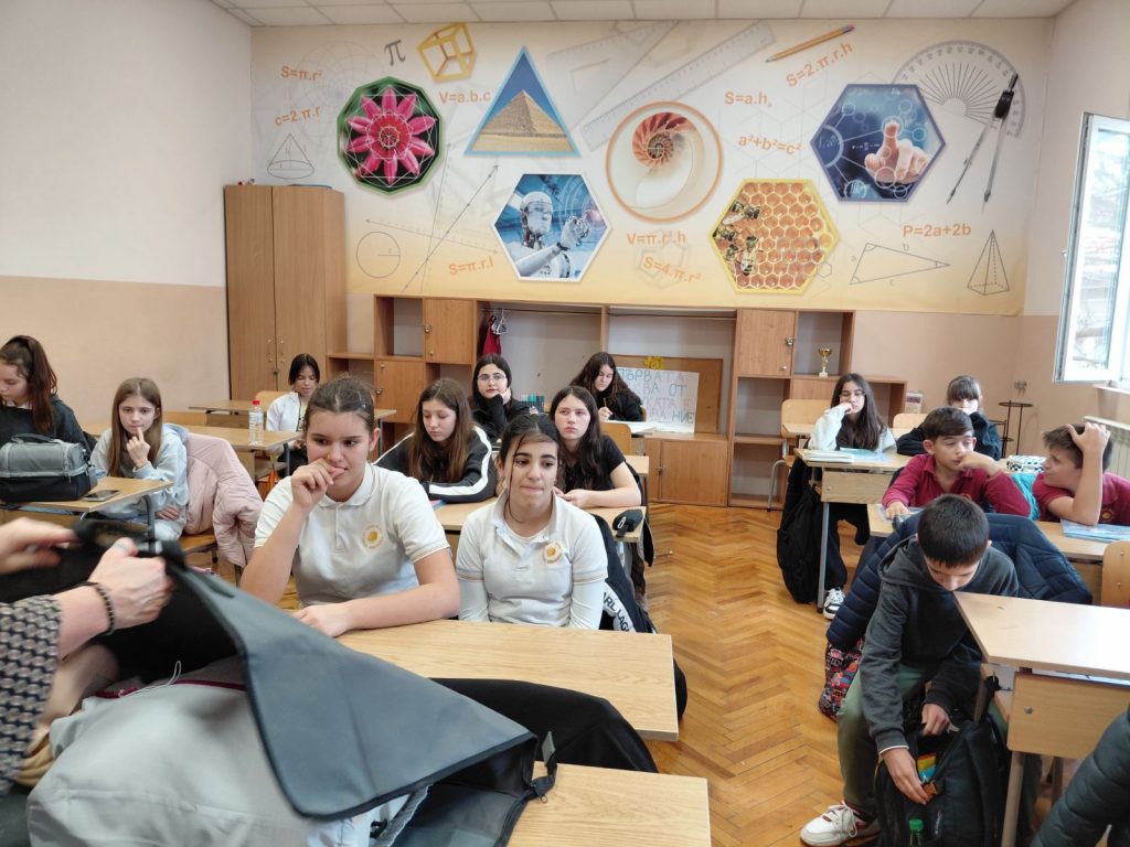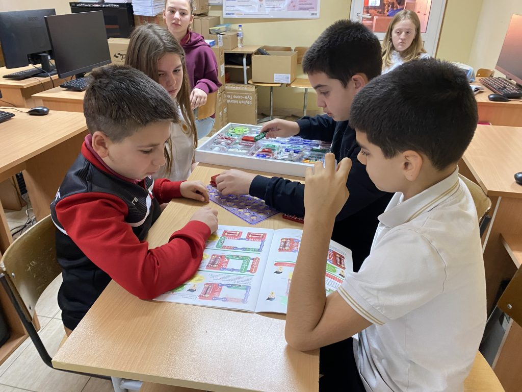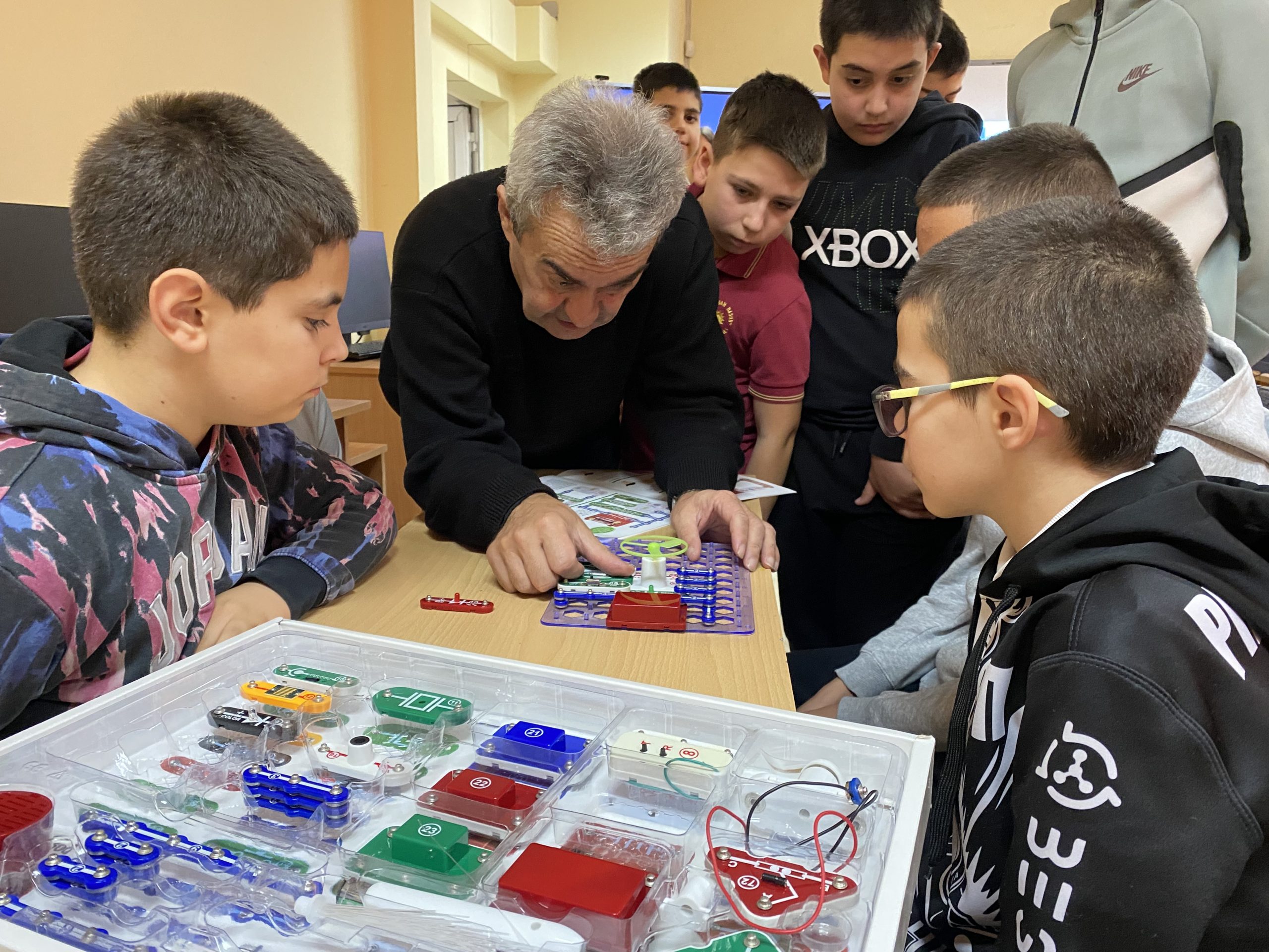 В първата част на урока шестокласниците работиха с образователен комплект, който позволява безопасно експериментиране с основите на електричеството. Учениците изграждаха реални електрически вериги, използвайки различни компоненти – проводници, крушки, мотори, радио и други елементи. Те изследваха последователни и паралелни връзки и затвърдиха знанията си за принципите на електричния ток и напрежението чрез практически дейности.