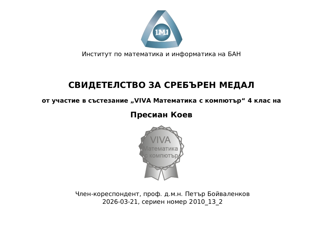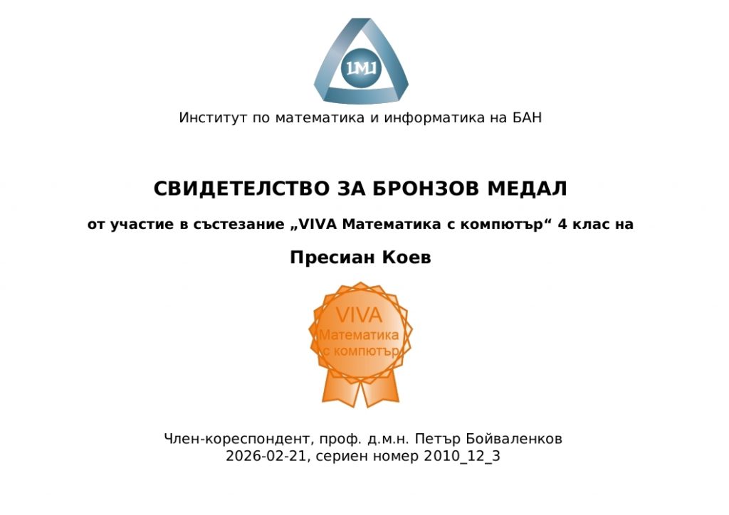 Пореден успех на нашия възпитаник Пресиан Коев от 4 „А“ клас. В престижното състезание „VIVA Математика с компютър“, той завоюва два медала – сребърен и бронзов, демонстрирайки завидни умения в съчетаването на математическата логика и съвременните технологии.
