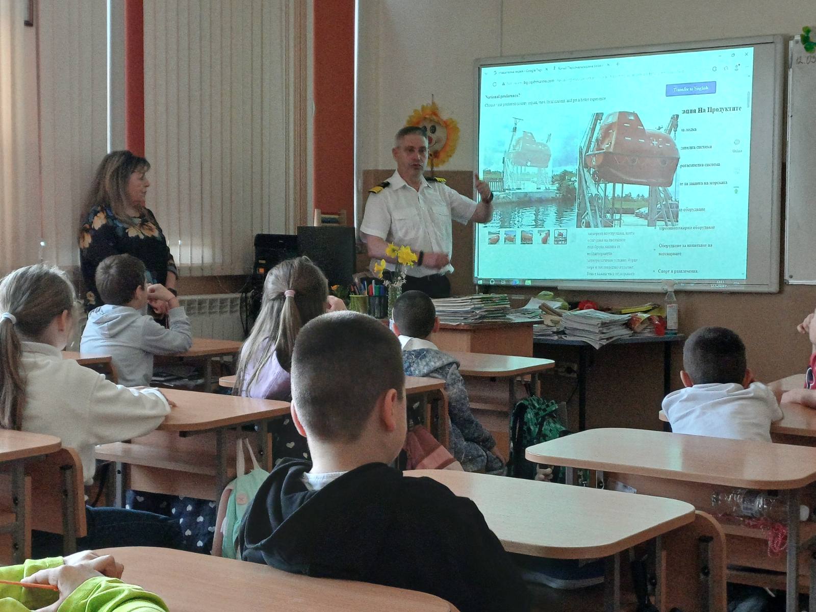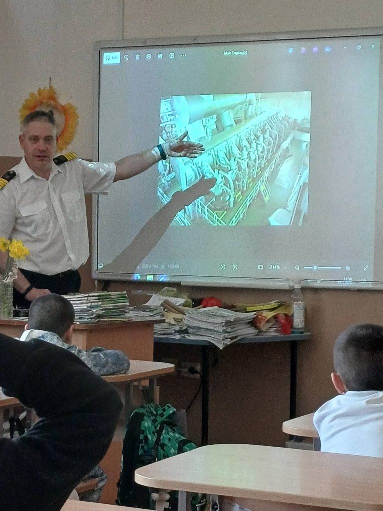 Срещата започна с малка провокация. Г-н Атанасов прочете писмо на дете на 9 години от Швеция, което пише защо иска да стане капитан на кораб. Според него един капитан не е нужно да учи нищо, почива си, посещава различни държави и не работи много. Със своя разказ г-н Атанасов опроверга илюзията на детето. Той представи презентацията „Професията капитан на кораб”. Показа на децата снимки на различни кораби, разказа много увлекателно каква е работата на един капитан, колко много са неговите отговорности и колко много години учене са необходими, за да се постигне тази позиция. Самият той е завършил Висше военноморско училище във Варна. С внимание разказа на децата за своята работа, за живота на кораба, за приятните и не толкова приятните особености на тази професия. Особен акцент в беседата беше необходимостта от отлично владеене на математика и английски език и учене през целия живот.