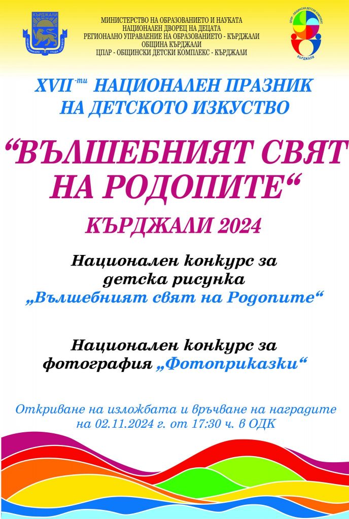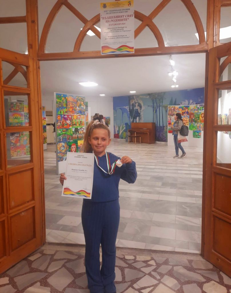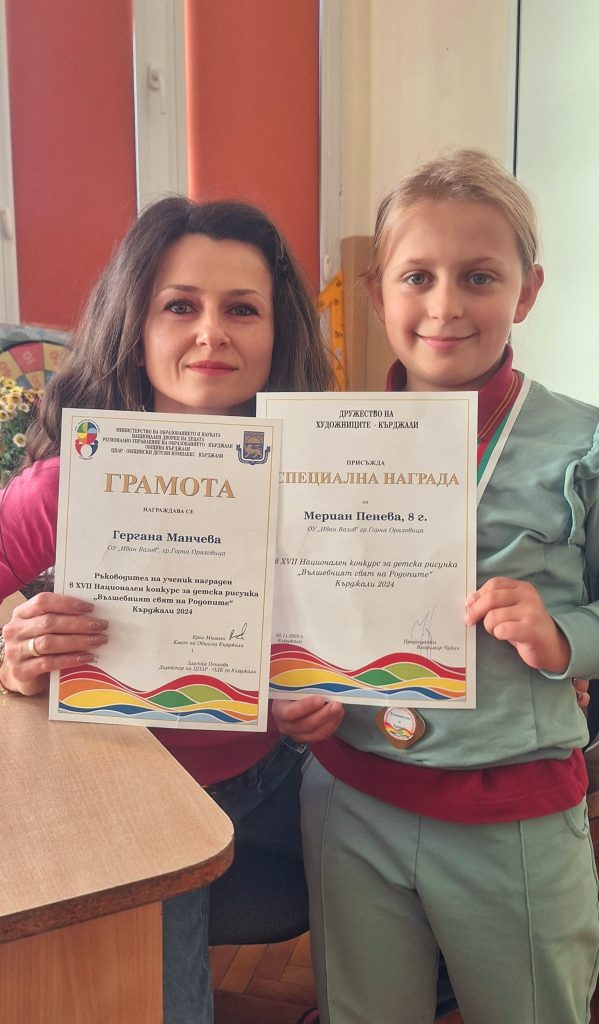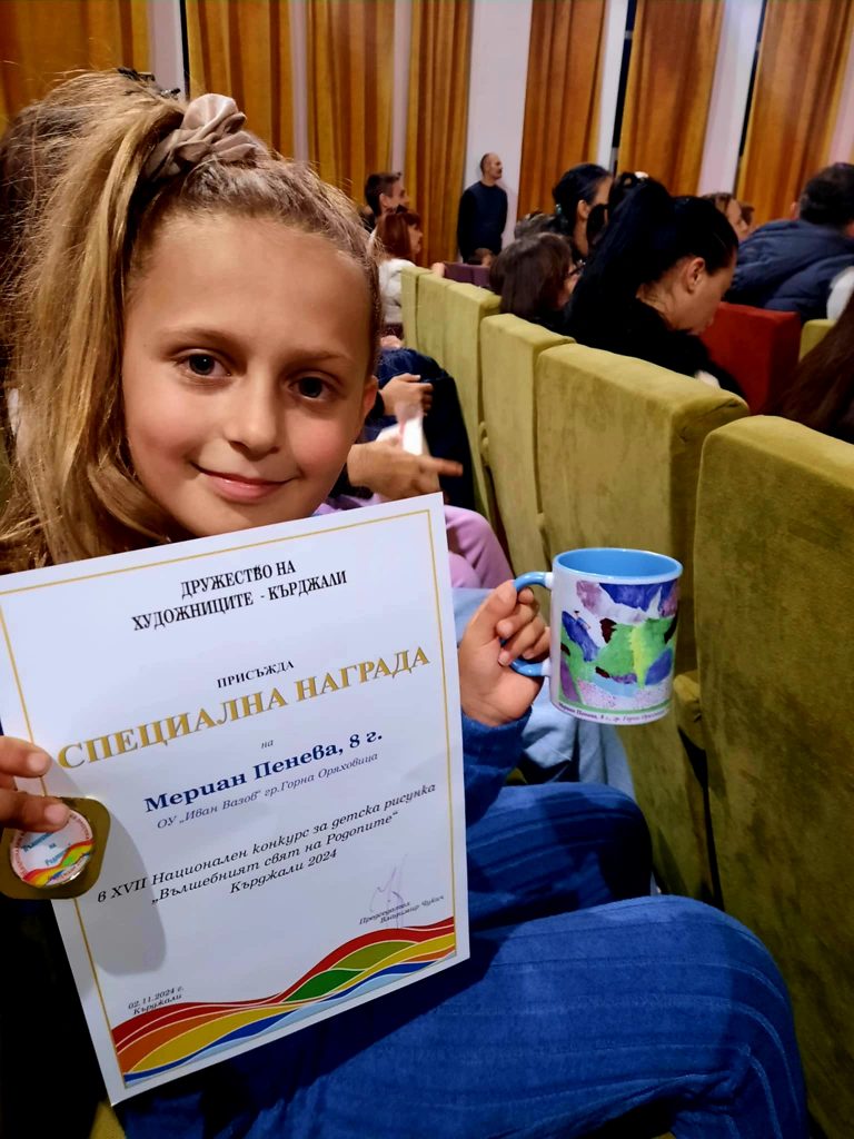 На 2 ноември 2024 г. в Общински детски комплекс гр. Кърджали се проведе официалната церемония за откриване на изложба и връчване на наградите на победителите в седемнадесетото издание на Националния празник на детското изкуство – Кърджали 2024, с включени Национален конкурс за детска рисунка „Вълшебният свят на Родопите” и Национален конкурс за фотография „Фотоприказки”.Ученичката от 2. Б клас – Мериан Пламенова Пенева под ръководството на кл. р-тел Гергана Манчева, спечели специална награда от Дружество на художниците – Кърджали. Тя участва с рисунка на тема свързана с Родопи. От класа участваха четирима ученици, които също показаха своя талант в изобразителното изкуство. Семейството на Мериан лично присъства на връчването на наградата в гр. Кърджали. Г-жа Гергана Манчева също е наградена с грамота и подарък от организацията. Изявите в конкурси продължават, защото учениците имат таланти, които трябва да покажат.