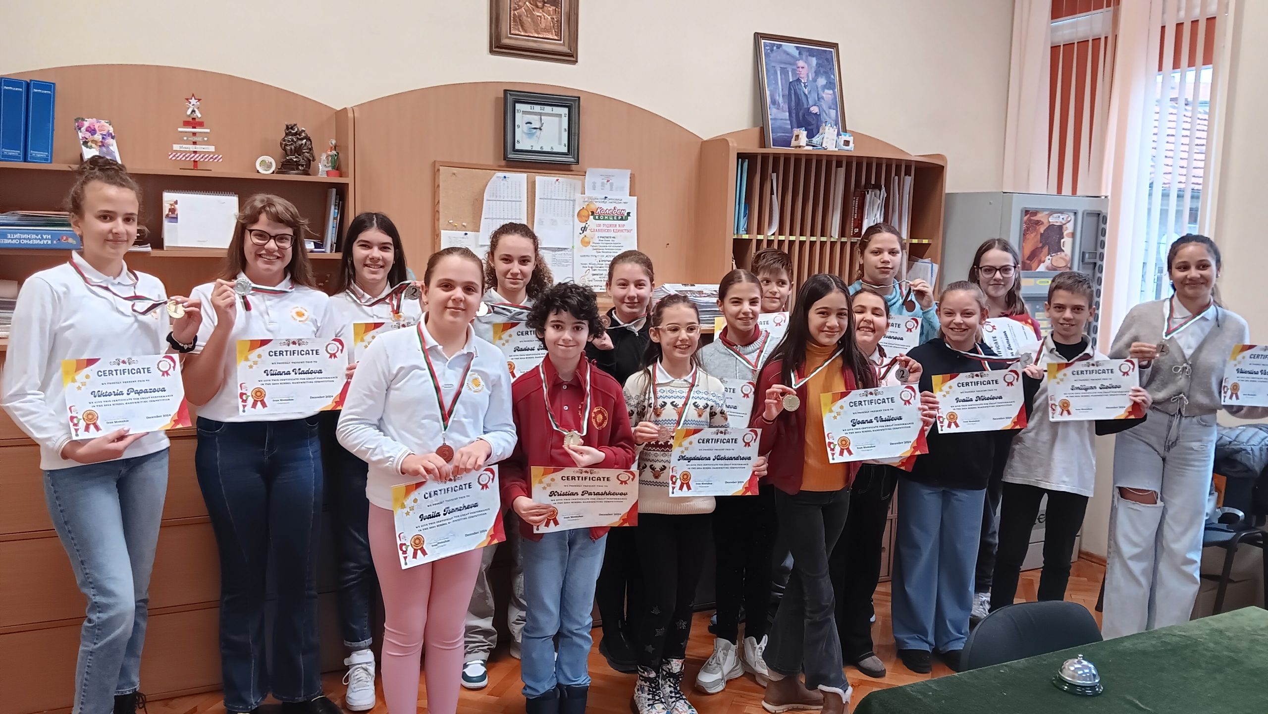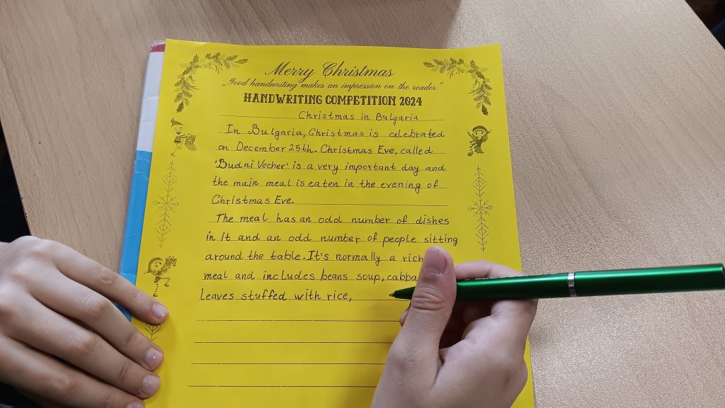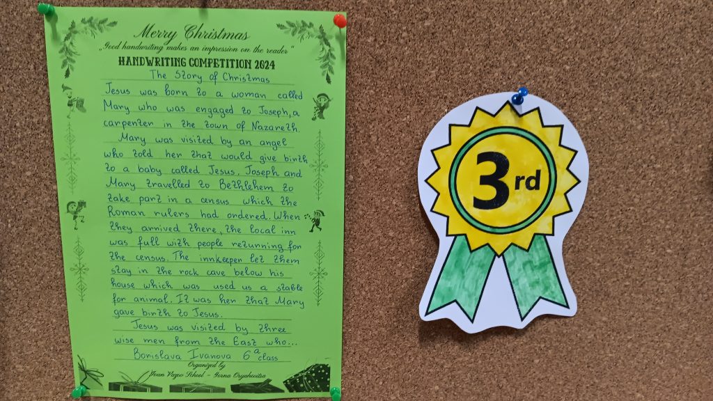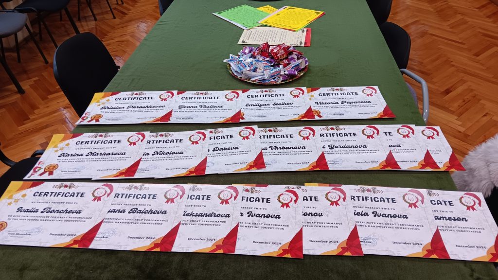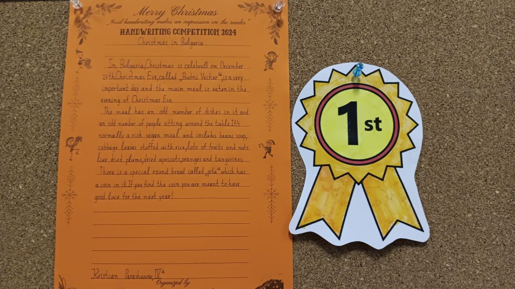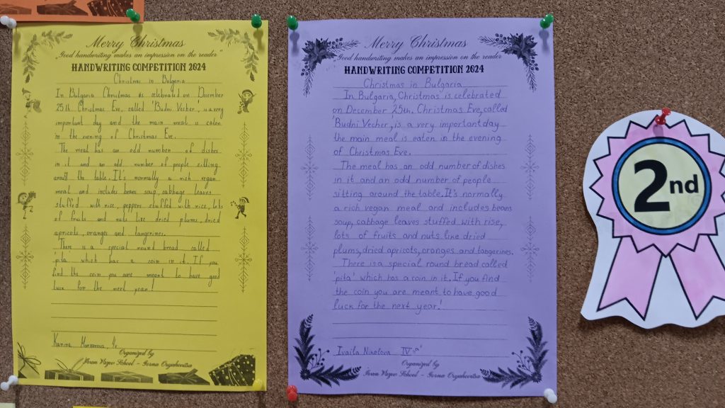 Близо 100 ученика от ОУ „Иван Вазов“ взеха участие в провеждащото се състезание по краснопис на английски език, под мотото „Eлегантният почерк винаги прави впечатление на четящия“. Уникалното състезание се радва на все по-голяв интерес сред учениците и за четвърта поредна година ученици от 4 до 7 клас на показват своите умения за красиво писане на английски език. Участниците трябва да препишат красиво, четливо и вярно откъс от текстове за празнуването на Рождество Христово в България и по света в рамките на един учебен час. Членовете на комисията, Гергана Павлова, Светлана Ненова, Здравка Евтимова и Тодор Енев бяха изключително затруднени в избора на най- прецизен краснописец. С грамоти и медали бяха удостоени най- красиво пишещите на английски език. На първо място се класират: Кристиян Парашкевов – 4а клас, Йоана Василева – 5а клас, Емилиян Стойков – 6в клас и Виктория Папазова – 7а клас. На второ място се учениците Карина Маркарова – 4в, Ивайла Николова – 4а, Валентина Върбанова – 5в, Стелиана Дабева– 5а, Радост Станева – 6в, Никол Йорданова – 7а, Вилиана Владова – 7а. На трето място са Магдалена Александрова – 4в, Ивайла Цончева – 4а, Кристияна Байчева – 5а, Алекс Антонов – 5б, Борислава Иванова – 6а, Лорън Джеймсън – 7в и Даниела Иванова – 7в клас.