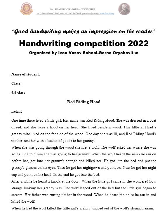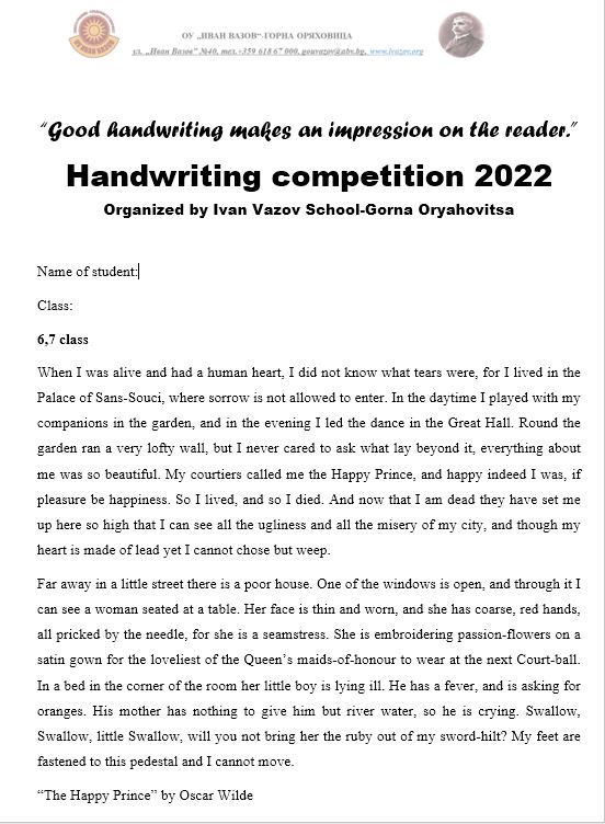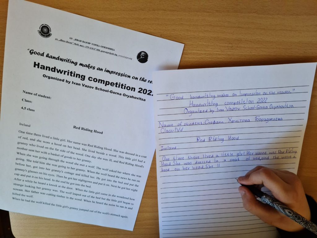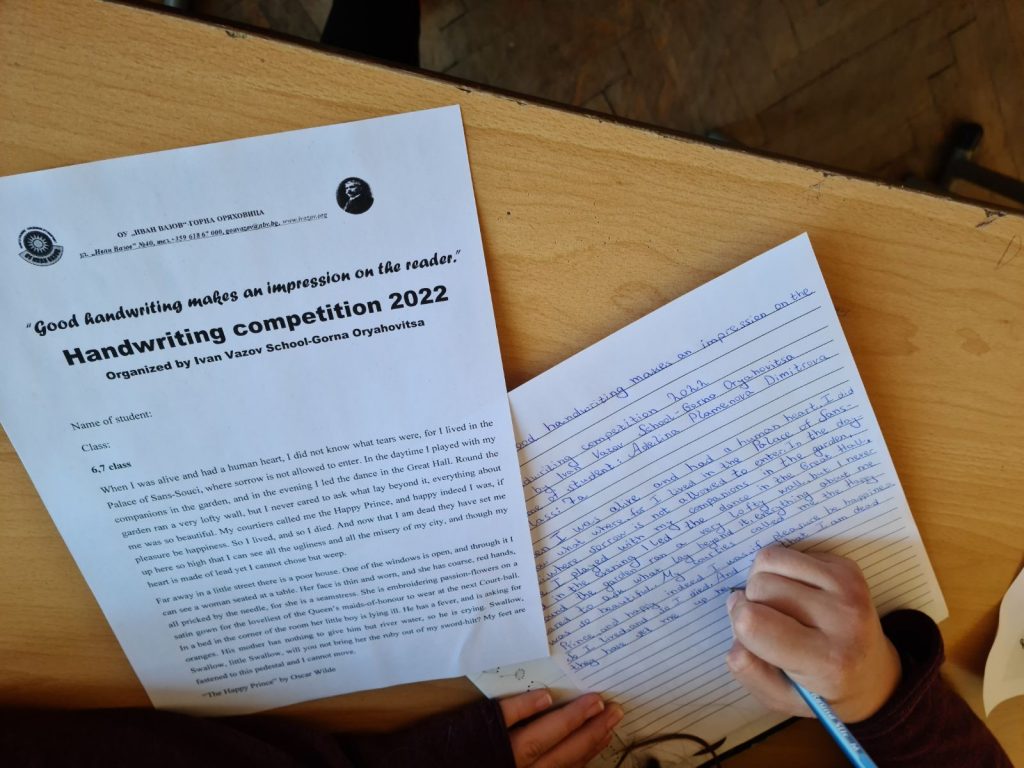 Чистият и красив почерк е изкуство, което всеки може лесно да овладее. Още от малки децата развиват уменията си за красиво и четливо писане в училище. На 19 януари 2022 година ученици от 4 до 7 клас на ОУ „Иван Вазов“ участваха в първото по рода си състезание по краснопис на английски език под мотото „Eлегантният почерк винаги прави впечатление на четящия“. Прилагайки уменията си за красиво писане и знанията си по английски език, участниците трябваше да препишат красиво, четливо и вярно откъс от приказката „Щастливият принц“ от Оскар Уайлд или откъс от ирладска народна приказка в рамките на един учебен час. В състезанието се включиха 50 ученици от 4 до 7 клас. Жури в състав Гергана Павлова, Емилия Къртичева и Светлана Ненова определи победителите в състезанието.