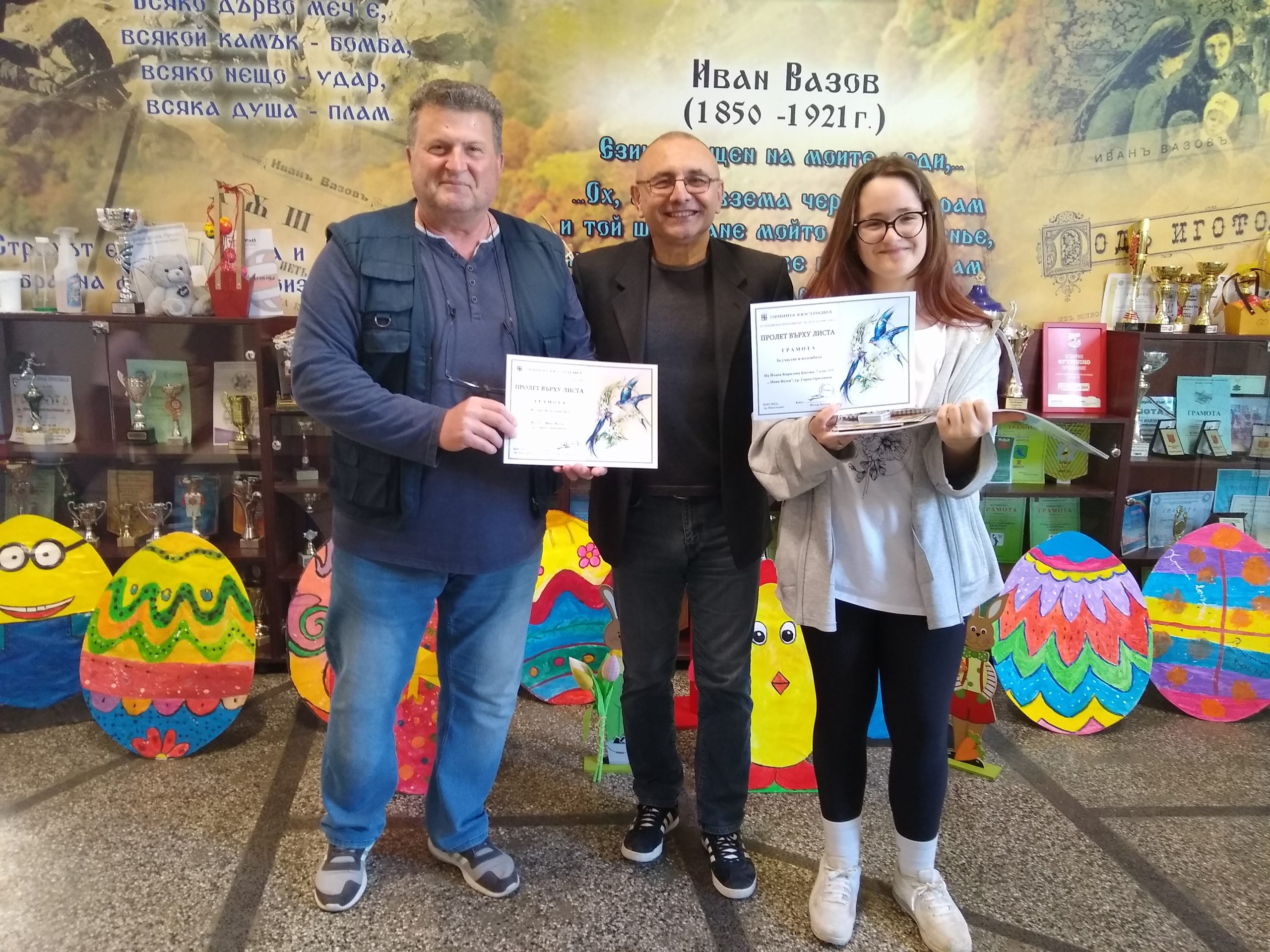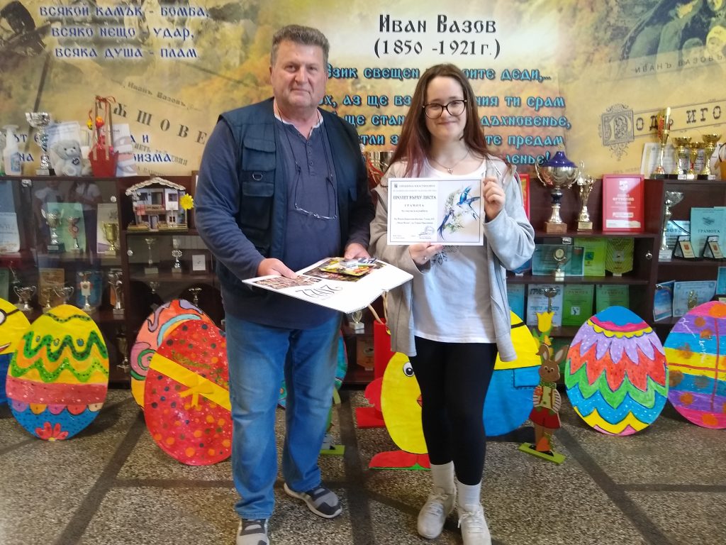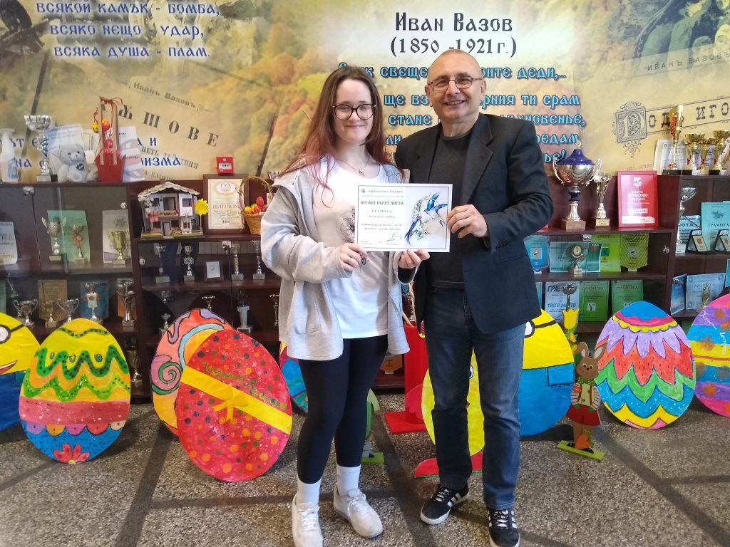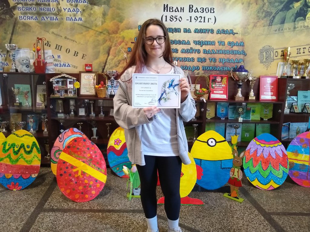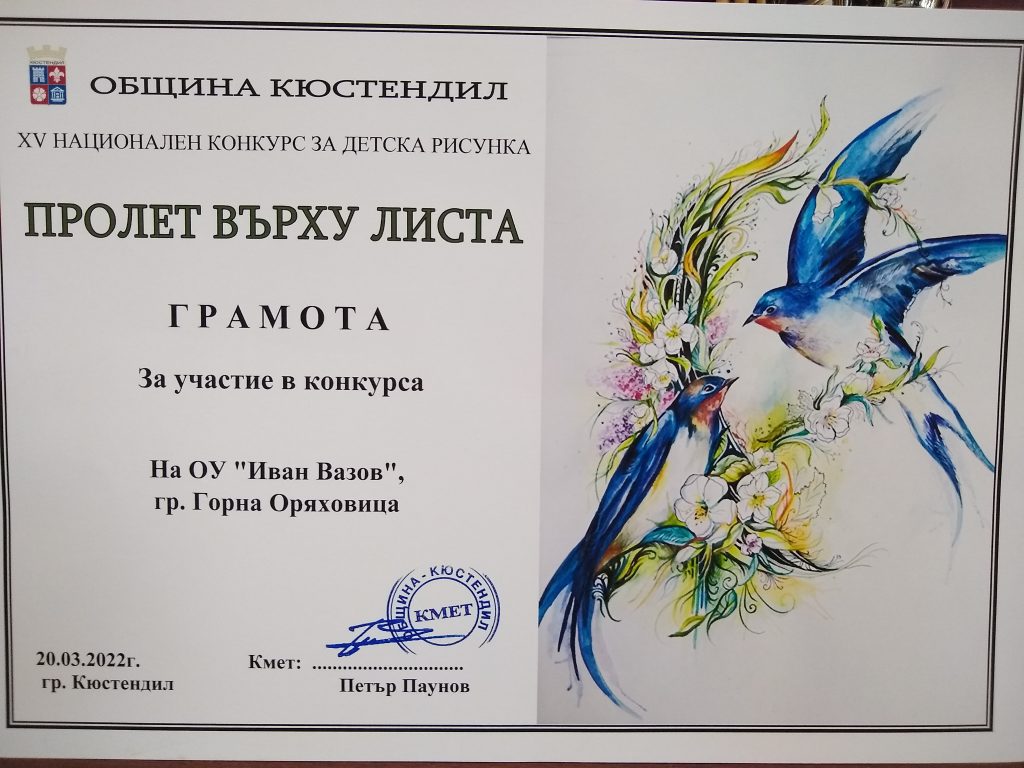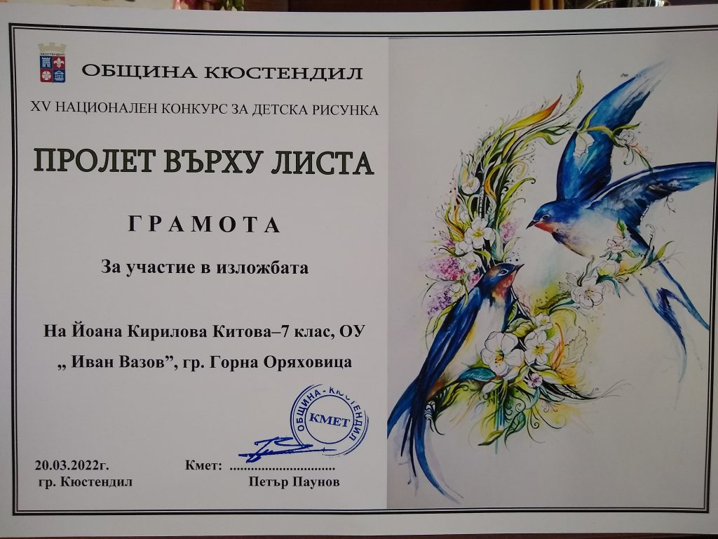 Седмокласничката от ОУ „ Иван Вазов” Йоана Китова се нареди сред призовите места на конкурса  „Пролет върху листа” в гр. Кюстендил.