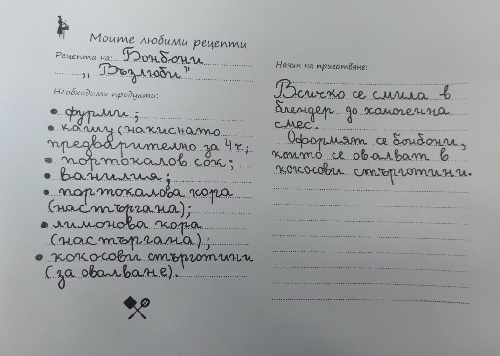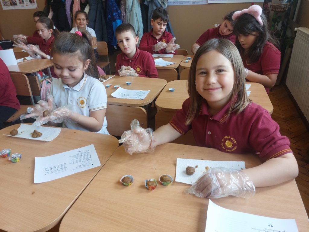 След вдъхновяващата беседа с г-ца Иванова, учениците се включиха в практическа част, като приготвиха здравословни сурови бонбони без захар. Всяко дете получи рецепта за бонбоните и се наслади на прясно изцеден сок от ябълка и портокал. Освен това, учениците бяха предизвикани да напишат своята любима здравословна рецепта. Всички предадени рецепти ще бъдат разгледани от колектива на сдружението, а трите най-добри ще бъдат наградени.
