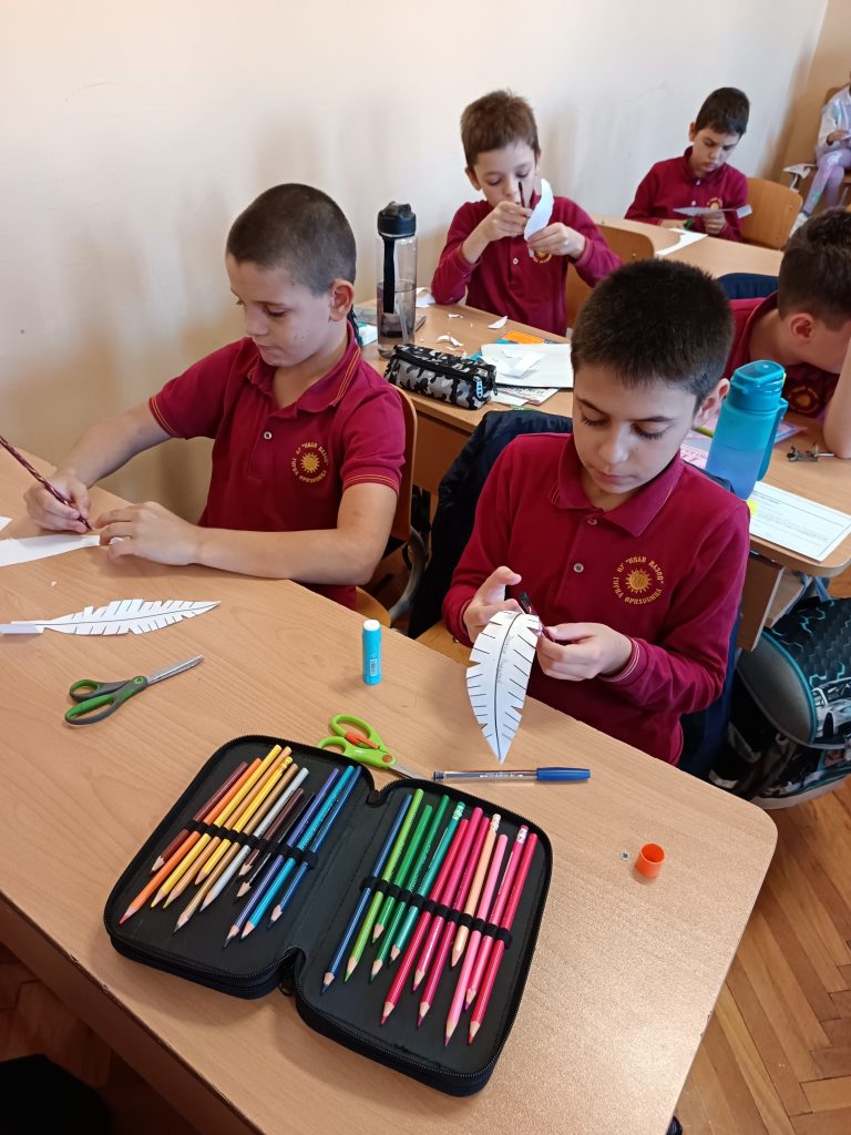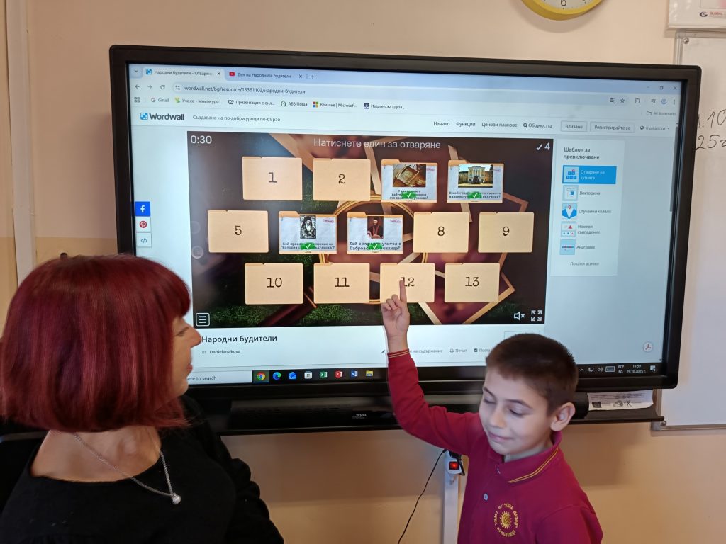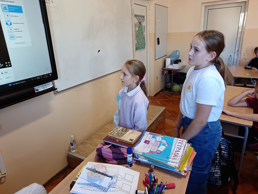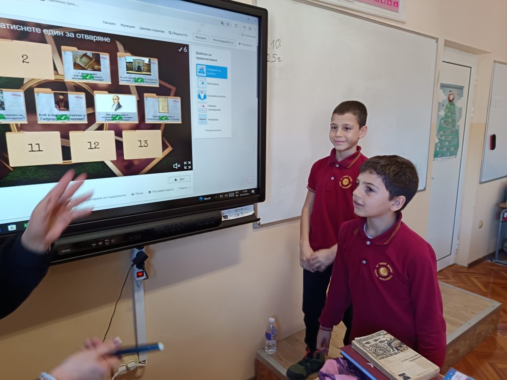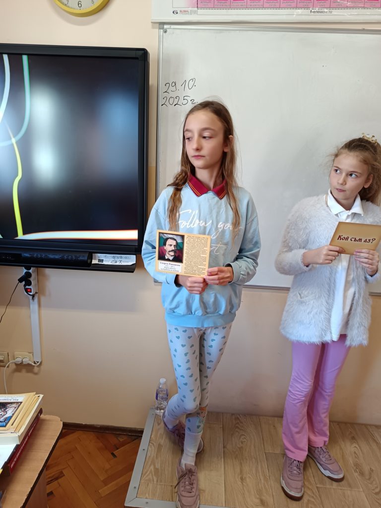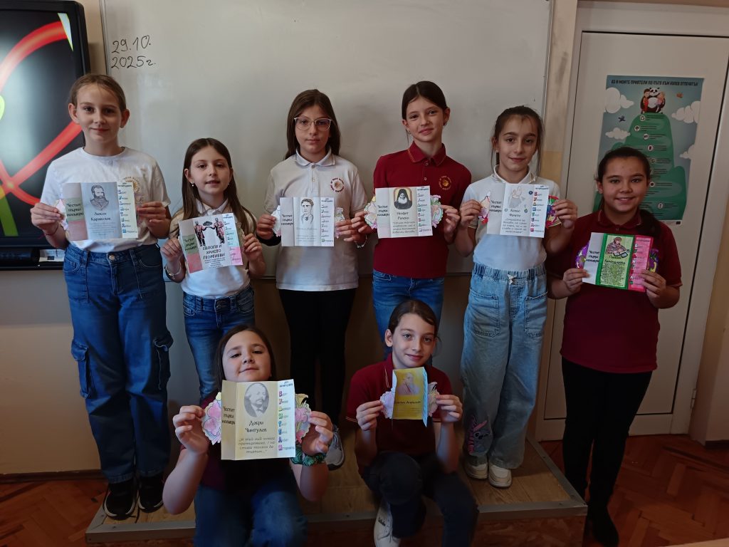 Във връзка с един от най-българските празници – Деня на народните будители на 29.10.2025г. се проведе съвместна инициатива с ученици от IV „а“ и IV„в“ с класни ръководители Стойка Цонева и Светлана Хаджикостова. Събитието се състоя в класната стая на IV „в“ клас, но започна седмица преди това с презентации, посветени на Будителите, заучаване на стихове и песни, посветени на празника .Празникът започна с програма – рецитиране на стихотворения и изпълнения на песни от децата и от двата класа. Симона Бахнева представи стари печатни издания на Паисиевата история, Рибния буквар, Сборник български народни песни, Записките на Захари Стоянов, които предизвикаха голям интерес и учениците с трепет и внимание разгърнаха страниците на тези произведения. След това четвъртокласниците представиха пред приятели си проекти за будителите – постери, обемни конструкции, интересна информация, подготвени предварително с много въображение, усърдие и старание. Настъпи време за интересна интерактивна дейност, за изпълнението на която учениците излизаха на дъската по двойки и в платформата Wordwall свързваха портрет на будител със съответната информация за него. Те показаха умения, знания и взаимно си помагаха. Дойде време за друга игра по двойки „Разпознай тази личност“ . Учениците от всяка участваща група получиха информация за будител, а те трябваше да назовават неговото име. Децата изработиха книгоразделители – перо от картон с името на будителя, който най-много е впечатлил съответния ученик. И тук работата протече в дух на приятелство и взаимопомощ. В края на празничния ден чрез работа в екип, всички си изработиха и картичка за празника. Тържественият час завърши с подаръци, посветени на празника и обща снимка за спомен. Така се пази и предава народността!